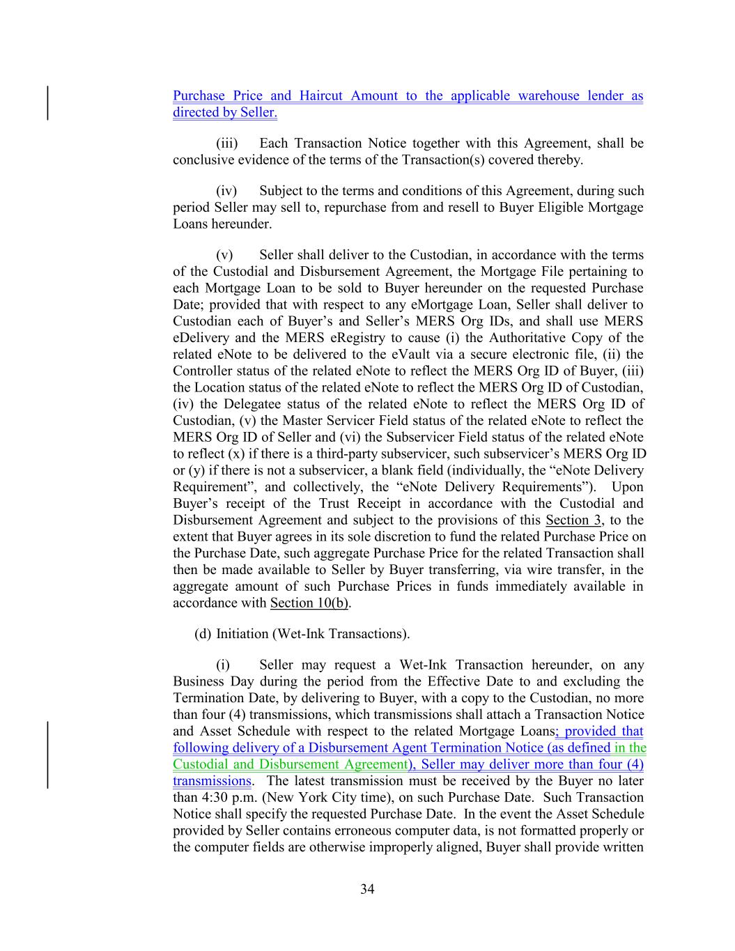 Purchase Price and Haircut Amount to the applicable warehouse lender as directed by Seller. (iii) Each Transaction Notice together with this Agreement, shall be conclusive evidence of the terms of the Transaction(s) covered thereby. (iv) Subject to the terms and conditions of this Agreement, during such period Seller may sell to, repurchase from and resell to Buyer Eligible Mortgage Loans hereunder. (v) Seller shall deliver to the Custodian, in accordance with the terms of the Custodial and Disbursement Agreement, the Mortgage File pertaining to each Mortgage Loan to be sold to Buyer hereunder on the requested Purchase Date; provided that with respect to any eMortgage Loan, Seller shall deliver to Custodian each of Buyer’s and Seller’s MERS Org IDs, and shall use MERS eDelivery and the MERS eRegistry to cause (i) the Authoritative Copy of the related eNote to be delivered to the eVault via a secure electronic file, (ii) the Controller status of the related eNote to reflect the MERS Org ID of Buyer, (iii) the Location status of the related eNote to reflect the MERS Org ID of Custodian, (iv) the Delegatee status of the related eNote to reflect the MERS Org ID of Custodian, (v) the Master Servicer Field status of the related eNote to reflect the MERS Org ID of Seller and (vi) the Subservicer Field status of the related eNote to reflect (x) if there is a third-party subservicer, such subservicer’s MERS Org ID or (y) if there is not a subservicer, a blank field (individually, the “eNote Delivery Requirement”, and collectively, the “eNote Delivery Requirements”). Upon Buyer’s receipt of the Trust Receipt in accordance with the Custodial and Disbursement Agreement and subject to the provisions of this Section 3, to the extent that Buyer agrees in its sole discretion to fund the related Purchase Price on the Purchase Date, such aggregate Purchase Price for the related Transaction shall then be made available to Seller by Buyer transferring, via wire transfer, in the aggregate amount of such Purchase Prices in funds immediately available in accordance with Section 10(b). (d) Initiation (Wet-Ink Transactions). (i) Seller may request a Wet-Ink Transaction hereunder, on any Business Day during the period from the Effective Date to and excluding the Termination Date, by delivering to Buyer, with a copy to the Custodian, no more than four (4) transmissions, which transmissions shall attach a Transaction Notice and Asset Schedule with respect to the related Mortgage Loans; provided that following delivery of a Disbursement Agent Termination Notice (as defined in the Custodial and Disbursement Agreement), Seller may deliver more than four (4) transmissions. The latest transmission must be received by the Buyer no later than 4:30 p.m. (New York City time), on such Purchase Date. Such Transaction Notice shall specify the requested Purchase Date. In the event the Asset Schedule provided by Seller contains erroneous computer data, is not formatted properly or the computer fields are otherwise improperly aligned, Buyer shall provide written 34