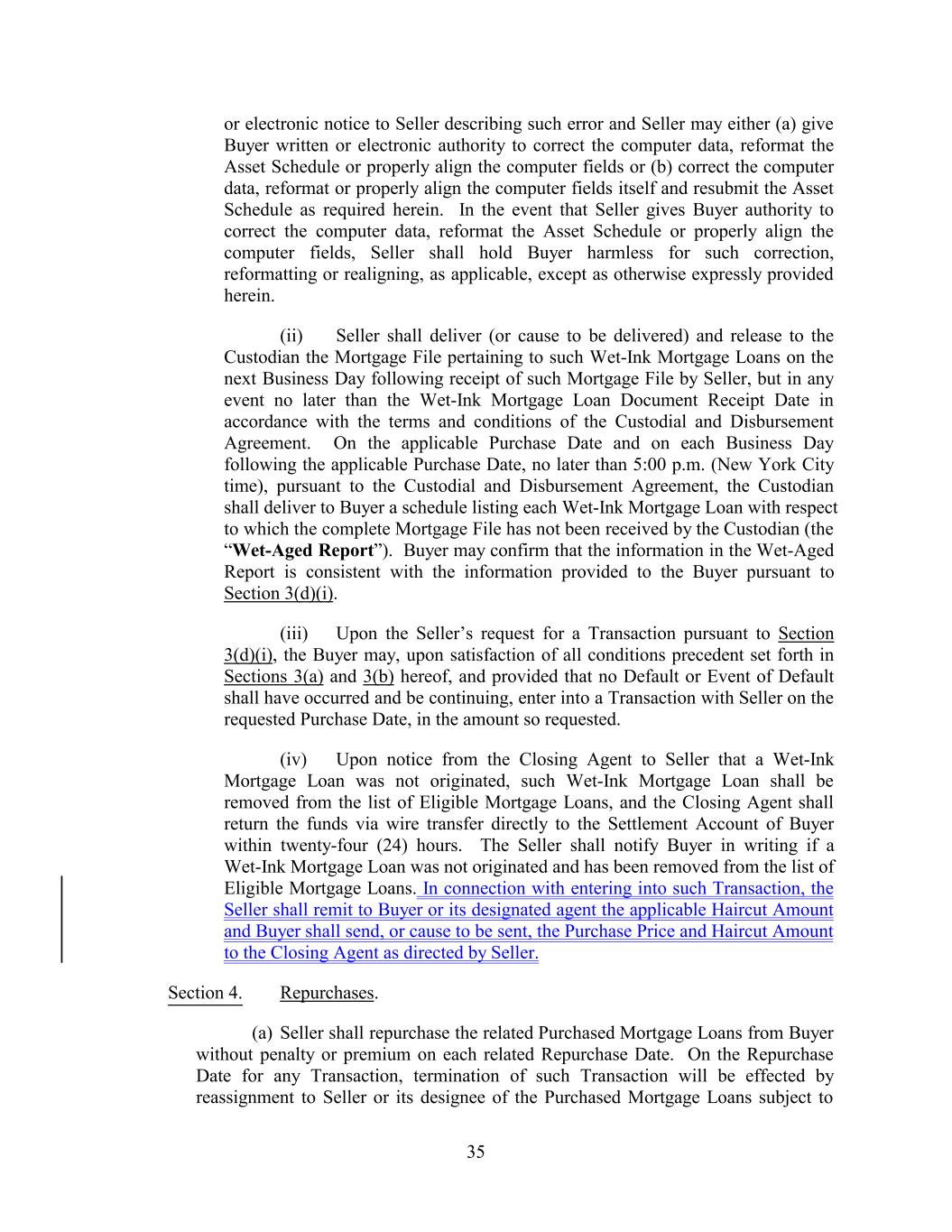 or electronic notice to Seller describing such error and Seller may either (a) give Buyer written or electronic authority to correct the computer data, reformat the Asset Schedule or properly align the computer fields or (b) correct the computer data, reformat or properly align the computer fields itself and resubmit the Asset Schedule as required herein. In the event that Seller gives Buyer authority to correct the computer data, reformat the Asset Schedule or properly align the computer fields, Seller shall hold Buyer harmless for such correction, reformatting or realigning, as applicable, except as otherwise expressly provided herein. (ii) Seller shall deliver (or cause to be delivered) and release to the Custodian the Mortgage File pertaining to such Wet-Ink Mortgage Loans on the next Business Day following receipt of such Mortgage File by Seller, but in any event no later than the Wet-Ink Mortgage Loan Document Receipt Date in accordance with the terms and conditions of the Custodial and Disbursement Agreement. On the applicable Purchase Date and on each Business Day following the applicable Purchase Date, no later than 5:00 p.m. (New York City time), pursuant to the Custodial and Disbursement Agreement, the Custodian shall deliver to Buyer a schedule listing each Wet-Ink Mortgage Loan with respect to which the complete Mortgage File has not been received by the Custodian (the “Wet-Aged Report”). Buyer may confirm that the information in the Wet-Aged Report is consistent with the information provided to the Buyer pursuant to Section 3(d)(i). (iii) Upon the Seller’s request for a Transaction pursuant to Section 3(d)(i), the Buyer may, upon satisfaction of all conditions precedent set forth in Sections 3(a) and 3(b) hereof, and provided that no Default or Event of Default shall have occurred and be continuing, enter into a Transaction with Seller on the requested Purchase Date, in the amount so requested. (iv) Upon notice from the Closing Agent to Seller that a Wet-Ink Mortgage Loan was not originated, such Wet-Ink Mortgage Loan shall be removed from the list of Eligible Mortgage Loans, and the Closing Agent shall return the funds via wire transfer directly to the Settlement Account of Buyer within twenty-four (24) hours. The Seller shall notify Buyer in writing if a Wet-Ink Mortgage Loan was not originated and has been removed from the list of Eligible Mortgage Loans. In connection with entering into such Transaction, the Seller shall remit to Buyer or its designated agent the applicable Haircut Amount and Buyer shall send, or cause to be sent, the Purchase Price and Haircut Amount to the Closing Agent as directed by Seller. Section 4. Repurchases. (a) Seller shall repurchase the related Purchased Mortgage Loans from Buyer without penalty or premium on each related Repurchase Date. On the Repurchase Date for any Transaction, termination of such Transaction will be effected by reassignment to Seller or its designee of the Purchased Mortgage Loans subject to 35
