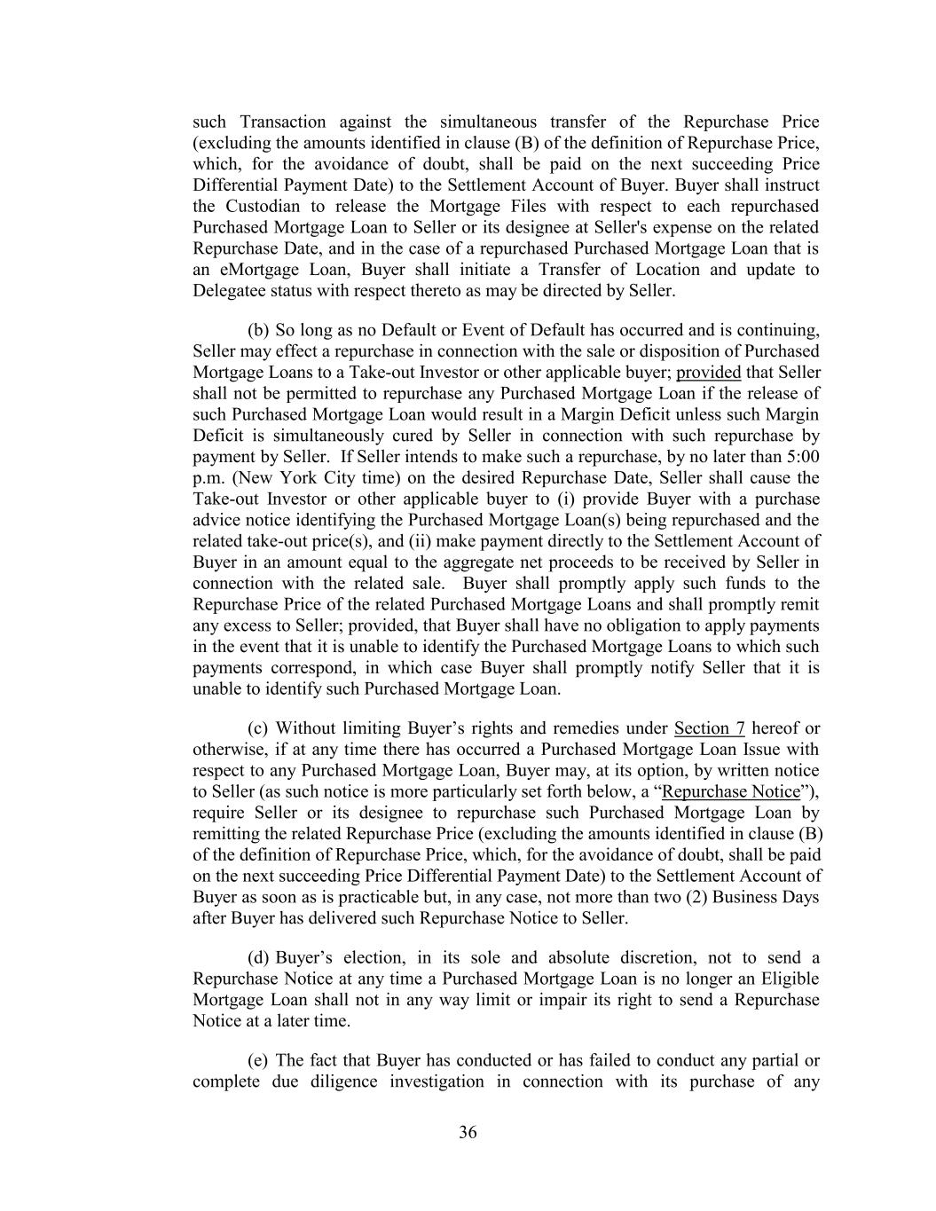 such Transaction against the simultaneous transfer of the Repurchase Price (excluding the amounts identified in clause (B) of the definition of Repurchase Price, which, for the avoidance of doubt, shall be paid on the next succeeding Price Differential Payment Date) to the Settlement Account of Buyer. Buyer shall instruct the Custodian to release the Mortgage Files with respect to each repurchased Purchased Mortgage Loan to Seller or its designee at Seller's expense on the related Repurchase Date, and in the case of a repurchased Purchased Mortgage Loan that is an eMortgage Loan, Buyer shall initiate a Transfer of Location and update to Delegatee status with respect thereto as may be directed by Seller. (b) So long as no Default or Event of Default has occurred and is continuing, Seller may effect a repurchase in connection with the sale or disposition of Purchased Mortgage Loans to a Take-out Investor or other applicable buyer; provided that Seller shall not be permitted to repurchase any Purchased Mortgage Loan if the release of such Purchased Mortgage Loan would result in a Margin Deficit unless such Margin Deficit is simultaneously cured by Seller in connection with such repurchase by payment by Seller. If Seller intends to make such a repurchase, by no later than 5:00 p.m. (New York City time) on the desired Repurchase Date, Seller shall cause the Take-out Investor or other applicable buyer to (i) provide Buyer with a purchase advice notice identifying the Purchased Mortgage Loan(s) being repurchased and the related take-out price(s), and (ii) make payment directly to the Settlement Account of Buyer in an amount equal to the aggregate net proceeds to be received by Seller in connection with the related sale. Buyer shall promptly apply such funds to the Repurchase Price of the related Purchased Mortgage Loans and shall promptly remit any excess to Seller; provided, that Buyer shall have no obligation to apply payments in the event that it is unable to identify the Purchased Mortgage Loans to which such payments correspond, in which case Buyer shall promptly notify Seller that it is unable to identify such Purchased Mortgage Loan. (c) Without limiting Buyer’s rights and remedies under Section 7 hereof or otherwise, if at any time there has occurred a Purchased Mortgage Loan Issue with respect to any Purchased Mortgage Loan, Buyer may, at its option, by written notice to Seller (as such notice is more particularly set forth below, a “Repurchase Notice”), require Seller or its designee to repurchase such Purchased Mortgage Loan by remitting the related Repurchase Price (excluding the amounts identified in clause (B) of the definition of Repurchase Price, which, for the avoidance of doubt, shall be paid on the next succeeding Price Differential Payment Date) to the Settlement Account of Buyer as soon as is practicable but, in any case, not more than two (2) Business Days after Buyer has delivered such Repurchase Notice to Seller. (d) Buyer’s election, in its sole and absolute discretion, not to send a Repurchase Notice at any time a Purchased Mortgage Loan is no longer an Eligible Mortgage Loan shall not in any way limit or impair its right to send a Repurchase Notice at a later time. (e) The fact that Buyer has conducted or has failed to conduct any partial or complete due diligence investigation in connection with its purchase of any 36