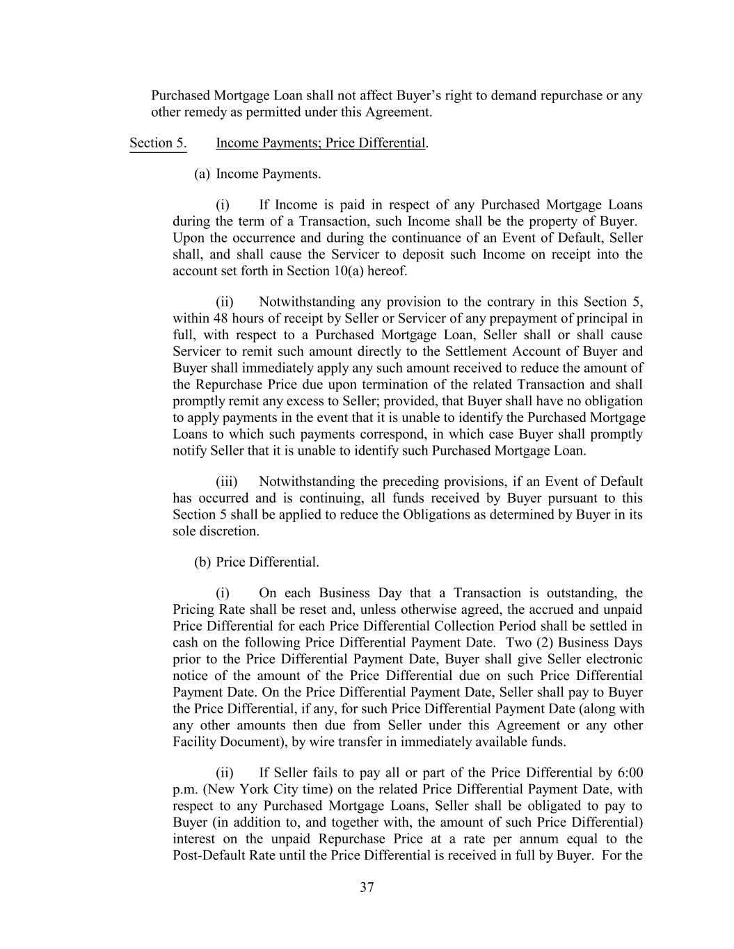 Purchased Mortgage Loan shall not affect Buyer’s right to demand repurchase or any other remedy as permitted under this Agreement. Section 5. Income Payments; Price Differential. (a) Income Payments. (i) If Income is paid in respect of any Purchased Mortgage Loans during the term of a Transaction, such Income shall be the property of Buyer. Upon the occurrence and during the continuance of an Event of Default, Seller shall, and shall cause the Servicer to deposit such Income on receipt into the account set forth in Section 10(a) hereof. (ii) Notwithstanding any provision to the contrary in this Section 5, within 48 hours of receipt by Seller or Servicer of any prepayment of principal in full, with respect to a Purchased Mortgage Loan, Seller shall or shall cause Servicer to remit such amount directly to the Settlement Account of Buyer and Buyer shall immediately apply any such amount received to reduce the amount of the Repurchase Price due upon termination of the related Transaction and shall promptly remit any excess to Seller; provided, that Buyer shall have no obligation to apply payments in the event that it is unable to identify the Purchased Mortgage Loans to which such payments correspond, in which case Buyer shall promptly notify Seller that it is unable to identify such Purchased Mortgage Loan. (iii) Notwithstanding the preceding provisions, if an Event of Default has occurred and is continuing, all funds received by Buyer pursuant to this Section 5 shall be applied to reduce the Obligations as determined by Buyer in its sole discretion. (b) Price Differential. (i) On each Business Day that a Transaction is outstanding, the Pricing Rate shall be reset and, unless otherwise agreed, the accrued and unpaid Price Differential for each Price Differential Collection Period shall be settled in cash on the following Price Differential Payment Date. Two (2) Business Days prior to the Price Differential Payment Date, Buyer shall give Seller electronic notice of the amount of the Price Differential due on such Price Differential Payment Date. On the Price Differential Payment Date, Seller shall pay to Buyer the Price Differential, if any, for such Price Differential Payment Date (along with any other amounts then due from Seller under this Agreement or any other Facility Document), by wire transfer in immediately available funds. (ii) If Seller fails to pay all or part of the Price Differential by 6:00 p.m. (New York City time) on the related Price Differential Payment Date, with respect to any Purchased Mortgage Loans, Seller shall be obligated to pay to Buyer (in addition to, and together with, the amount of such Price Differential) interest on the unpaid Repurchase Price at a rate per annum equal to the Post-Default Rate until the Price Differential is received in full by Buyer. For the 37