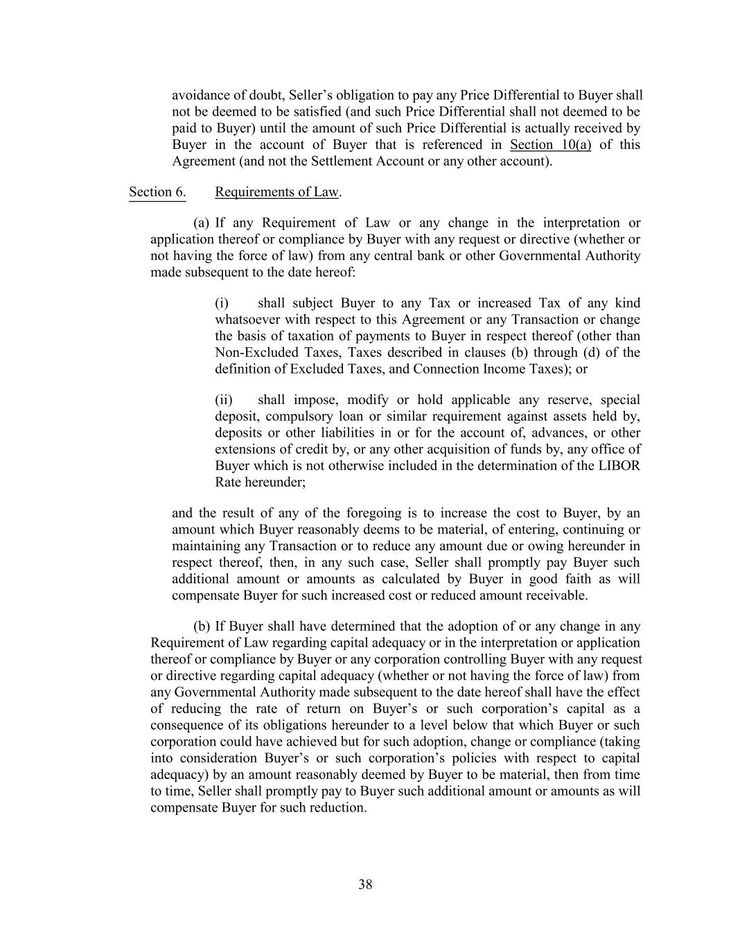 avoidance of doubt, Seller’s obligation to pay any Price Differential to Buyer shall not be deemed to be satisfied (and such Price Differential shall not deemed to be paid to Buyer) until the amount of such Price Differential is actually received by Buyer in the account of Buyer that is referenced in Section 10(a) of this Agreement (and not the Settlement Account or any other account). Section 6. Requirements of Law. (a) If any Requirement of Law or any change in the interpretation or application thereof or compliance by Buyer with any request or directive (whether or not having the force of law) from any central bank or other Governmental Authority made subsequent to the date hereof: (i) shall subject Buyer to any Tax or increased Tax of any kind whatsoever with respect to this Agreement or any Transaction or change the basis of taxation of payments to Buyer in respect thereof (other than Non-Excluded Taxes, Taxes described in clauses (b) through (d) of the definition of Excluded Taxes, and Connection Income Taxes); or (ii) shall impose, modify or hold applicable any reserve, special deposit, compulsory loan or similar requirement against assets held by, deposits or other liabilities in or for the account of, advances, or other extensions of credit by, or any other acquisition of funds by, any office of Buyer which is not otherwise included in the determination of the LIBOR Rate hereunder; and the result of any of the foregoing is to increase the cost to Buyer, by an amount which Buyer reasonably deems to be material, of entering, continuing or maintaining any Transaction or to reduce any amount due or owing hereunder in respect thereof, then, in any such case, Seller shall promptly pay Buyer such additional amount or amounts as calculated by Buyer in good faith as will compensate Buyer for such increased cost or reduced amount receivable. (b) If Buyer shall have determined that the adoption of or any change in any Requirement of Law regarding capital adequacy or in the interpretation or application thereof or compliance by Buyer or any corporation controlling Buyer with any request or directive regarding capital adequacy (whether or not having the force of law) from any Governmental Authority made subsequent to the date hereof shall have the effect of reducing the rate of return on Buyer’s or such corporation’s capital as a consequence of its obligations hereunder to a level below that which Buyer or such corporation could have achieved but for such adoption, change or compliance (taking into consideration Buyer’s or such corporation’s policies with respect to capital adequacy) by an amount reasonably deemed by Buyer to be material, then from time to time, Seller shall promptly pay to Buyer such additional amount or amounts as will compensate Buyer for such reduction. 38