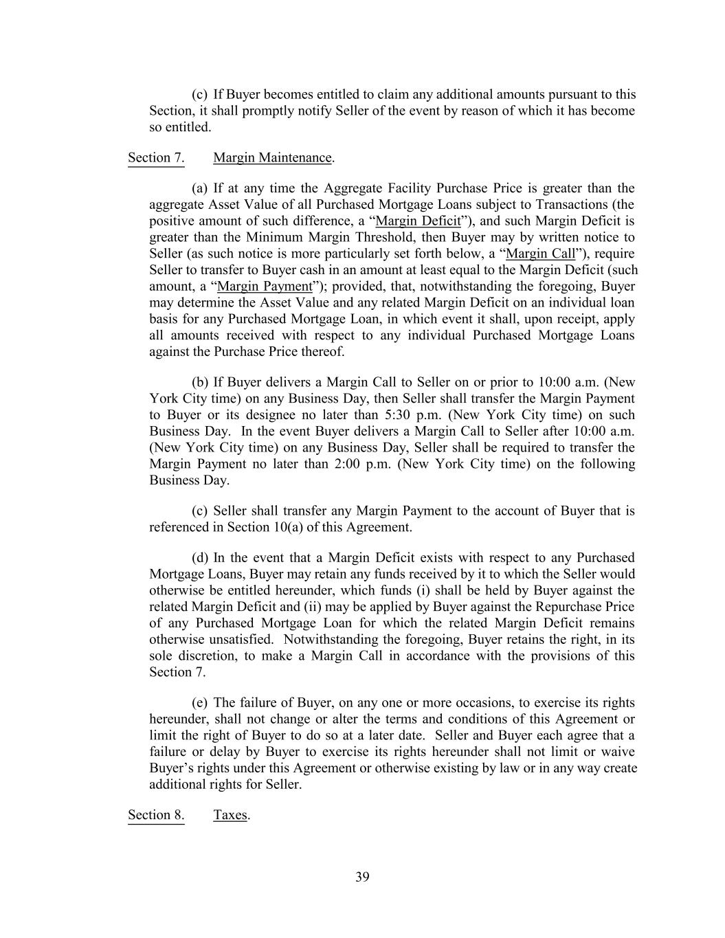 (c) If Buyer becomes entitled to claim any additional amounts pursuant to this Section, it shall promptly notify Seller of the event by reason of which it has become so entitled. Section 7. Margin Maintenance. (a) If at any time the Aggregate Facility Purchase Price is greater than the aggregate Asset Value of all Purchased Mortgage Loans subject to Transactions (the positive amount of such difference, a “Margin Deficit”), and such Margin Deficit is greater than the Minimum Margin Threshold, then Buyer may by written notice to Seller (as such notice is more particularly set forth below, a “Margin Call”), require Seller to transfer to Buyer cash in an amount at least equal to the Margin Deficit (such amount, a “Margin Payment”); provided, that, notwithstanding the foregoing, Buyer may determine the Asset Value and any related Margin Deficit on an individual loan basis for any Purchased Mortgage Loan, in which event it shall, upon receipt, apply all amounts received with respect to any individual Purchased Mortgage Loans against the Purchase Price thereof. (b) If Buyer delivers a Margin Call to Seller on or prior to 10:00 a.m. (New York City time) on any Business Day, then Seller shall transfer the Margin Payment to Buyer or its designee no later than 5:30 p.m. (New York City time) on such Business Day. In the event Buyer delivers a Margin Call to Seller after 10:00 a.m. (New York City time) on any Business Day, Seller shall be required to transfer the Margin Payment no later than 2:00 p.m. (New York City time) on the following Business Day. (c) Seller shall transfer any Margin Payment to the account of Buyer that is referenced in Section 10(a) of this Agreement. (d) In the event that a Margin Deficit exists with respect to any Purchased Mortgage Loans, Buyer may retain any funds received by it to which the Seller would otherwise be entitled hereunder, which funds (i) shall be held by Buyer against the related Margin Deficit and (ii) may be applied by Buyer against the Repurchase Price of any Purchased Mortgage Loan for which the related Margin Deficit remains otherwise unsatisfied. Notwithstanding the foregoing, Buyer retains the right, in its sole discretion, to make a Margin Call in accordance with the provisions of this Section 7. (e) The failure of Buyer, on any one or more occasions, to exercise its rights hereunder, shall not change or alter the terms and conditions of this Agreement or limit the right of Buyer to do so at a later date. Seller and Buyer each agree that a failure or delay by Buyer to exercise its rights hereunder shall not limit or waive Buyer’s rights under this Agreement or otherwise existing by law or in any way create additional rights for Seller. Section 8. Taxes. 39