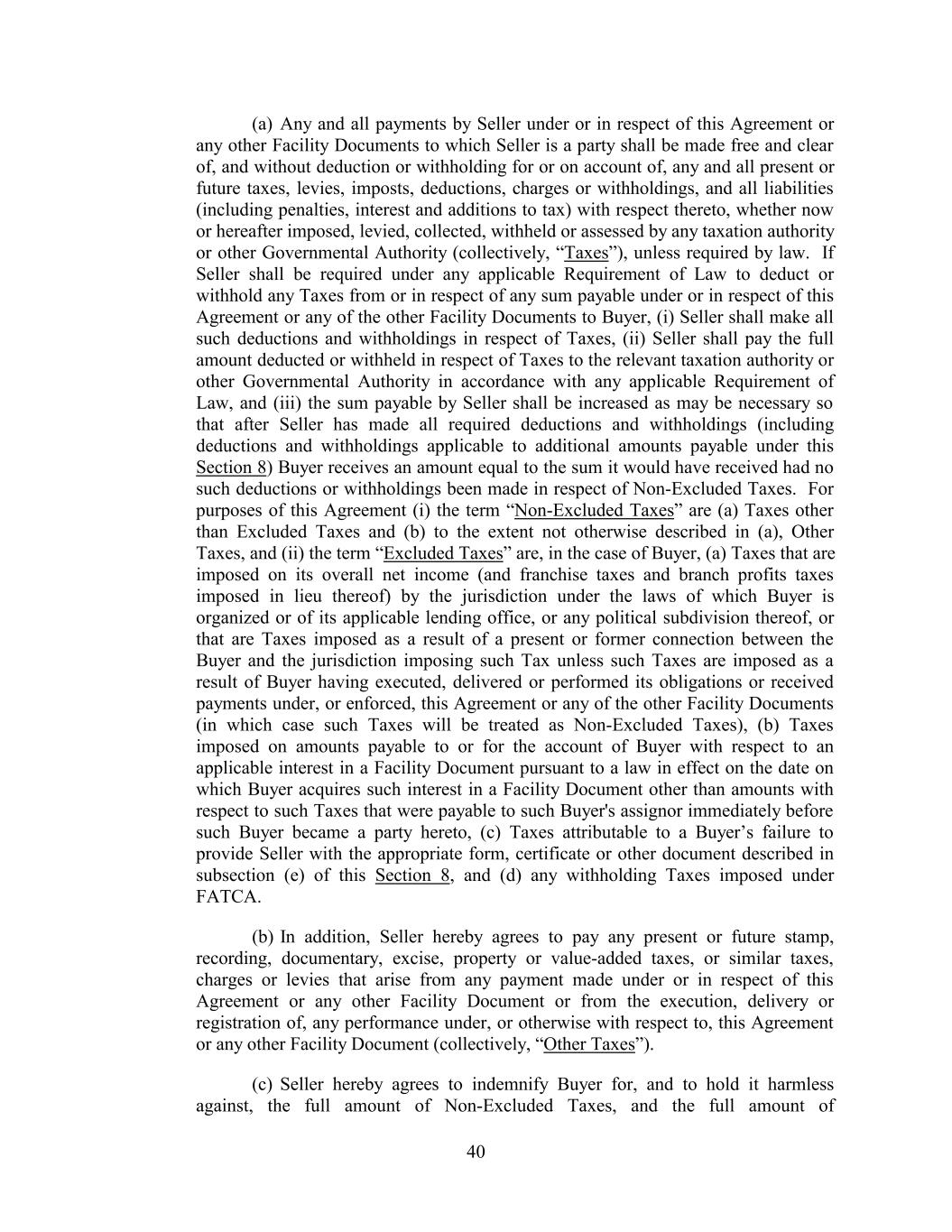 (a) Any and all payments by Seller under or in respect of this Agreement or any other Facility Documents to which Seller is a party shall be made free and clear of, and without deduction or withholding for or on account of, any and all present or future taxes, levies, imposts, deductions, charges or withholdings, and all liabilities (including penalties, interest and additions to tax) with respect thereto, whether now or hereafter imposed, levied, collected, withheld or assessed by any taxation authority or other Governmental Authority (collectively, “Taxes”), unless required by law. If Seller shall be required under any applicable Requirement of Law to deduct or withhold any Taxes from or in respect of any sum payable under or in respect of this Agreement or any of the other Facility Documents to Buyer, (i) Seller shall make all such deductions and withholdings in respect of Taxes, (ii) Seller shall pay the full amount deducted or withheld in respect of Taxes to the relevant taxation authority or other Governmental Authority in accordance with any applicable Requirement of Law, and (iii) the sum payable by Seller shall be increased as may be necessary so that after Seller has made all required deductions and withholdings (including deductions and withholdings applicable to additional amounts payable under this Section 8) Buyer receives an amount equal to the sum it would have received had no such deductions or withholdings been made in respect of Non-Excluded Taxes. For purposes of this Agreement (i) the term “Non-Excluded Taxes” are (a) Taxes other than Excluded Taxes and (b) to the extent not otherwise described in (a), Other Taxes, and (ii) the term “Excluded Taxes” are, in the case of Buyer, (a) Taxes that are imposed on its overall net income (and franchise taxes and branch profits taxes imposed in lieu thereof) by the jurisdiction under the laws of which Buyer is organized or of its applicable lending office, or any political subdivision thereof, or that are Taxes imposed as a result of a present or former connection between the Buyer and the jurisdiction imposing such Tax unless such Taxes are imposed as a result of Buyer having executed, delivered or performed its obligations or received payments under, or enforced, this Agreement or any of the other Facility Documents (in which case such Taxes will be treated as Non-Excluded Taxes), (b) Taxes imposed on amounts payable to or for the account of Buyer with respect to an applicable interest in a Facility Document pursuant to a law in effect on the date on which Buyer acquires such interest in a Facility Document other than amounts with respect to such Taxes that were payable to such Buyer's assignor immediately before such Buyer became a party hereto, (c) Taxes attributable to a Buyer’s failure to provide Seller with the appropriate form, certificate or other document described in subsection (e) of this Section 8, and (d) any withholding Taxes imposed under FATCA. (b) In addition, Seller hereby agrees to pay any present or future stamp, recording, documentary, excise, property or value-added taxes, or similar taxes, charges or levies that arise from any payment made under or in respect of this Agreement or any other Facility Document or from the execution, delivery or registration of, any performance under, or otherwise with respect to, this Agreement or any other Facility Document (collectively, “Other Taxes”). (c) Seller hereby agrees to indemnify Buyer for, and to hold it harmless against, the full amount of Non-Excluded Taxes, and the full amount of 40