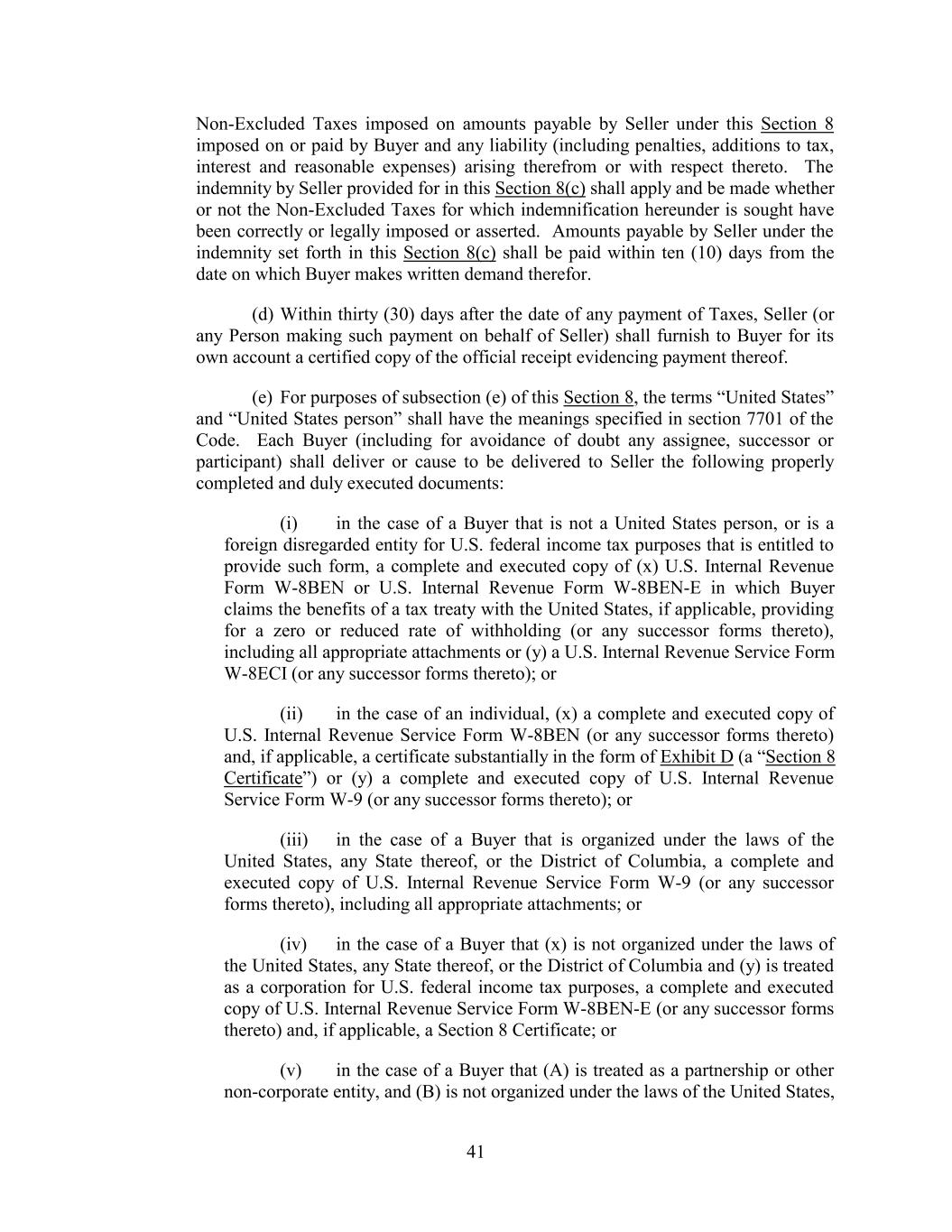 Non-Excluded Taxes imposed on amounts payable by Seller under this Section 8 imposed on or paid by Buyer and any liability (including penalties, additions to tax, interest and reasonable expenses) arising therefrom or with respect thereto. The indemnity by Seller provided for in this Section 8(c) shall apply and be made whether or not the Non-Excluded Taxes for which indemnification hereunder is sought have been correctly or legally imposed or asserted. Amounts payable by Seller under the indemnity set forth in this Section 8(c) shall be paid within ten (10) days from the date on which Buyer makes written demand therefor. (d) Within thirty (30) days after the date of any payment of Taxes, Seller (or any Person making such payment on behalf of Seller) shall furnish to Buyer for its own account a certified copy of the official receipt evidencing payment thereof. (e) For purposes of subsection (e) of this Section 8, the terms “United States” and “United States person” shall have the meanings specified in section 7701 of the Code. Each Buyer (including for avoidance of doubt any assignee, successor or participant) shall deliver or cause to be delivered to Seller the following properly completed and duly executed documents: (i) in the case of a Buyer that is not a United States person, or is a foreign disregarded entity for U.S. federal income tax purposes that is entitled to provide such form, a complete and executed copy of (x) U.S. Internal Revenue Form W-8BEN or U.S. Internal Revenue Form W-8BEN-E in which Buyer claims the benefits of a tax treaty with the United States, if applicable, providing for a zero or reduced rate of withholding (or any successor forms thereto), including all appropriate attachments or (y) a U.S. Internal Revenue Service Form W-8ECI (or any successor forms thereto); or (ii) in the case of an individual, (x) a complete and executed copy of U.S. Internal Revenue Service Form W-8BEN (or any successor forms thereto) and, if applicable, a certificate substantially in the form of Exhibit D (a “Section 8 Certificate”) or (y) a complete and executed copy of U.S. Internal Revenue Service Form W-9 (or any successor forms thereto); or (iii) in the case of a Buyer that is organized under the laws of the United States, any State thereof, or the District of Columbia, a complete and executed copy of U.S. Internal Revenue Service Form W-9 (or any successor forms thereto), including all appropriate attachments; or (iv) in the case of a Buyer that (x) is not organized under the laws of the United States, any State thereof, or the District of Columbia and (y) is treated as a corporation for U.S. federal income tax purposes, a complete and executed copy of U.S. Internal Revenue Service Form W-8BEN-E (or any successor forms thereto) and, if applicable, a Section 8 Certificate; or (v) in the case of a Buyer that (A) is treated as a partnership or other non-corporate entity, and (B) is not organized under the laws of the United States, 41