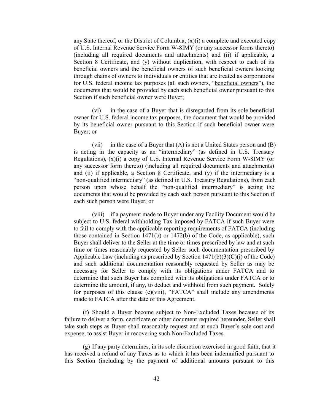 any State thereof, or the District of Columbia, (x)(i) a complete and executed copy of U.S. Internal Revenue Service Form W-8IMY (or any successor forms thereto) (including all required documents and attachments) and (ii) if applicable, a Section 8 Certificate, and (y) without duplication, with respect to each of its beneficial owners and the beneficial owners of such beneficial owners looking through chains of owners to individuals or entities that are treated as corporations for U.S. federal income tax purposes (all such owners, “beneficial owners”), the documents that would be provided by each such beneficial owner pursuant to this Section if such beneficial owner were Buyer; (vi) in the case of a Buyer that is disregarded from its sole beneficial owner for U.S. federal income tax purposes, the document that would be provided by its beneficial owner pursuant to this Section if such beneficial owner were Buyer; or (vii) in the case of a Buyer that (A) is not a United States person and (B) is acting in the capacity as an “intermediary” (as defined in U.S. Treasury Regulations), (x)(i) a copy of U.S. Internal Revenue Service Form W-8IMY (or any successor form thereto) (including all required documents and attachments) and (ii) if applicable, a Section 8 Certificate, and (y) if the intermediary is a “non-qualified intermediary” (as defined in U.S. Treasury Regulations), from each person upon whose behalf the “non-qualified intermediary” is acting the documents that would be provided by each such person pursuant to this Section if each such person were Buyer; or (viii) if a payment made to Buyer under any Facility Document would be subject to U.S. federal withholding Tax imposed by FATCA if such Buyer were to fail to comply with the applicable reporting requirements of FATCA (including those contained in Section 1471(b) or 1472(b) of the Code, as applicable), such Buyer shall deliver to the Seller at the time or times prescribed by law and at such time or times reasonably requested by Seller such documentation prescribed by Applicable Law (including as prescribed by Section 1471(b)(3)(C)(i) of the Code) and such additional documentation reasonably requested by Seller as may be necessary for Seller to comply with its obligations under FATCA and to determine that such Buyer has complied with its obligations under FATCA or to determine the amount, if any, to deduct and withhold from such payment. Solely for purposes of this clause (e)(viii), “FATCA” shall include any amendments made to FATCA after the date of this Agreement. (f) Should a Buyer become subject to Non-Excluded Taxes because of its failure to deliver a form, certificate or other document required hereunder, Seller shall take such steps as Buyer shall reasonably request and at such Buyer’s sole cost and expense, to assist Buyer in recovering such Non-Excluded Taxes. (g) If any party determines, in its sole discretion exercised in good faith, that it has received a refund of any Taxes as to which it has been indemnified pursuant to this Section (including by the payment of additional amounts pursuant to this 42