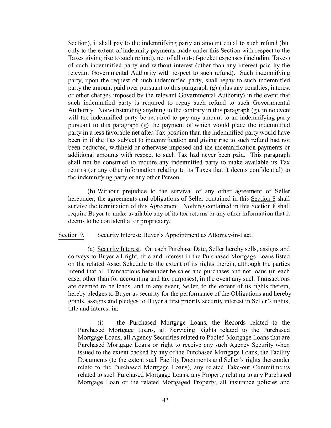Section), it shall pay to the indemnifying party an amount equal to such refund (but only to the extent of indemnity payments made under this Section with respect to the Taxes giving rise to such refund), net of all out-of-pocket expenses (including Taxes) of such indemnified party and without interest (other than any interest paid by the relevant Governmental Authority with respect to such refund). Such indemnifying party, upon the request of such indemnified party, shall repay to such indemnified party the amount paid over pursuant to this paragraph (g) (plus any penalties, interest or other charges imposed by the relevant Governmental Authority) in the event that such indemnified party is required to repay such refund to such Governmental Authority. Notwithstanding anything to the contrary in this paragraph (g), in no event will the indemnified party be required to pay any amount to an indemnifying party pursuant to this paragraph (g) the payment of which would place the indemnified party in a less favorable net after-Tax position than the indemnified party would have been in if the Tax subject to indemnification and giving rise to such refund had not been deducted, withheld or otherwise imposed and the indemnification payments or additional amounts with respect to such Tax had never been paid. This paragraph shall not be construed to require any indemnified party to make available its Tax returns (or any other information relating to its Taxes that it deems confidential) to the indemnifying party or any other Person. (h) Without prejudice to the survival of any other agreement of Seller hereunder, the agreements and obligations of Seller contained in this Section 8 shall survive the termination of this Agreement. Nothing contained in this Section 8 shall require Buyer to make available any of its tax returns or any other information that it deems to be confidential or proprietary. Section 9. Security Interest; Buyer’s Appointment as Attorney-in-Fact. (a) Security Interest. On each Purchase Date, Seller hereby sells, assigns and conveys to Buyer all right, title and interest in the Purchased Mortgage Loans listed on the related Asset Schedule to the extent of its rights therein, although the parties intend that all Transactions hereunder be sales and purchases and not loans (in each case, other than for accounting and tax purposes), in the event any such Transactions are deemed to be loans, and in any event, Seller, to the extent of its rights therein, hereby pledges to Buyer as security for the performance of the Obligations and hereby grants, assigns and pledges to Buyer a first priority security interest in Seller’s rights, title and interest in: (i) the Purchased Mortgage Loans, the Records related to the Purchased Mortgage Loans, all Servicing Rights related to the Purchased Mortgage Loans, all Agency Securities related to Pooled Mortgage Loans that are Purchased Mortgage Loans or right to receive any such Agency Security when issued to the extent backed by any of the Purchased Mortgage Loans, the Facility Documents (to the extent such Facility Documents and Seller’s rights thereunder relate to the Purchased Mortgage Loans), any related Take-out Commitments related to such Purchased Mortgage Loans, any Property relating to any Purchased Mortgage Loan or the related Mortgaged Property, all insurance policies and 43