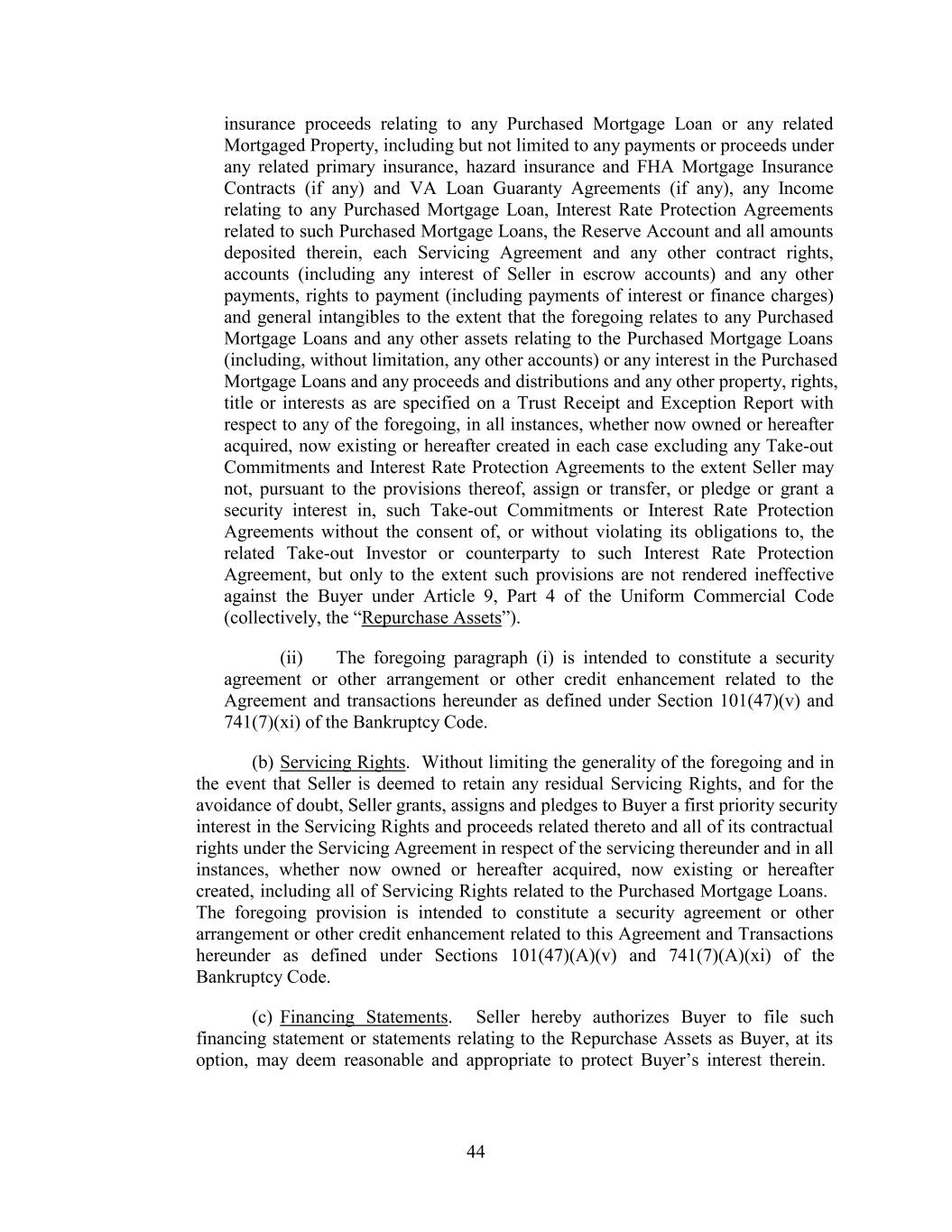 insurance proceeds relating to any Purchased Mortgage Loan or any related Mortgaged Property, including but not limited to any payments or proceeds under any related primary insurance, hazard insurance and FHA Mortgage Insurance Contracts (if any) and VA Loan Guaranty Agreements (if any), any Income relating to any Purchased Mortgage Loan, Interest Rate Protection Agreements related to such Purchased Mortgage Loans, the Reserve Account and all amounts deposited therein, each Servicing Agreement and any other contract rights, accounts (including any interest of Seller in escrow accounts) and any other payments, rights to payment (including payments of interest or finance charges) and general intangibles to the extent that the foregoing relates to any Purchased Mortgage Loans and any other assets relating to the Purchased Mortgage Loans (including, without limitation, any other accounts) or any interest in the Purchased Mortgage Loans and any proceeds and distributions and any other property, rights, title or interests as are specified on a Trust Receipt and Exception Report with respect to any of the foregoing, in all instances, whether now owned or hereafter acquired, now existing or hereafter created in each case excluding any Take-out Commitments and Interest Rate Protection Agreements to the extent Seller may not, pursuant to the provisions thereof, assign or transfer, or pledge or grant a security interest in, such Take-out Commitments or Interest Rate Protection Agreements without the consent of, or without violating its obligations to, the related Take-out Investor or counterparty to such Interest Rate Protection Agreement, but only to the extent such provisions are not rendered ineffective against the Buyer under Article 9, Part 4 of the Uniform Commercial Code (collectively, the “Repurchase Assets”). (ii) The foregoing paragraph (i) is intended to constitute a security agreement or other arrangement or other credit enhancement related to the Agreement and transactions hereunder as defined under Section 101(47)(v) and 741(7)(xi) of the Bankruptcy Code. (b) Servicing Rights. Without limiting the generality of the foregoing and in the event that Seller is deemed to retain any residual Servicing Rights, and for the avoidance of doubt, Seller grants, assigns and pledges to Buyer a first priority security interest in the Servicing Rights and proceeds related thereto and all of its contractual rights under the Servicing Agreement in respect of the servicing thereunder and in all instances, whether now owned or hereafter acquired, now existing or hereafter created, including all of Servicing Rights related to the Purchased Mortgage Loans. The foregoing provision is intended to constitute a security agreement or other arrangement or other credit enhancement related to this Agreement and Transactions hereunder as defined under Sections 101(47)(A)(v) and 741(7)(A)(xi) of the Bankruptcy Code. (c) Financing Statements. Seller hereby authorizes Buyer to file such financing statement or statements relating to the Repurchase Assets as Buyer, at its option, may deem reasonable and appropriate to protect Buyer’s interest therein. 44