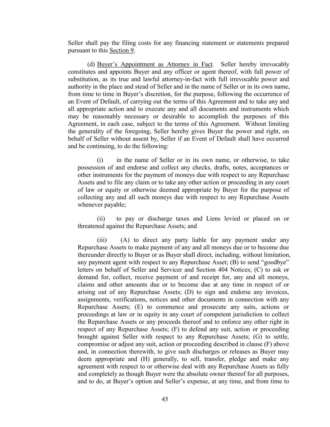Seller shall pay the filing costs for any financing statement or statements prepared pursuant to this Section 9. (d) Buyer’s Appointment as Attorney in Fact. Seller hereby irrevocably constitutes and appoints Buyer and any officer or agent thereof, with full power of substitution, as its true and lawful attorney-in-fact with full irrevocable power and authority in the place and stead of Seller and in the name of Seller or in its own name, from time to time in Buyer’s discretion, for the purpose, following the occurrence of an Event of Default, of carrying out the terms of this Agreement and to take any and all appropriate action and to execute any and all documents and instruments which may be reasonably necessary or desirable to accomplish the purposes of this Agreement, in each case, subject to the terms of this Agreement. Without limiting the generality of the foregoing, Seller hereby gives Buyer the power and right, on behalf of Seller without assent by, Seller if an Event of Default shall have occurred and be continuing, to do the following: (i) in the name of Seller or in its own name, or otherwise, to take possession of and endorse and collect any checks, drafts, notes, acceptances or other instruments for the payment of moneys due with respect to any Repurchase Assets and to file any claim or to take any other action or proceeding in any court of law or equity or otherwise deemed appropriate by Buyer for the purpose of collecting any and all such moneys due with respect to any Repurchase Assets whenever payable; (ii) to pay or discharge taxes and Liens levied or placed on or threatened against the Repurchase Assets; and (iii) (A) to direct any party liable for any payment under any Repurchase Assets to make payment of any and all moneys due or to become due thereunder directly to Buyer or as Buyer shall direct, including, without limitation, any payment agent with respect to any Repurchase Asset; (B) to send “goodbye” letters on behalf of Seller and Servicer and Section 404 Notices; (C) to ask or demand for, collect, receive payment of and receipt for, any and all moneys, claims and other amounts due or to become due at any time in respect of or arising out of any Repurchase Assets; (D) to sign and endorse any invoices, assignments, verifications, notices and other documents in connection with any Repurchase Assets; (E) to commence and prosecute any suits, actions or proceedings at law or in equity in any court of competent jurisdiction to collect the Repurchase Assets or any proceeds thereof and to enforce any other right in respect of any Repurchase Assets; (F) to defend any suit, action or proceeding brought against Seller with respect to any Repurchase Assets; (G) to settle, compromise or adjust any suit, action or proceeding described in clause (F) above and, in connection therewith, to give such discharges or releases as Buyer may deem appropriate and (H) generally, to sell, transfer, pledge and make any agreement with respect to or otherwise deal with any Repurchase Assets as fully and completely as though Buyer were the absolute owner thereof for all purposes, and to do, at Buyer’s option and Seller’s expense, at any time, and from time to 45