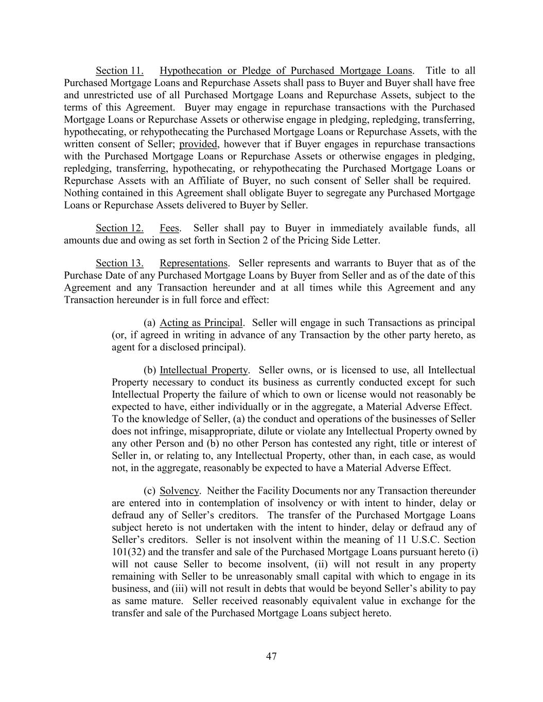 Section 11. Hypothecation or Pledge of Purchased Mortgage Loans. Title to all Purchased Mortgage Loans and Repurchase Assets shall pass to Buyer and Buyer shall have free and unrestricted use of all Purchased Mortgage Loans and Repurchase Assets, subject to the terms of this Agreement. Buyer may engage in repurchase transactions with the Purchased Mortgage Loans or Repurchase Assets or otherwise engage in pledging, repledging, transferring, hypothecating, or rehypothecating the Purchased Mortgage Loans or Repurchase Assets, with the written consent of Seller; provided, however that if Buyer engages in repurchase transactions with the Purchased Mortgage Loans or Repurchase Assets or otherwise engages in pledging, repledging, transferring, hypothecating, or rehypothecating the Purchased Mortgage Loans or Repurchase Assets with an Affiliate of Buyer, no such consent of Seller shall be required. Nothing contained in this Agreement shall obligate Buyer to segregate any Purchased Mortgage Loans or Repurchase Assets delivered to Buyer by Seller. Section 12. Fees. Seller shall pay to Buyer in immediately available funds, all amounts due and owing as set forth in Section 2 of the Pricing Side Letter. Section 13. Representations. Seller represents and warrants to Buyer that as of the Purchase Date of any Purchased Mortgage Loans by Buyer from Seller and as of the date of this Agreement and any Transaction hereunder and at all times while this Agreement and any Transaction hereunder is in full force and effect: (a) Acting as Principal. Seller will engage in such Transactions as principal (or, if agreed in writing in advance of any Transaction by the other party hereto, as agent for a disclosed principal). (b) Intellectual Property. Seller owns, or is licensed to use, all Intellectual Property necessary to conduct its business as currently conducted except for such Intellectual Property the failure of which to own or license would not reasonably be expected to have, either individually or in the aggregate, a Material Adverse Effect. To the knowledge of Seller, (a) the conduct and operations of the businesses of Seller does not infringe, misappropriate, dilute or violate any Intellectual Property owned by any other Person and (b) no other Person has contested any right, title or interest of Seller in, or relating to, any Intellectual Property, other than, in each case, as would not, in the aggregate, reasonably be expected to have a Material Adverse Effect. (c) Solvency. Neither the Facility Documents nor any Transaction thereunder are entered into in contemplation of insolvency or with intent to hinder, delay or defraud any of Seller’s creditors. The transfer of the Purchased Mortgage Loans subject hereto is not undertaken with the intent to hinder, delay or defraud any of Seller’s creditors. Seller is not insolvent within the meaning of 11 U.S.C. Section 101(32) and the transfer and sale of the Purchased Mortgage Loans pursuant hereto (i) will not cause Seller to become insolvent, (ii) will not result in any property remaining with Seller to be unreasonably small capital with which to engage in its business, and (iii) will not result in debts that would be beyond Seller’s ability to pay as same mature. Seller received reasonably equivalent value in exchange for the transfer and sale of the Purchased Mortgage Loans subject hereto. 47