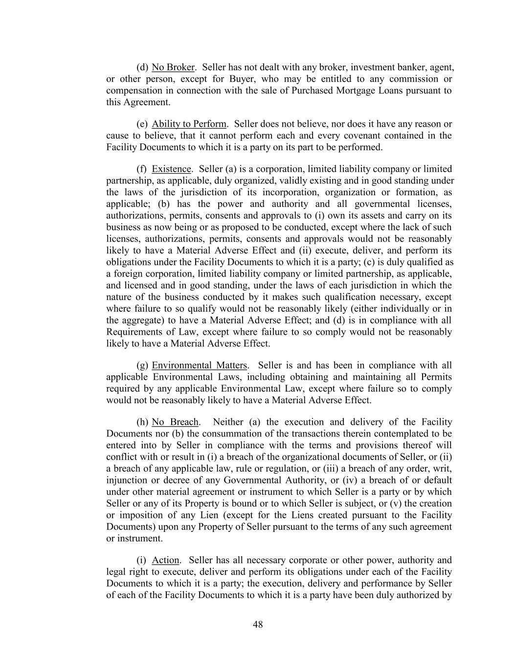 (d) No Broker. Seller has not dealt with any broker, investment banker, agent, or other person, except for Buyer, who may be entitled to any commission or compensation in connection with the sale of Purchased Mortgage Loans pursuant to this Agreement. (e) Ability to Perform. Seller does not believe, nor does it have any reason or cause to believe, that it cannot perform each and every covenant contained in the Facility Documents to which it is a party on its part to be performed. (f) Existence. Seller (a) is a corporation, limited liability company or limited partnership, as applicable, duly organized, validly existing and in good standing under the laws of the jurisdiction of its incorporation, organization or formation, as applicable; (b) has the power and authority and all governmental licenses, authorizations, permits, consents and approvals to (i) own its assets and carry on its business as now being or as proposed to be conducted, except where the lack of such licenses, authorizations, permits, consents and approvals would not be reasonably likely to have a Material Adverse Effect and (ii) execute, deliver, and perform its obligations under the Facility Documents to which it is a party; (c) is duly qualified as a foreign corporation, limited liability company or limited partnership, as applicable, and licensed and in good standing, under the laws of each jurisdiction in which the nature of the business conducted by it makes such qualification necessary, except where failure to so qualify would not be reasonably likely (either individually or in the aggregate) to have a Material Adverse Effect; and (d) is in compliance with all Requirements of Law, except where failure to so comply would not be reasonably likely to have a Material Adverse Effect. (g) Environmental Matters. Seller is and has been in compliance with all applicable Environmental Laws, including obtaining and maintaining all Permits required by any applicable Environmental Law, except where failure so to comply would not be reasonably likely to have a Material Adverse Effect. (h) No Breach. Neither (a) the execution and delivery of the Facility Documents nor (b) the consummation of the transactions therein contemplated to be entered into by Seller in compliance with the terms and provisions thereof will conflict with or result in (i) a breach of the organizational documents of Seller, or (ii) a breach of any applicable law, rule or regulation, or (iii) a breach of any order, writ, injunction or decree of any Governmental Authority, or (iv) a breach of or default under other material agreement or instrument to which Seller is a party or by which Seller or any of its Property is bound or to which Seller is subject, or (v) the creation or imposition of any Lien (except for the Liens created pursuant to the Facility Documents) upon any Property of Seller pursuant to the terms of any such agreement or instrument. (i) Action. Seller has all necessary corporate or other power, authority and legal right to execute, deliver and perform its obligations under each of the Facility Documents to which it is a party; the execution, delivery and performance by Seller of each of the Facility Documents to which it is a party have been duly authorized by 48