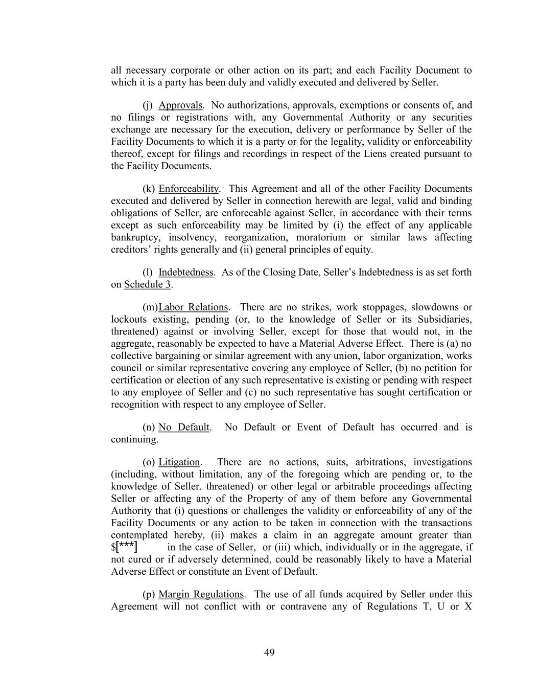 all necessary corporate or other action on its part; and each Facility Document to which it is a party has been duly and validly executed and delivered by Seller. (j) Approvals. No authorizations, approvals, exemptions or consents of, and no filings or registrations with, any Governmental Authority or any securities exchange are necessary for the execution, delivery or performance by Seller of the Facility Documents to which it is a party or for the legality, validity or enforceability thereof, except for filings and recordings in respect of the Liens created pursuant to the Facility Documents. (k) Enforceability. This Agreement and all of the other Facility Documents executed and delivered by Seller in connection herewith are legal, valid and binding obligations of Seller, are enforceable against Seller, in accordance with their terms except as such enforceability may be limited by (i) the effect of any applicable bankruptcy, insolvency, reorganization, moratorium or similar laws affecting creditors’ rights generally and (ii) general principles of equity. (l) Indebtedness. As of the Closing Date, Seller’s Indebtedness is as set forth on Schedule 3. (m)Labor Relations. There are no strikes, work stoppages, slowdowns or lockouts existing, pending (or, to the knowledge of Seller or its Subsidiaries, threatened) against or involving Seller, except for those that would not, in the aggregate, reasonably be expected to have a Material Adverse Effect. There is (a) no collective bargaining or similar agreement with any union, labor organization, works council or similar representative covering any employee of Seller, (b) no petition for certification or election of any such representative is existing or pending with respect to any employee of Seller and (c) no such representative has sought certification or recognition with respect to any employee of Seller. (n) No Default. No Default or Event of Default has occurred and is continuing. (o) Litigation. There are no actions, suits, arbitrations, investigations (including, without limitation, any of the foregoing which are pending or, to the knowledge of Seller. threatened) or other legal or arbitrable proceedings affecting Seller or affecting any of the Property of any of them before any Governmental Authority that (i) questions or challenges the validity or enforceability of any of the Facility Documents or any action to be taken in connection with the transactions contemplated hereby, (ii) makes a claim in an aggregate amount greater than $ in the case of Seller, or (iii) which, individually or in the aggregate, if not cured or if adversely determined, could be reasonably likely to have a Material Adverse Effect or constitute an Event of Default. (p) Margin Regulations. The use of all funds acquired by Seller under this Agreement will not conflict with or contravene any of Regulations T, U or X 49 [***]
