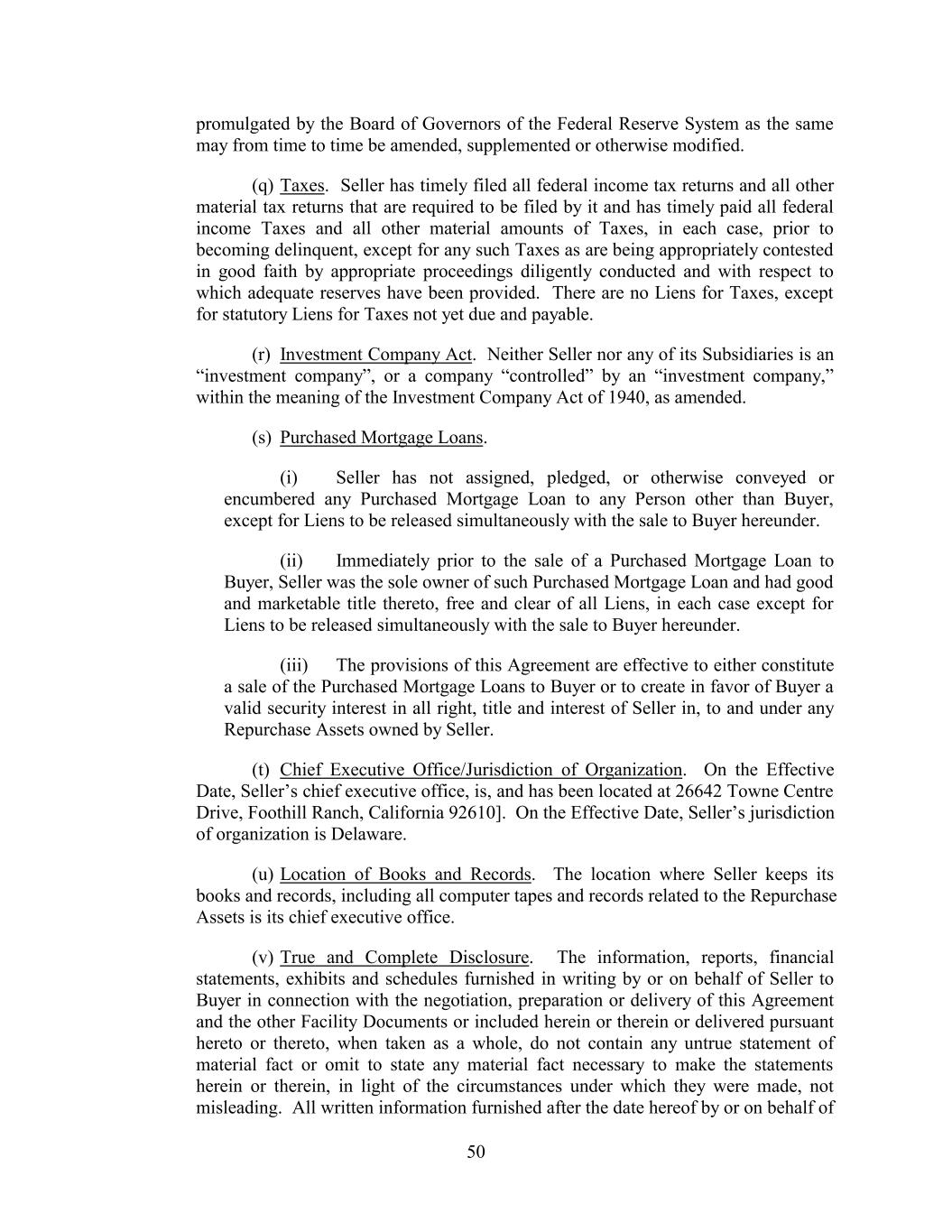 promulgated by the Board of Governors of the Federal Reserve System as the same may from time to time be amended, supplemented or otherwise modified. (q) Taxes. Seller has timely filed all federal income tax returns and all other material tax returns that are required to be filed by it and has timely paid all federal income Taxes and all other material amounts of Taxes, in each case, prior to becoming delinquent, except for any such Taxes as are being appropriately contested in good faith by appropriate proceedings diligently conducted and with respect to which adequate reserves have been provided. There are no Liens for Taxes, except for statutory Liens for Taxes not yet due and payable. (r) Investment Company Act. Neither Seller nor any of its Subsidiaries is an “investment company”, or a company “controlled” by an “investment company,” within the meaning of the Investment Company Act of 1940, as amended. (s) Purchased Mortgage Loans. (i) Seller has not assigned, pledged, or otherwise conveyed or encumbered any Purchased Mortgage Loan to any Person other than Buyer, except for Liens to be released simultaneously with the sale to Buyer hereunder. (ii) Immediately prior to the sale of a Purchased Mortgage Loan to Buyer, Seller was the sole owner of such Purchased Mortgage Loan and had good and marketable title thereto, free and clear of all Liens, in each case except for Liens to be released simultaneously with the sale to Buyer hereunder. (iii) The provisions of this Agreement are effective to either constitute a sale of the Purchased Mortgage Loans to Buyer or to create in favor of Buyer a valid security interest in all right, title and interest of Seller in, to and under any Repurchase Assets owned by Seller. (t) Chief Executive Office/Jurisdiction of Organization. On the Effective Date, Seller’s chief executive office, is, and has been located at 26642 Towne Centre Drive, Foothill Ranch, California 92610]. On the Effective Date, Seller’s jurisdiction of organization is Delaware. (u) Location of Books and Records. The location where Seller keeps its books and records, including all computer tapes and records related to the Repurchase Assets is its chief executive office. (v) True and Complete Disclosure. The information, reports, financial statements, exhibits and schedules furnished in writing by or on behalf of Seller to Buyer in connection with the negotiation, preparation or delivery of this Agreement and the other Facility Documents or included herein or therein or delivered pursuant hereto or thereto, when taken as a whole, do not contain any untrue statement of material fact or omit to state any material fact necessary to make the statements herein or therein, in light of the circumstances under which they were made, not misleading. All written information furnished after the date hereof by or on behalf of 50