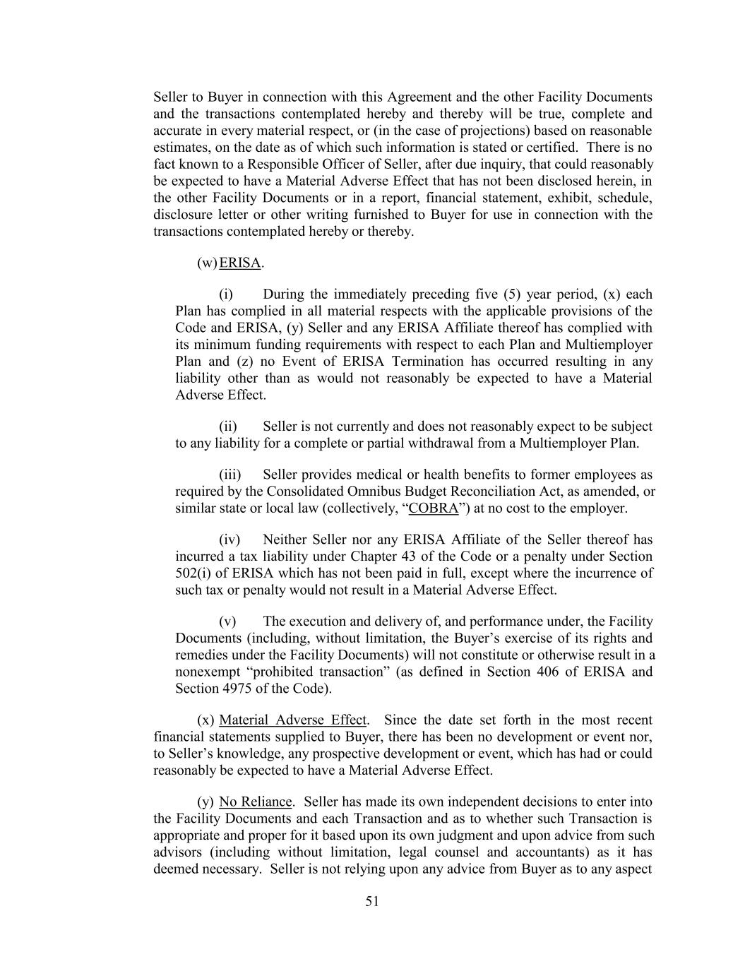 Seller to Buyer in connection with this Agreement and the other Facility Documents and the transactions contemplated hereby and thereby will be true, complete and accurate in every material respect, or (in the case of projections) based on reasonable estimates, on the date as of which such information is stated or certified. There is no fact known to a Responsible Officer of Seller, after due inquiry, that could reasonably be expected to have a Material Adverse Effect that has not been disclosed herein, in the other Facility Documents or in a report, financial statement, exhibit, schedule, disclosure letter or other writing furnished to Buyer for use in connection with the transactions contemplated hereby or thereby. (w)ERISA. (i) During the immediately preceding five (5) year period, (x) each Plan has complied in all material respects with the applicable provisions of the Code and ERISA, (y) Seller and any ERISA Affiliate thereof has complied with its minimum funding requirements with respect to each Plan and Multiemployer Plan and (z) no Event of ERISA Termination has occurred resulting in any liability other than as would not reasonably be expected to have a Material Adverse Effect. (ii) Seller is not currently and does not reasonably expect to be subject to any liability for a complete or partial withdrawal from a Multiemployer Plan. (iii) Seller provides medical or health benefits to former employees as required by the Consolidated Omnibus Budget Reconciliation Act, as amended, or similar state or local law (collectively, “COBRA”) at no cost to the employer. (iv) Neither Seller nor any ERISA Affiliate of the Seller thereof has incurred a tax liability under Chapter 43 of the Code or a penalty under Section 502(i) of ERISA which has not been paid in full, except where the incurrence of such tax or penalty would not result in a Material Adverse Effect. (v) The execution and delivery of, and performance under, the Facility Documents (including, without limitation, the Buyer’s exercise of its rights and remedies under the Facility Documents) will not constitute or otherwise result in a nonexempt “prohibited transaction” (as defined in Section 406 of ERISA and Section 4975 of the Code). (x) Material Adverse Effect. Since the date set forth in the most recent financial statements supplied to Buyer, there has been no development or event nor, to Seller’s knowledge, any prospective development or event, which has had or could reasonably be expected to have a Material Adverse Effect. (y) No Reliance. Seller has made its own independent decisions to enter into the Facility Documents and each Transaction and as to whether such Transaction is appropriate and proper for it based upon its own judgment and upon advice from such advisors (including without limitation, legal counsel and accountants) as it has deemed necessary. Seller is not relying upon any advice from Buyer as to any aspect 51