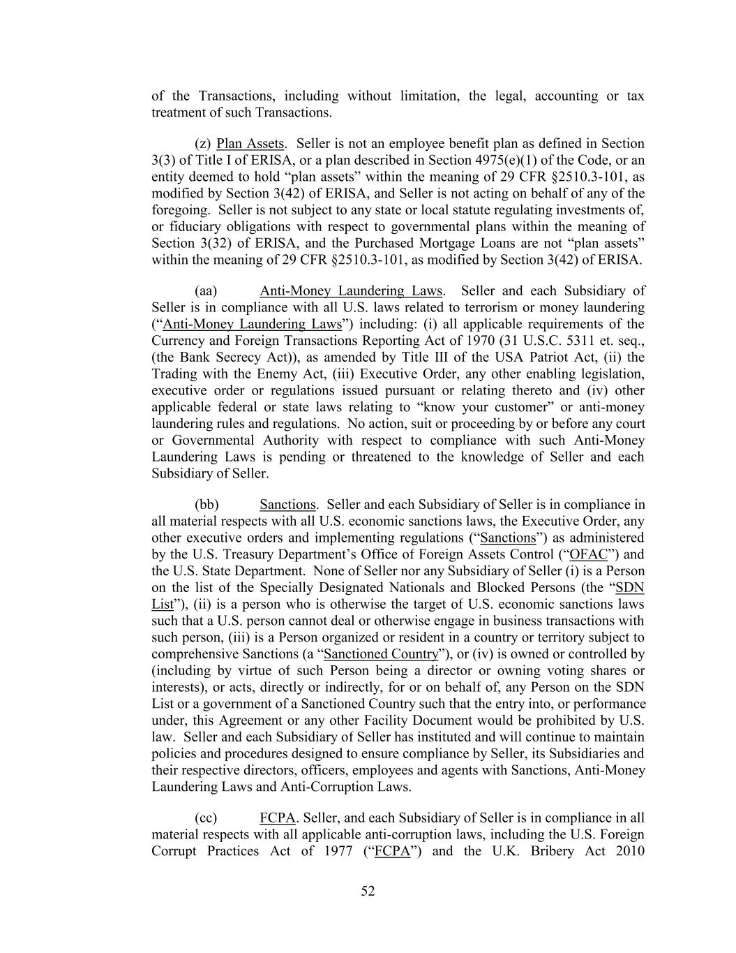 of the Transactions, including without limitation, the legal, accounting or tax treatment of such Transactions. (z) Plan Assets. Seller is not an employee benefit plan as defined in Section 3(3) of Title I of ERISA, or a plan described in Section 4975(e)(1) of the Code, or an entity deemed to hold “plan assets” within the meaning of 29 CFR §2510.3-101, as modified by Section 3(42) of ERISA, and Seller is not acting on behalf of any of the foregoing. Seller is not subject to any state or local statute regulating investments of, or fiduciary obligations with respect to governmental plans within the meaning of Section 3(32) of ERISA, and the Purchased Mortgage Loans are not “plan assets” within the meaning of 29 CFR §2510.3-101, as modified by Section 3(42) of ERISA. (aa) Anti-Money Laundering Laws. Seller and each Subsidiary of Seller is in compliance with all U.S. laws related to terrorism or money laundering (“Anti-Money Laundering Laws”) including: (i) all applicable requirements of the Currency and Foreign Transactions Reporting Act of 1970 (31 U.S.C. 5311 et. seq., (the Bank Secrecy Act)), as amended by Title III of the USA Patriot Act, (ii) the Trading with the Enemy Act, (iii) Executive Order, any other enabling legislation, executive order or regulations issued pursuant or relating thereto and (iv) other applicable federal or state laws relating to “know your customer” or anti-money laundering rules and regulations. No action, suit or proceeding by or before any court or Governmental Authority with respect to compliance with such Anti-Money Laundering Laws is pending or threatened to the knowledge of Seller and each Subsidiary of Seller. (bb) Sanctions. Seller and each Subsidiary of Seller is in compliance in all material respects with all U.S. economic sanctions laws, the Executive Order, any other executive orders and implementing regulations (“Sanctions”) as administered by the U.S. Treasury Department’s Office of Foreign Assets Control (“OFAC”) and the U.S. State Department. None of Seller nor any Subsidiary of Seller (i) is a Person on the list of the Specially Designated Nationals and Blocked Persons (the “SDN List”), (ii) is a person who is otherwise the target of U.S. economic sanctions laws such that a U.S. person cannot deal or otherwise engage in business transactions with such person, (iii) is a Person organized or resident in a country or territory subject to comprehensive Sanctions (a “Sanctioned Country”), or (iv) is owned or controlled by (including by virtue of such Person being a director or owning voting shares or interests), or acts, directly or indirectly, for or on behalf of, any Person on the SDN List or a government of a Sanctioned Country such that the entry into, or performance under, this Agreement or any other Facility Document would be prohibited by U.S. law. Seller and each Subsidiary of Seller has instituted and will continue to maintain policies and procedures designed to ensure compliance by Seller, its Subsidiaries and their respective directors, officers, employees and agents with Sanctions, Anti-Money Laundering Laws and Anti-Corruption Laws. (cc) FCPA. Seller, and each Subsidiary of Seller is in compliance in all material respects with all applicable anti-corruption laws, including the U.S. Foreign Corrupt Practices Act of 1977 (“FCPA”) and the U.K. Bribery Act 2010 52