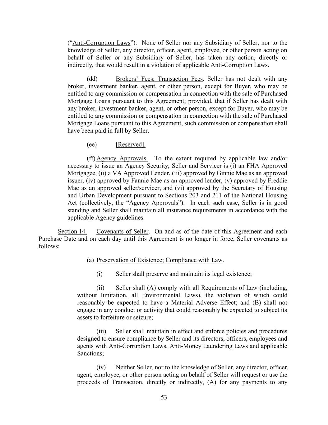 (“Anti-Corruption Laws”). None of Seller nor any Subsidiary of Seller, nor to the knowledge of Seller, any director, officer, agent, employee, or other person acting on behalf of Seller or any Subsidiary of Seller, has taken any action, directly or indirectly, that would result in a violation of applicable Anti-Corruption Laws. (dd) Brokers’ Fees; Transaction Fees. Seller has not dealt with any broker, investment banker, agent, or other person, except for Buyer, who may be entitled to any commission or compensation in connection with the sale of Purchased Mortgage Loans pursuant to this Agreement; provided, that if Seller has dealt with any broker, investment banker, agent, or other person, except for Buyer, who may be entitled to any commission or compensation in connection with the sale of Purchased Mortgage Loans pursuant to this Agreement, such commission or compensation shall have been paid in full by Seller. (ee) [Reserved]. (ff) Agency Approvals. To the extent required by applicable law and/or necessary to issue an Agency Security, Seller and Servicer is (i) an FHA Approved Mortgagee, (ii) a VA Approved Lender, (iii) approved by Ginnie Mae as an approved issuer, (iv) approved by Fannie Mae as an approved lender, (v) approved by Freddie Mac as an approved seller/servicer, and (vi) approved by the Secretary of Housing and Urban Development pursuant to Sections 203 and 211 of the National Housing Act (collectively, the “Agency Approvals”). In each such case, Seller is in good standing and Seller shall maintain all insurance requirements in accordance with the applicable Agency guidelines. Section 14. Covenants of Seller. On and as of the date of this Agreement and each Purchase Date and on each day until this Agreement is no longer in force, Seller covenants as follows: (a) Preservation of Existence; Compliance with Law. (i) Seller shall preserve and maintain its legal existence; (ii) Seller shall (A) comply with all Requirements of Law (including, without limitation, all Environmental Laws), the violation of which could reasonably be expected to have a Material Adverse Effect; and (B) shall not engage in any conduct or activity that could reasonably be expected to subject its assets to forfeiture or seizure; (iii) Seller shall maintain in effect and enforce policies and procedures designed to ensure compliance by Seller and its directors, officers, employees and agents with Anti-Corruption Laws, Anti-Money Laundering Laws and applicable Sanctions; (iv) Neither Seller, nor to the knowledge of Seller, any director, officer, agent, employee, or other person acting on behalf of Seller will request or use the proceeds of Transaction, directly or indirectly, (A) for any payments to any 53
