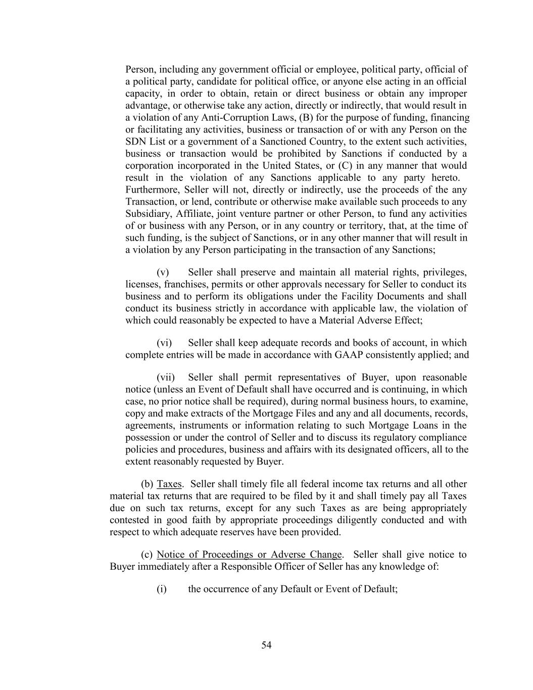 Person, including any government official or employee, political party, official of a political party, candidate for political office, or anyone else acting in an official capacity, in order to obtain, retain or direct business or obtain any improper advantage, or otherwise take any action, directly or indirectly, that would result in a violation of any Anti-Corruption Laws, (B) for the purpose of funding, financing or facilitating any activities, business or transaction of or with any Person on the SDN List or a government of a Sanctioned Country, to the extent such activities, business or transaction would be prohibited by Sanctions if conducted by a corporation incorporated in the United States, or (C) in any manner that would result in the violation of any Sanctions applicable to any party hereto. Furthermore, Seller will not, directly or indirectly, use the proceeds of the any Transaction, or lend, contribute or otherwise make available such proceeds to any Subsidiary, Affiliate, joint venture partner or other Person, to fund any activities of or business with any Person, or in any country or territory, that, at the time of such funding, is the subject of Sanctions, or in any other manner that will result in a violation by any Person participating in the transaction of any Sanctions; (v) Seller shall preserve and maintain all material rights, privileges, licenses, franchises, permits or other approvals necessary for Seller to conduct its business and to perform its obligations under the Facility Documents and shall conduct its business strictly in accordance with applicable law, the violation of which could reasonably be expected to have a Material Adverse Effect; (vi) Seller shall keep adequate records and books of account, in which complete entries will be made in accordance with GAAP consistently applied; and (vii) Seller shall permit representatives of Buyer, upon reasonable notice (unless an Event of Default shall have occurred and is continuing, in which case, no prior notice shall be required), during normal business hours, to examine, copy and make extracts of the Mortgage Files and any and all documents, records, agreements, instruments or information relating to such Mortgage Loans in the possession or under the control of Seller and to discuss its regulatory compliance policies and procedures, business and affairs with its designated officers, all to the extent reasonably requested by Buyer. (b) Taxes. Seller shall timely file all federal income tax returns and all other material tax returns that are required to be filed by it and shall timely pay all Taxes due on such tax returns, except for any such Taxes as are being appropriately contested in good faith by appropriate proceedings diligently conducted and with respect to which adequate reserves have been provided. (c) Notice of Proceedings or Adverse Change. Seller shall give notice to Buyer immediately after a Responsible Officer of Seller has any knowledge of: (i) the occurrence of any Default or Event of Default; 54