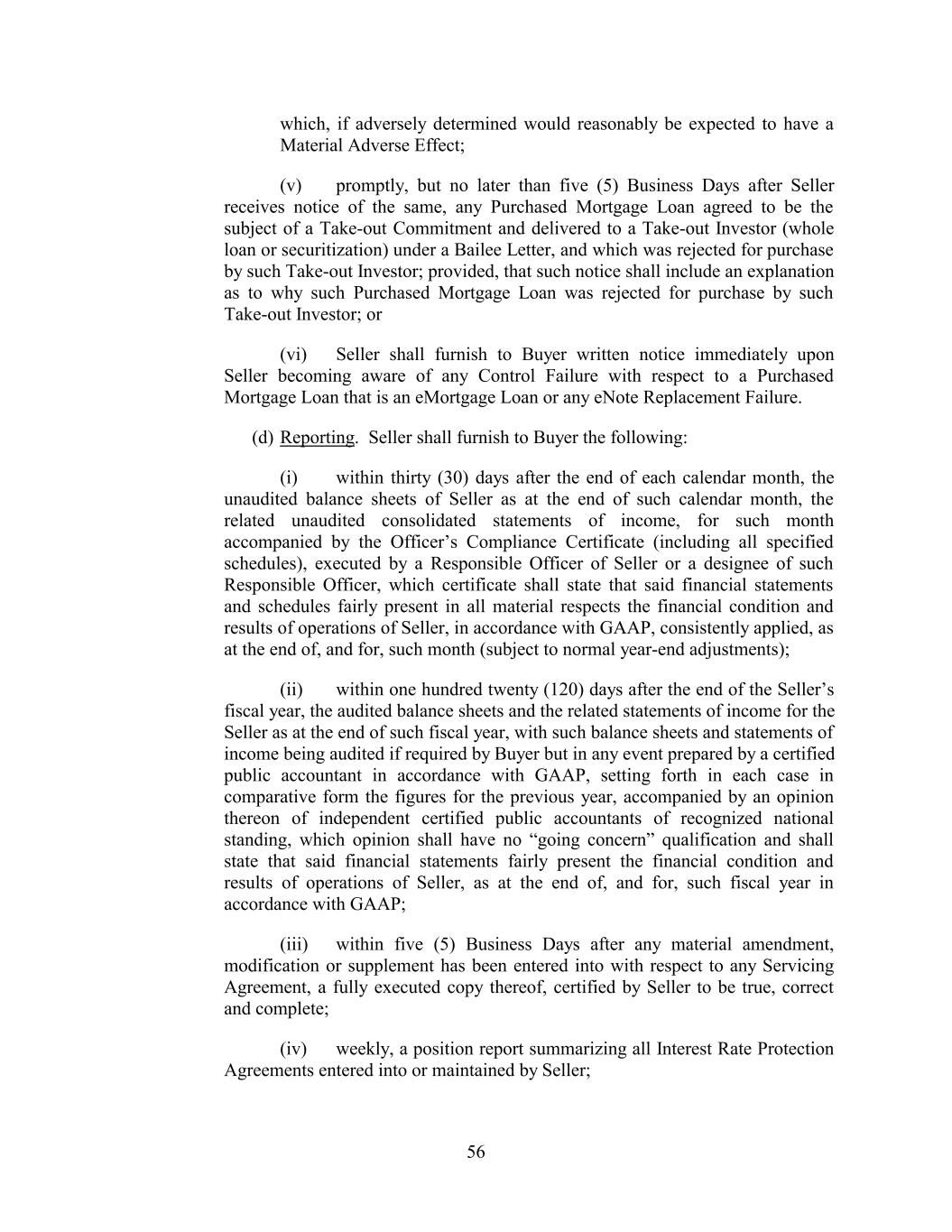 which, if adversely determined would reasonably be expected to have a Material Adverse Effect; (v) promptly, but no later than five (5) Business Days after Seller receives notice of the same, any Purchased Mortgage Loan agreed to be the subject of a Take-out Commitment and delivered to a Take-out Investor (whole loan or securitization) under a Bailee Letter, and which was rejected for purchase by such Take-out Investor; provided, that such notice shall include an explanation as to why such Purchased Mortgage Loan was rejected for purchase by such Take-out Investor; or (vi) Seller shall furnish to Buyer written notice immediately upon Seller becoming aware of any Control Failure with respect to a Purchased Mortgage Loan that is an eMortgage Loan or any eNote Replacement Failure. (d) Reporting. Seller shall furnish to Buyer the following: (i) within thirty (30) days after the end of each calendar month, the unaudited balance sheets of Seller as at the end of such calendar month, the related unaudited consolidated statements of income, for such month accompanied by the Officer’s Compliance Certificate (including all specified schedules), executed by a Responsible Officer of Seller or a designee of such Responsible Officer, which certificate shall state that said financial statements and schedules fairly present in all material respects the financial condition and results of operations of Seller, in accordance with GAAP, consistently applied, as at the end of, and for, such month (subject to normal year-end adjustments); (ii) within one hundred twenty (120) days after the end of the Seller’s fiscal year, the audited balance sheets and the related statements of income for the Seller as at the end of such fiscal year, with such balance sheets and statements of income being audited if required by Buyer but in any event prepared by a certified public accountant in accordance with GAAP, setting forth in each case in comparative form the figures for the previous year, accompanied by an opinion thereon of independent certified public accountants of recognized national standing, which opinion shall have no “going concern” qualification and shall state that said financial statements fairly present the financial condition and results of operations of Seller, as at the end of, and for, such fiscal year in accordance with GAAP; (iii) within five (5) Business Days after any material amendment, modification or supplement has been entered into with respect to any Servicing Agreement, a fully executed copy thereof, certified by Seller to be true, correct and complete; (iv) weekly, a position report summarizing all Interest Rate Protection Agreements entered into or maintained by Seller; 56