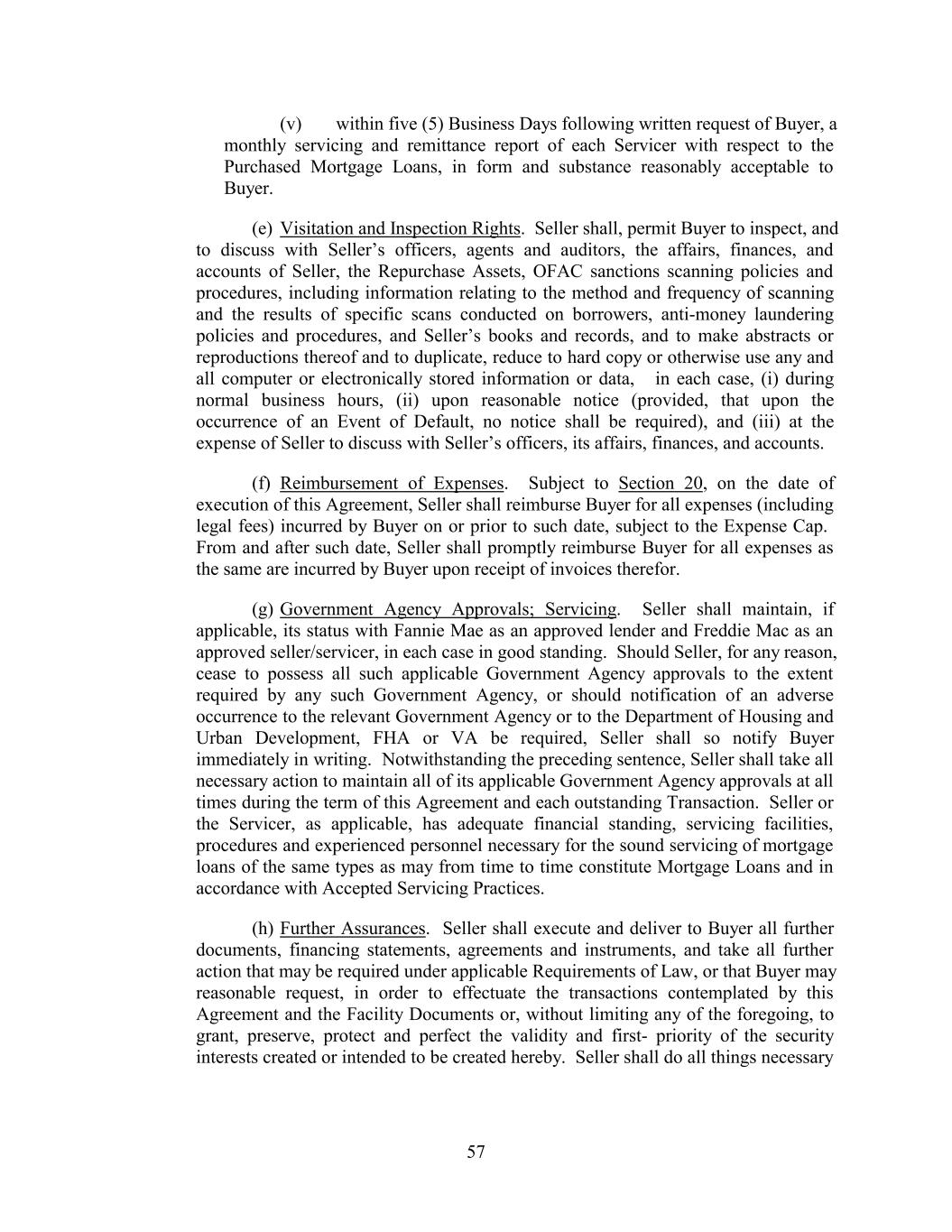 (v) within five (5) Business Days following written request of Buyer, a monthly servicing and remittance report of each Servicer with respect to the Purchased Mortgage Loans, in form and substance reasonably acceptable to Buyer. (e) Visitation and Inspection Rights. Seller shall, permit Buyer to inspect, and to discuss with Seller’s officers, agents and auditors, the affairs, finances, and accounts of Seller, the Repurchase Assets, OFAC sanctions scanning policies and procedures, including information relating to the method and frequency of scanning and the results of specific scans conducted on borrowers, anti-money laundering policies and procedures, and Seller’s books and records, and to make abstracts or reproductions thereof and to duplicate, reduce to hard copy or otherwise use any and all computer or electronically stored information or data, in each case, (i) during normal business hours, (ii) upon reasonable notice (provided, that upon the occurrence of an Event of Default, no notice shall be required), and (iii) at the expense of Seller to discuss with Seller’s officers, its affairs, finances, and accounts. (f) Reimbursement of Expenses. Subject to Section 20, on the date of execution of this Agreement, Seller shall reimburse Buyer for all expenses (including legal fees) incurred by Buyer on or prior to such date, subject to the Expense Cap. From and after such date, Seller shall promptly reimburse Buyer for all expenses as the same are incurred by Buyer upon receipt of invoices therefor. (g) Government Agency Approvals; Servicing. Seller shall maintain, if applicable, its status with Fannie Mae as an approved lender and Freddie Mac as an approved seller/servicer, in each case in good standing. Should Seller, for any reason, cease to possess all such applicable Government Agency approvals to the extent required by any such Government Agency, or should notification of an adverse occurrence to the relevant Government Agency or to the Department of Housing and Urban Development, FHA or VA be required, Seller shall so notify Buyer immediately in writing. Notwithstanding the preceding sentence, Seller shall take all necessary action to maintain all of its applicable Government Agency approvals at all times during the term of this Agreement and each outstanding Transaction. Seller or the Servicer, as applicable, has adequate financial standing, servicing facilities, procedures and experienced personnel necessary for the sound servicing of mortgage loans of the same types as may from time to time constitute Mortgage Loans and in accordance with Accepted Servicing Practices. (h) Further Assurances. Seller shall execute and deliver to Buyer all further documents, financing statements, agreements and instruments, and take all further action that may be required under applicable Requirements of Law, or that Buyer may reasonable request, in order to effectuate the transactions contemplated by this Agreement and the Facility Documents or, without limiting any of the foregoing, to grant, preserve, protect and perfect the validity and first- priority of the security interests created or intended to be created hereby. Seller shall do all things necessary 57