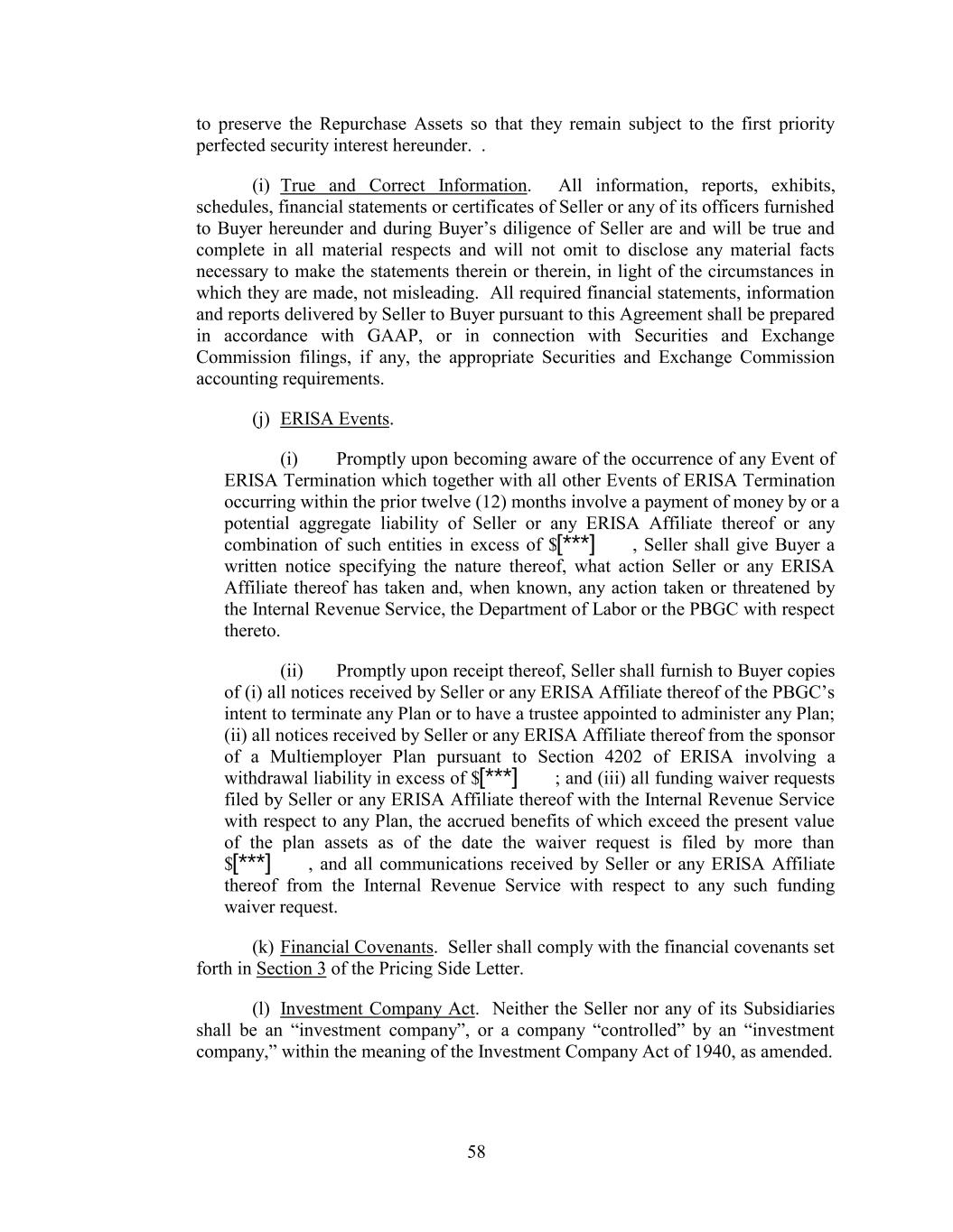 to preserve the Repurchase Assets so that they remain subject to the first priority perfected security interest hereunder. . (i) True and Correct Information. All information, reports, exhibits, schedules, financial statements or certificates of Seller or any of its officers furnished to Buyer hereunder and during Buyer’s diligence of Seller are and will be true and complete in all material respects and will not omit to disclose any material facts necessary to make the statements therein or therein, in light of the circumstances in which they are made, not misleading. All required financial statements, information and reports delivered by Seller to Buyer pursuant to this Agreement shall be prepared in accordance with GAAP, or in connection with Securities and Exchange Commission filings, if any, the appropriate Securities and Exchange Commission accounting requirements. (j) ERISA Events. (i) Promptly upon becoming aware of the occurrence of any Event of ERISA Termination which together with all other Events of ERISA Termination occurring within the prior twelve (12) months involve a payment of money by or a potential aggregate liability of Seller or any ERISA Affiliate thereof or any combination of such entities in excess of $ , Seller shall give Buyer a written notice specifying the nature thereof, what action Seller or any ERISA Affiliate thereof has taken and, when known, any action taken or threatened by the Internal Revenue Service, the Department of Labor or the PBGC with respect thereto. (ii) Promptly upon receipt thereof, Seller shall furnish to Buyer copies of (i) all notices received by Seller or any ERISA Affiliate thereof of the PBGC’s intent to terminate any Plan or to have a trustee appointed to administer any Plan; (ii) all notices received by Seller or any ERISA Affiliate thereof from the sponsor of a Multiemployer Plan pursuant to Section 4202 of ERISA involving a withdrawal liability in excess of $ ; and (iii) all funding waiver requests filed by Seller or any ERISA Affiliate thereof with the Internal Revenue Service with respect to any Plan, the accrued benefits of which exceed the present value of the plan assets as of the date the waiver request is filed by more than $ , and all communications received by Seller or any ERISA Affiliate thereof from the Internal Revenue Service with respect to any such funding waiver request. (k) Financial Covenants. Seller shall comply with the financial covenants set forth in Section 3 of the Pricing Side Letter. (l) Investment Company Act. Neither the Seller nor any of its Subsidiaries shall be an “investment company”, or a company “controlled” by an “investment company,” within the meaning of the Investment Company Act of 1940, as amended. 58 [***] [***] [***]