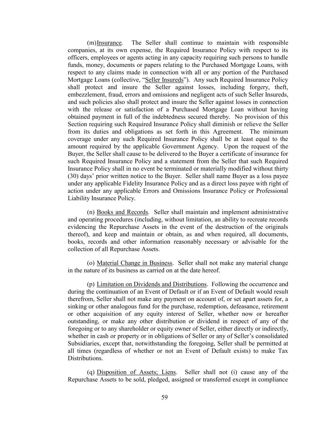 (m)Insurance. The Seller shall continue to maintain with responsible companies, at its own expense, the Required Insurance Policy with respect to its officers, employees or agents acting in any capacity requiring such persons to handle funds, money, documents or papers relating to the Purchased Mortgage Loans, with respect to any claims made in connection with all or any portion of the Purchased Mortgage Loans (collective, “Seller Insureds”). Any such Required Insurance Policy shall protect and insure the Seller against losses, including forgery, theft, embezzlement, fraud, errors and omissions and negligent acts of such Seller Insureds, and such policies also shall protect and insure the Seller against losses in connection with the release or satisfaction of a Purchased Mortgage Loan without having obtained payment in full of the indebtedness secured thereby. No provision of this Section requiring such Required Insurance Policy shall diminish or relieve the Seller from its duties and obligations as set forth in this Agreement. The minimum coverage under any such Required Insurance Policy shall be at least equal to the amount required by the applicable Government Agency. Upon the request of the Buyer, the Seller shall cause to be delivered to the Buyer a certificate of insurance for such Required Insurance Policy and a statement from the Seller that such Required Insurance Policy shall in no event be terminated or materially modified without thirty (30) days’ prior written notice to the Buyer. Seller shall name Buyer as a loss payee under any applicable Fidelity Insurance Policy and as a direct loss payee with right of action under any applicable Errors and Omissions Insurance Policy or Professional Liability Insurance Policy. (n) Books and Records. Seller shall maintain and implement administrative and operating procedures (including, without limitation, an ability to recreate records evidencing the Repurchase Assets in the event of the destruction of the originals thereof), and keep and maintain or obtain, as and when required, all documents, books, records and other information reasonably necessary or advisable for the collection of all Repurchase Assets. (o) Material Change in Business. Seller shall not make any material change in the nature of its business as carried on at the date hereof. (p) Limitation on Dividends and Distributions. Following the occurrence and during the continuation of an Event of Default or if an Event of Default would result therefrom, Seller shall not make any payment on account of, or set apart assets for, a sinking or other analogous fund for the purchase, redemption, defeasance, retirement or other acquisition of any equity interest of Seller, whether now or hereafter outstanding, or make any other distribution or dividend in respect of any of the foregoing or to any shareholder or equity owner of Seller, either directly or indirectly, whether in cash or property or in obligations of Seller or any of Seller’s consolidated Subsidiaries, except that, notwithstanding the foregoing, Seller shall be permitted at all times (regardless of whether or not an Event of Default exists) to make Tax Distributions. (q) Disposition of Assets; Liens. Seller shall not (i) cause any of the Repurchase Assets to be sold, pledged, assigned or transferred except in compliance 59