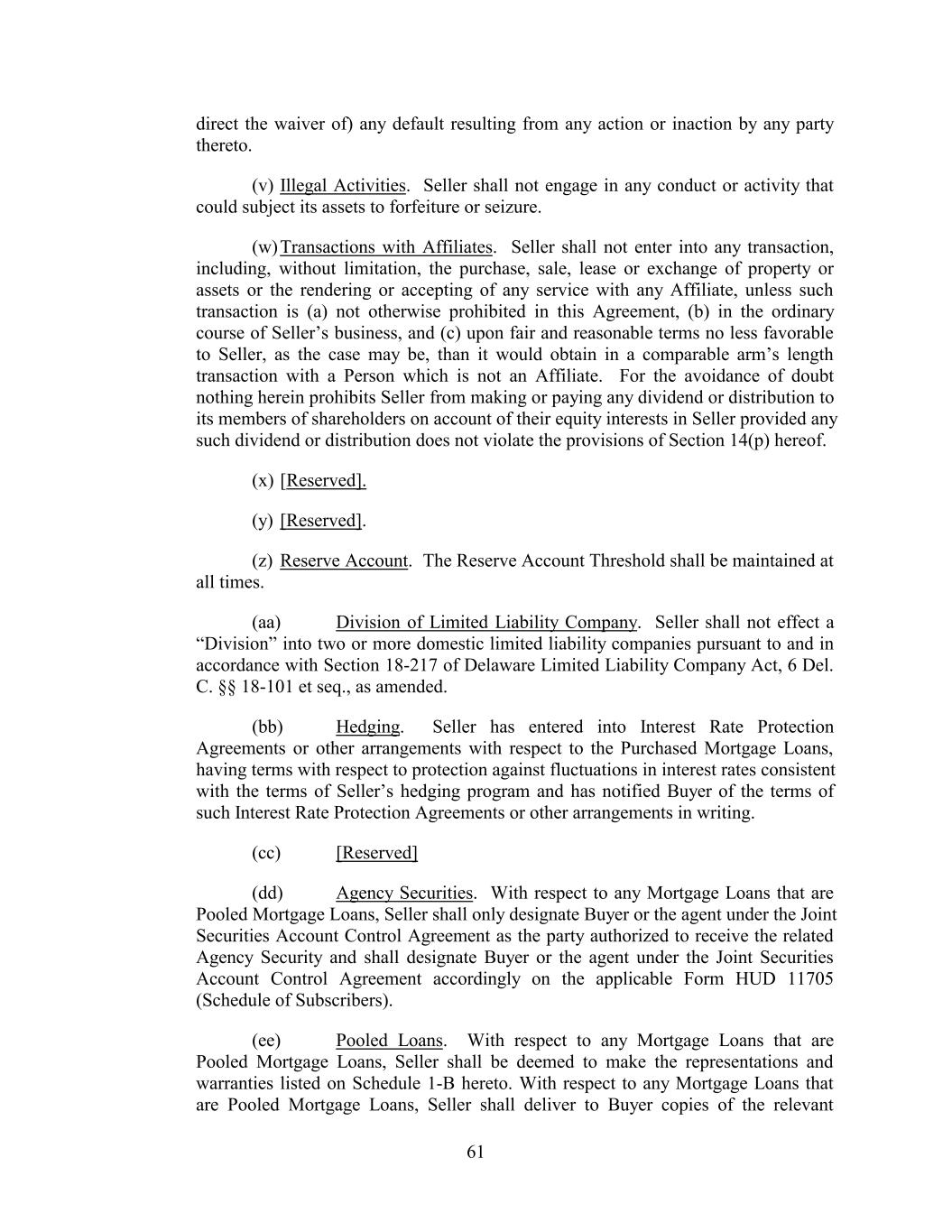 direct the waiver of) any default resulting from any action or inaction by any party thereto. (v) Illegal Activities. Seller shall not engage in any conduct or activity that could subject its assets to forfeiture or seizure. (w)Transactions with Affiliates. Seller shall not enter into any transaction, including, without limitation, the purchase, sale, lease or exchange of property or assets or the rendering or accepting of any service with any Affiliate, unless such transaction is (a) not otherwise prohibited in this Agreement, (b) in the ordinary course of Seller’s business, and (c) upon fair and reasonable terms no less favorable to Seller, as the case may be, than it would obtain in a comparable arm’s length transaction with a Person which is not an Affiliate. For the avoidance of doubt nothing herein prohibits Seller from making or paying any dividend or distribution to its members of shareholders on account of their equity interests in Seller provided any such dividend or distribution does not violate the provisions of Section 14(p) hereof. (x) [Reserved]. (y) [Reserved]. (z) Reserve Account. The Reserve Account Threshold shall be maintained at all times. (aa) Division of Limited Liability Company. Seller shall not effect a “Division” into two or more domestic limited liability companies pursuant to and in accordance with Section 18-217 of Delaware Limited Liability Company Act, 6 Del. C. §§ 18-101 et seq., as amended. (bb) Hedging. Seller has entered into Interest Rate Protection Agreements or other arrangements with respect to the Purchased Mortgage Loans, having terms with respect to protection against fluctuations in interest rates consistent with the terms of Seller’s hedging program and has notified Buyer of the terms of such Interest Rate Protection Agreements or other arrangements in writing. (cc) [Reserved] (dd) Agency Securities. With respect to any Mortgage Loans that are Pooled Mortgage Loans, Seller shall only designate Buyer or the agent under the Joint Securities Account Control Agreement as the party authorized to receive the related Agency Security and shall designate Buyer or the agent under the Joint Securities Account Control Agreement accordingly on the applicable Form HUD 11705 (Schedule of Subscribers). (ee) Pooled Loans. With respect to any Mortgage Loans that are Pooled Mortgage Loans, Seller shall be deemed to make the representations and warranties listed on Schedule 1-B hereto. With respect to any Mortgage Loans that are Pooled Mortgage Loans, Seller shall deliver to Buyer copies of the relevant 61