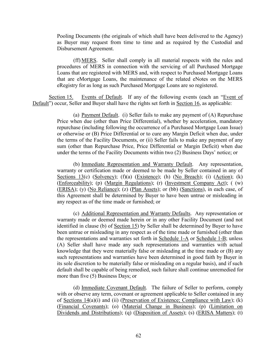 Pooling Documents (the originals of which shall have been delivered to the Agency) as Buyer may request from time to time and as required by the Custodial and Disbursement Agreement. (ff) MERS. Seller shall comply in all material respects with the rules and procedures of MERS in connection with the servicing of all Purchased Mortgage Loans that are registered with MERS and, with respect to Purchased Mortgage Loans that are eMortgage Loans, the maintenance of the related eNotes on the MERS eRegistry for as long as such Purchased Mortgage Loans are so registered. Section 15. Events of Default. If any of the following events (each an “Event of Default”) occur, Seller and Buyer shall have the rights set forth in Section 16, as applicable: (a) Payment Default. (i) Seller fails to make any payment of (A) Repurchase Price when due (other than Price Differential), whether by acceleration, mandatory repurchase (including following the occurrence of a Purchased Mortgage Loan Issue) or otherwise or (B) Price Differential or to cure any Margin Deficit when due, under the terms of the Facility Documents, or (ii) Seller fails to make any payment of any sum (other than Repurchase Price, Price Differential or Margin Deficit) when due under the terms of the Facility Documents within two (2) Business Days’ notice; or (b) Immediate Representation and Warranty Default. Any representation, warranty or certification made or deemed to be made by Seller contained in any of Sections 13(c) (Solvency); (f)(a) (Existence); (h) (No Breach); (i) (Action); (k) (Enforceability); (p) (Margin Regulations); (r) (Investment Company Act); ( (w) (ERISA); (y) (No Reliance); (z) (Plan Assets); or (bb) (Sanctions), in each case, of this Agreement shall be determined by Buyer to have been untrue or misleading in any respect as of the time made or furnished; or (c) Additional Representation and Warranty Defaults. Any representation or warranty made or deemed made herein or in any other Facility Document (and not identified in clause (b) of Section 15) by Seller shall be determined by Buyer to have been untrue or misleading in any respect as of the time made or furnished (other than the representations and warranties set forth in Schedule 1-A or Schedule 1-B; unless (A) Seller shall have made any such representations and warranties with actual knowledge that they were materially false or misleading at the time made or (B) any such representations and warranties have been determined in good faith by Buyer in its sole discretion to be materially false or misleading on a regular basis), and if such default shall be capable of being remedied, such failure shall continue unremedied for more than five (5) Business Days; or (d) Immediate Covenant Default. The failure of Seller to perform, comply with or observe any term, covenant or agreement applicable to Seller contained in any of Sections 14(a)(i) and (ii) (Preservation of Existence; Compliance with Law); (k) (Financial Covenants); (o) (Material Change in Business); (p) (Limitation on Dividends and Distributions); (q) (Disposition of Assets); (s) (ERISA Matters); (t) 62