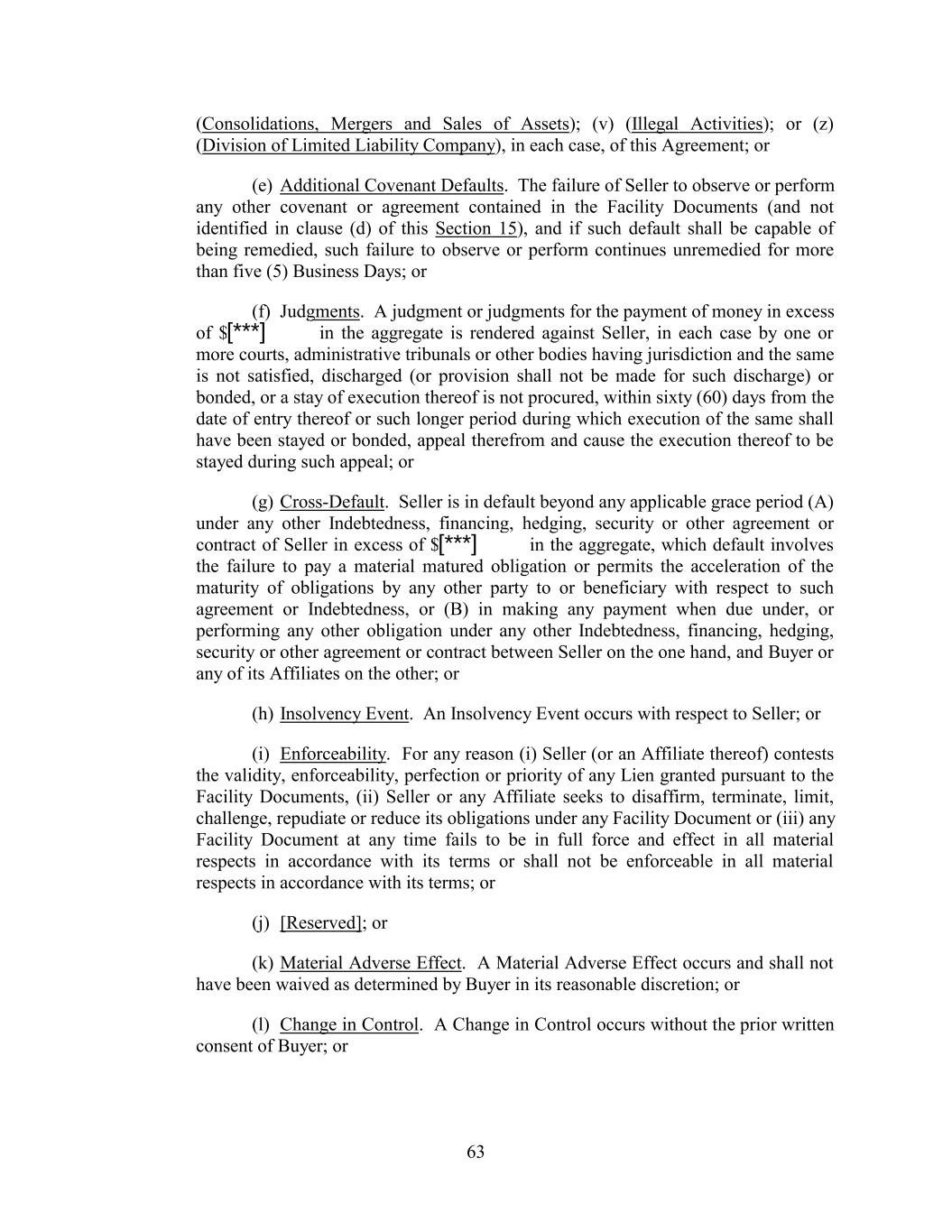 (Consolidations, Mergers and Sales of Assets); (v) (Illegal Activities); or (z) (Division of Limited Liability Company), in each case, of this Agreement; or (e) Additional Covenant Defaults. The failure of Seller to observe or perform any other covenant or agreement contained in the Facility Documents (and not identified in clause (d) of this Section 15), and if such default shall be capable of being remedied, such failure to observe or perform continues unremedied for more than five (5) Business Days; or (f) Judgments. A judgment or judgments for the payment of money in excess of $ in the aggregate is rendered against Seller, in each case by one or more courts, administrative tribunals or other bodies having jurisdiction and the same is not satisfied, discharged (or provision shall not be made for such discharge) or bonded, or a stay of execution thereof is not procured, within sixty (60) days from the date of entry thereof or such longer period during which execution of the same shall have been stayed or bonded, appeal therefrom and cause the execution thereof to be stayed during such appeal; or (g) Cross-Default. Seller is in default beyond any applicable grace period (A) under any other Indebtedness, financing, hedging, security or other agreement or contract of Seller in excess of $ in the aggregate, which default involves the failure to pay a material matured obligation or permits the acceleration of the maturity of obligations by any other party to or beneficiary with respect to such agreement or Indebtedness, or (B) in making any payment when due under, or performing any other obligation under any other Indebtedness, financing, hedging, security or other agreement or contract between Seller on the one hand, and Buyer or any of its Affiliates on the other; or (h) Insolvency Event. An Insolvency Event occurs with respect to Seller; or (i) Enforceability. For any reason (i) Seller (or an Affiliate thereof) contests the validity, enforceability, perfection or priority of any Lien granted pursuant to the Facility Documents, (ii) Seller or any Affiliate seeks to disaffirm, terminate, limit, challenge, repudiate or reduce its obligations under any Facility Document or (iii) any Facility Document at any time fails to be in full force and effect in all material respects in accordance with its terms or shall not be enforceable in all material respects in accordance with its terms; or (j) [Reserved]; or (k) Material Adverse Effect. A Material Adverse Effect occurs and shall not have been waived as determined by Buyer in its reasonable discretion; or (l) Change in Control. A Change in Control occurs without the prior written consent of Buyer; or 63 [***] [***]