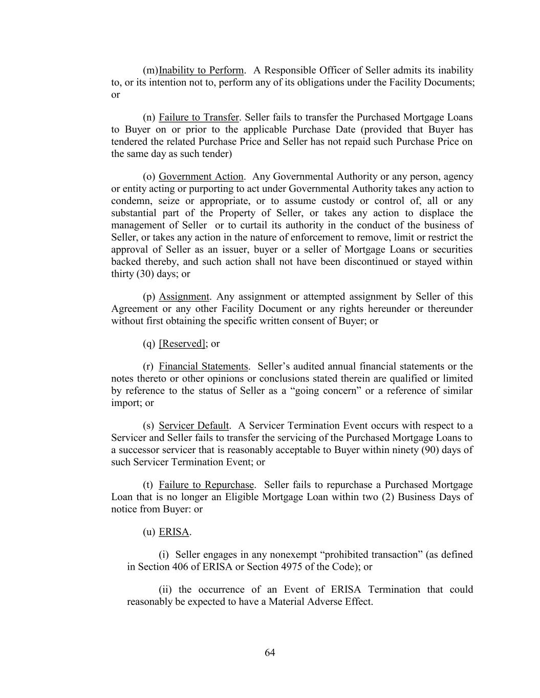 (m)Inability to Perform. A Responsible Officer of Seller admits its inability to, or its intention not to, perform any of its obligations under the Facility Documents; or (n) Failure to Transfer. Seller fails to transfer the Purchased Mortgage Loans to Buyer on or prior to the applicable Purchase Date (provided that Buyer has tendered the related Purchase Price and Seller has not repaid such Purchase Price on the same day as such tender) (o) Government Action. Any Governmental Authority or any person, agency or entity acting or purporting to act under Governmental Authority takes any action to condemn, seize or appropriate, or to assume custody or control of, all or any substantial part of the Property of Seller, or takes any action to displace the management of Seller or to curtail its authority in the conduct of the business of Seller, or takes any action in the nature of enforcement to remove, limit or restrict the approval of Seller as an issuer, buyer or a seller of Mortgage Loans or securities backed thereby, and such action shall not have been discontinued or stayed within thirty (30) days; or (p) Assignment. Any assignment or attempted assignment by Seller of this Agreement or any other Facility Document or any rights hereunder or thereunder without first obtaining the specific written consent of Buyer; or (q) [Reserved]; or (r) Financial Statements. Seller’s audited annual financial statements or the notes thereto or other opinions or conclusions stated therein are qualified or limited by reference to the status of Seller as a “going concern” or a reference of similar import; or (s) Servicer Default. A Servicer Termination Event occurs with respect to a Servicer and Seller fails to transfer the servicing of the Purchased Mortgage Loans to a successor servicer that is reasonably acceptable to Buyer within ninety (90) days of such Servicer Termination Event; or (t) Failure to Repurchase. Seller fails to repurchase a Purchased Mortgage Loan that is no longer an Eligible Mortgage Loan within two (2) Business Days of notice from Buyer: or (u) ERISA. (i) Seller engages in any nonexempt “prohibited transaction” (as defined in Section 406 of ERISA or Section 4975 of the Code); or (ii) the occurrence of an Event of ERISA Termination that could reasonably be expected to have a Material Adverse Effect. 64
