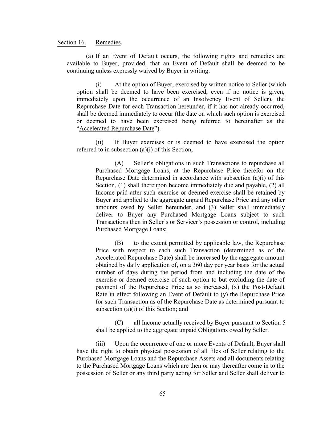 Section 16. Remedies. (a) If an Event of Default occurs, the following rights and remedies are available to Buyer; provided, that an Event of Default shall be deemed to be continuing unless expressly waived by Buyer in writing: (i) At the option of Buyer, exercised by written notice to Seller (which option shall be deemed to have been exercised, even if no notice is given, immediately upon the occurrence of an Insolvency Event of Seller), the Repurchase Date for each Transaction hereunder, if it has not already occurred, shall be deemed immediately to occur (the date on which such option is exercised or deemed to have been exercised being referred to hereinafter as the “Accelerated Repurchase Date”). (ii) If Buyer exercises or is deemed to have exercised the option referred to in subsection (a)(i) of this Section, (A) Seller’s obligations in such Transactions to repurchase all Purchased Mortgage Loans, at the Repurchase Price therefor on the Repurchase Date determined in accordance with subsection (a)(i) of this Section, (1) shall thereupon become immediately due and payable, (2) all Income paid after such exercise or deemed exercise shall be retained by Buyer and applied to the aggregate unpaid Repurchase Price and any other amounts owed by Seller hereunder, and (3) Seller shall immediately deliver to Buyer any Purchased Mortgage Loans subject to such Transactions then in Seller’s or Servicer’s possession or control, including Purchased Mortgage Loans; (B) to the extent permitted by applicable law, the Repurchase Price with respect to each such Transaction (determined as of the Accelerated Repurchase Date) shall be increased by the aggregate amount obtained by daily application of, on a 360 day per year basis for the actual number of days during the period from and including the date of the exercise or deemed exercise of such option to but excluding the date of payment of the Repurchase Price as so increased, (x) the Post-Default Rate in effect following an Event of Default to (y) the Repurchase Price for such Transaction as of the Repurchase Date as determined pursuant to subsection (a)(i) of this Section; and (C) all Income actually received by Buyer pursuant to Section 5 shall be applied to the aggregate unpaid Obligations owed by Seller. (iii) Upon the occurrence of one or more Events of Default, Buyer shall have the right to obtain physical possession of all files of Seller relating to the Purchased Mortgage Loans and the Repurchase Assets and all documents relating to the Purchased Mortgage Loans which are then or may thereafter come in to the possession of Seller or any third party acting for Seller and Seller shall deliver to 65