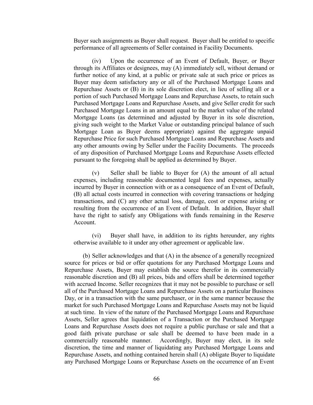 Buyer such assignments as Buyer shall request. Buyer shall be entitled to specific performance of all agreements of Seller contained in Facility Documents. (iv) Upon the occurrence of an Event of Default, Buyer, or Buyer through its Affiliates or designees, may (A) immediately sell, without demand or further notice of any kind, at a public or private sale at such price or prices as Buyer may deem satisfactory any or all of the Purchased Mortgage Loans and Repurchase Assets or (B) in its sole discretion elect, in lieu of selling all or a portion of such Purchased Mortgage Loans and Repurchase Assets, to retain such Purchased Mortgage Loans and Repurchase Assets, and give Seller credit for such Purchased Mortgage Loans in an amount equal to the market value of the related Mortgage Loans (as determined and adjusted by Buyer in its sole discretion, giving such weight to the Market Value or outstanding principal balance of such Mortgage Loan as Buyer deems appropriate) against the aggregate unpaid Repurchase Price for such Purchased Mortgage Loans and Repurchase Assets and any other amounts owing by Seller under the Facility Documents. The proceeds of any disposition of Purchased Mortgage Loans and Repurchase Assets effected pursuant to the foregoing shall be applied as determined by Buyer. (v) Seller shall be liable to Buyer for (A) the amount of all actual expenses, including reasonable documented legal fees and expenses, actually incurred by Buyer in connection with or as a consequence of an Event of Default, (B) all actual costs incurred in connection with covering transactions or hedging transactions, and (C) any other actual loss, damage, cost or expense arising or resulting from the occurrence of an Event of Default. In addition, Buyer shall have the right to satisfy any Obligations with funds remaining in the Reserve Account. (vi) Buyer shall have, in addition to its rights hereunder, any rights otherwise available to it under any other agreement or applicable law. (b) Seller acknowledges and that (A) in the absence of a generally recognized source for prices or bid or offer quotations for any Purchased Mortgage Loans and Repurchase Assets, Buyer may establish the source therefor in its commercially reasonable discretion and (B) all prices, bids and offers shall be determined together with accrued Income. Seller recognizes that it may not be possible to purchase or sell all of the Purchased Mortgage Loans and Repurchase Assets on a particular Business Day, or in a transaction with the same purchaser, or in the same manner because the market for such Purchased Mortgage Loans and Repurchase Assets may not be liquid at such time. In view of the nature of the Purchased Mortgage Loans and Repurchase Assets, Seller agrees that liquidation of a Transaction or the Purchased Mortgage Loans and Repurchase Assets does not require a public purchase or sale and that a good faith private purchase or sale shall be deemed to have been made in a commercially reasonable manner. Accordingly, Buyer may elect, in its sole discretion, the time and manner of liquidating any Purchased Mortgage Loans and Repurchase Assets, and nothing contained herein shall (A) obligate Buyer to liquidate any Purchased Mortgage Loans or Repurchase Assets on the occurrence of an Event 66