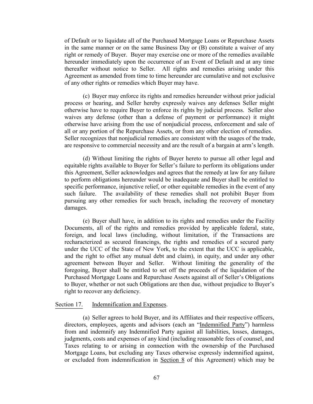 of Default or to liquidate all of the Purchased Mortgage Loans or Repurchase Assets in the same manner or on the same Business Day or (B) constitute a waiver of any right or remedy of Buyer. Buyer may exercise one or more of the remedies available hereunder immediately upon the occurrence of an Event of Default and at any time thereafter without notice to Seller. All rights and remedies arising under this Agreement as amended from time to time hereunder are cumulative and not exclusive of any other rights or remedies which Buyer may have. (c) Buyer may enforce its rights and remedies hereunder without prior judicial process or hearing, and Seller hereby expressly waives any defenses Seller might otherwise have to require Buyer to enforce its rights by judicial process. Seller also waives any defense (other than a defense of payment or performance) it might otherwise have arising from the use of nonjudicial process, enforcement and sale of all or any portion of the Repurchase Assets, or from any other election of remedies. Seller recognizes that nonjudicial remedies are consistent with the usages of the trade, are responsive to commercial necessity and are the result of a bargain at arm’s length. (d) Without limiting the rights of Buyer hereto to pursue all other legal and equitable rights available to Buyer for Seller’s failure to perform its obligations under this Agreement, Seller acknowledges and agrees that the remedy at law for any failure to perform obligations hereunder would be inadequate and Buyer shall be entitled to specific performance, injunctive relief, or other equitable remedies in the event of any such failure. The availability of these remedies shall not prohibit Buyer from pursuing any other remedies for such breach, including the recovery of monetary damages. (e) Buyer shall have, in addition to its rights and remedies under the Facility Documents, all of the rights and remedies provided by applicable federal, state, foreign, and local laws (including, without limitation, if the Transactions are recharacterized as secured financings, the rights and remedies of a secured party under the UCC of the State of New York, to the extent that the UCC is applicable, and the right to offset any mutual debt and claim), in equity, and under any other agreement between Buyer and Seller. Without limiting the generality of the foregoing, Buyer shall be entitled to set off the proceeds of the liquidation of the Purchased Mortgage Loans and Repurchase Assets against all of Seller’s Obligations to Buyer, whether or not such Obligations are then due, without prejudice to Buyer’s right to recover any deficiency. Section 17. Indemnification and Expenses. (a) Seller agrees to hold Buyer, and its Affiliates and their respective officers, directors, employees, agents and advisors (each an “Indemnified Party”) harmless from and indemnify any Indemnified Party against all liabilities, losses, damages, judgments, costs and expenses of any kind (including reasonable fees of counsel, and Taxes relating to or arising in connection with the ownership of the Purchased Mortgage Loans, but excluding any Taxes otherwise expressly indemnified against, or excluded from indemnification in Section 8 of this Agreement) which may be 67