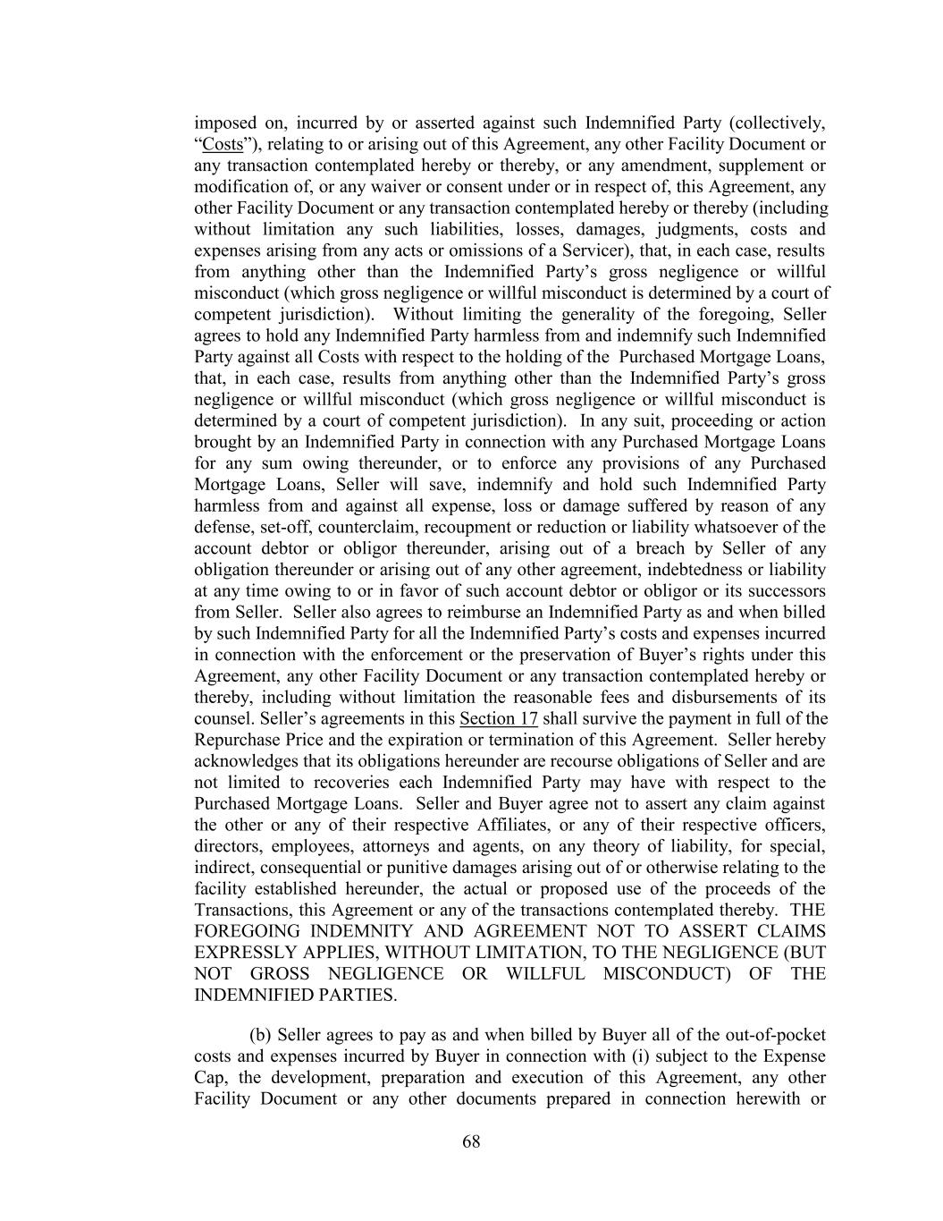imposed on, incurred by or asserted against such Indemnified Party (collectively, “Costs”), relating to or arising out of this Agreement, any other Facility Document or any transaction contemplated hereby or thereby, or any amendment, supplement or modification of, or any waiver or consent under or in respect of, this Agreement, any other Facility Document or any transaction contemplated hereby or thereby (including without limitation any such liabilities, losses, damages, judgments, costs and expenses arising from any acts or omissions of a Servicer), that, in each case, results from anything other than the Indemnified Party’s gross negligence or willful misconduct (which gross negligence or willful misconduct is determined by a court of competent jurisdiction). Without limiting the generality of the foregoing, Seller agrees to hold any Indemnified Party harmless from and indemnify such Indemnified Party against all Costs with respect to the holding of the Purchased Mortgage Loans, that, in each case, results from anything other than the Indemnified Party’s gross negligence or willful misconduct (which gross negligence or willful misconduct is determined by a court of competent jurisdiction). In any suit, proceeding or action brought by an Indemnified Party in connection with any Purchased Mortgage Loans for any sum owing thereunder, or to enforce any provisions of any Purchased Mortgage Loans, Seller will save, indemnify and hold such Indemnified Party harmless from and against all expense, loss or damage suffered by reason of any defense, set-off, counterclaim, recoupment or reduction or liability whatsoever of the account debtor or obligor thereunder, arising out of a breach by Seller of any obligation thereunder or arising out of any other agreement, indebtedness or liability at any time owing to or in favor of such account debtor or obligor or its successors from Seller. Seller also agrees to reimburse an Indemnified Party as and when billed by such Indemnified Party for all the Indemnified Party’s costs and expenses incurred in connection with the enforcement or the preservation of Buyer’s rights under this Agreement, any other Facility Document or any transaction contemplated hereby or thereby, including without limitation the reasonable fees and disbursements of its counsel. Seller’s agreements in this Section 17 shall survive the payment in full of the Repurchase Price and the expiration or termination of this Agreement. Seller hereby acknowledges that its obligations hereunder are recourse obligations of Seller and are not limited to recoveries each Indemnified Party may have with respect to the Purchased Mortgage Loans. Seller and Buyer agree not to assert any claim against the other or any of their respective Affiliates, or any of their respective officers, directors, employees, attorneys and agents, on any theory of liability, for special, indirect, consequential or punitive damages arising out of or otherwise relating to the facility established hereunder, the actual or proposed use of the proceeds of the Transactions, this Agreement or any of the transactions contemplated thereby. THE FOREGOING INDEMNITY AND AGREEMENT NOT TO ASSERT CLAIMS EXPRESSLY APPLIES, WITHOUT LIMITATION, TO THE NEGLIGENCE (BUT NOT GROSS NEGLIGENCE OR WILLFUL MISCONDUCT) OF THE INDEMNIFIED PARTIES. (b) Seller agrees to pay as and when billed by Buyer all of the out-of-pocket costs and expenses incurred by Buyer in connection with (i) subject to the Expense Cap, the development, preparation and execution of this Agreement, any other Facility Document or any other documents prepared in connection herewith or 68