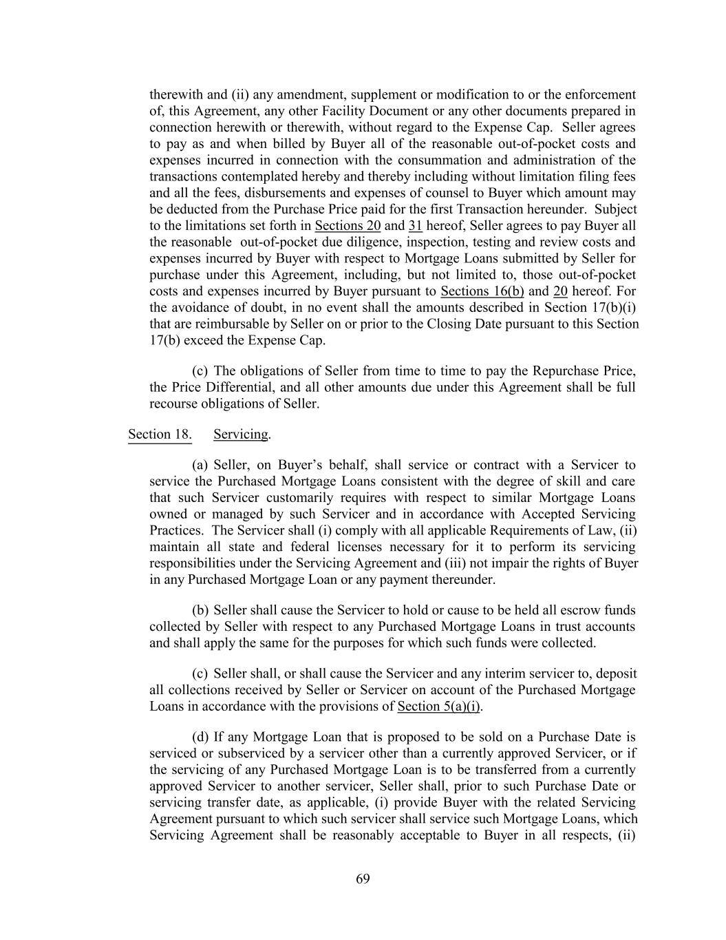 therewith and (ii) any amendment, supplement or modification to or the enforcement of, this Agreement, any other Facility Document or any other documents prepared in connection herewith or therewith, without regard to the Expense Cap. Seller agrees to pay as and when billed by Buyer all of the reasonable out-of-pocket costs and expenses incurred in connection with the consummation and administration of the transactions contemplated hereby and thereby including without limitation filing fees and all the fees, disbursements and expenses of counsel to Buyer which amount may be deducted from the Purchase Price paid for the first Transaction hereunder. Subject to the limitations set forth in Sections 20 and 31 hereof, Seller agrees to pay Buyer all the reasonable out-of-pocket due diligence, inspection, testing and review costs and expenses incurred by Buyer with respect to Mortgage Loans submitted by Seller for purchase under this Agreement, including, but not limited to, those out-of-pocket costs and expenses incurred by Buyer pursuant to Sections 16(b) and 20 hereof. For the avoidance of doubt, in no event shall the amounts described in Section 17(b)(i) that are reimbursable by Seller on or prior to the Closing Date pursuant to this Section 17(b) exceed the Expense Cap. (c) The obligations of Seller from time to time to pay the Repurchase Price, the Price Differential, and all other amounts due under this Agreement shall be full recourse obligations of Seller. Section 18. Servicing. (a) Seller, on Buyer’s behalf, shall service or contract with a Servicer to service the Purchased Mortgage Loans consistent with the degree of skill and care that such Servicer customarily requires with respect to similar Mortgage Loans owned or managed by such Servicer and in accordance with Accepted Servicing Practices. The Servicer shall (i) comply with all applicable Requirements of Law, (ii) maintain all state and federal licenses necessary for it to perform its servicing responsibilities under the Servicing Agreement and (iii) not impair the rights of Buyer in any Purchased Mortgage Loan or any payment thereunder. (b) Seller shall cause the Servicer to hold or cause to be held all escrow funds collected by Seller with respect to any Purchased Mortgage Loans in trust accounts and shall apply the same for the purposes for which such funds were collected. (c) Seller shall, or shall cause the Servicer and any interim servicer to, deposit all collections received by Seller or Servicer on account of the Purchased Mortgage Loans in accordance with the provisions of Section 5(a)(i). (d) If any Mortgage Loan that is proposed to be sold on a Purchase Date is serviced or subserviced by a servicer other than a currently approved Servicer, or if the servicing of any Purchased Mortgage Loan is to be transferred from a currently approved Servicer to another servicer, Seller shall, prior to such Purchase Date or servicing transfer date, as applicable, (i) provide Buyer with the related Servicing Agreement pursuant to which such servicer shall service such Mortgage Loans, which Servicing Agreement shall be reasonably acceptable to Buyer in all respects, (ii) 69