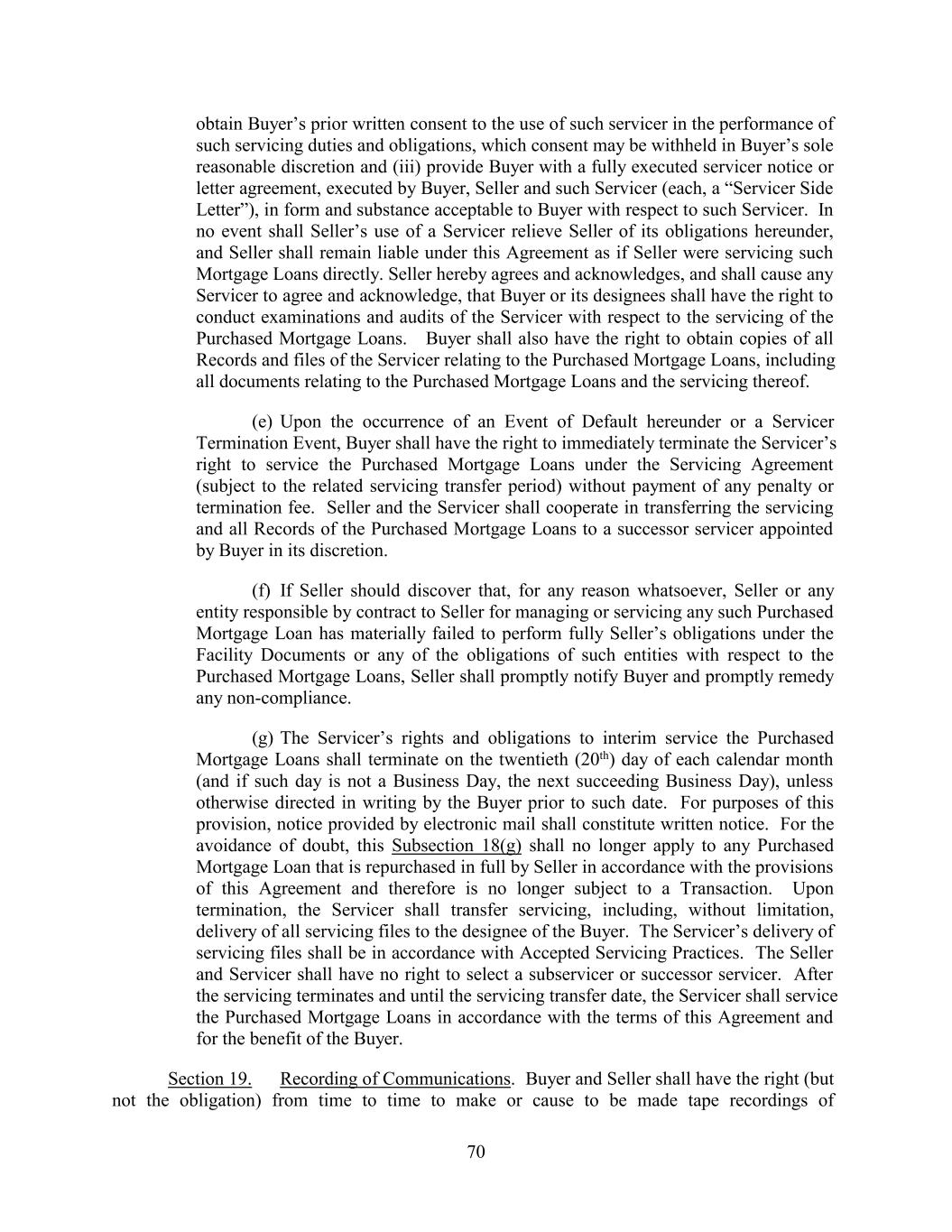 obtain Buyer’s prior written consent to the use of such servicer in the performance of such servicing duties and obligations, which consent may be withheld in Buyer’s sole reasonable discretion and (iii) provide Buyer with a fully executed servicer notice or letter agreement, executed by Buyer, Seller and such Servicer (each, a “Servicer Side Letter”), in form and substance acceptable to Buyer with respect to such Servicer. In no event shall Seller’s use of a Servicer relieve Seller of its obligations hereunder, and Seller shall remain liable under this Agreement as if Seller were servicing such Mortgage Loans directly. Seller hereby agrees and acknowledges, and shall cause any Servicer to agree and acknowledge, that Buyer or its designees shall have the right to conduct examinations and audits of the Servicer with respect to the servicing of the Purchased Mortgage Loans. Buyer shall also have the right to obtain copies of all Records and files of the Servicer relating to the Purchased Mortgage Loans, including all documents relating to the Purchased Mortgage Loans and the servicing thereof. (e) Upon the occurrence of an Event of Default hereunder or a Servicer Termination Event, Buyer shall have the right to immediately terminate the Servicer’s right to service the Purchased Mortgage Loans under the Servicing Agreement (subject to the related servicing transfer period) without payment of any penalty or termination fee. Seller and the Servicer shall cooperate in transferring the servicing and all Records of the Purchased Mortgage Loans to a successor servicer appointed by Buyer in its discretion. (f) If Seller should discover that, for any reason whatsoever, Seller or any entity responsible by contract to Seller for managing or servicing any such Purchased Mortgage Loan has materially failed to perform fully Seller’s obligations under the Facility Documents or any of the obligations of such entities with respect to the Purchased Mortgage Loans, Seller shall promptly notify Buyer and promptly remedy any non-compliance. (g) The Servicer’s rights and obligations to interim service the Purchased Mortgage Loans shall terminate on the twentieth (20th) day of each calendar month (and if such day is not a Business Day, the next succeeding Business Day), unless otherwise directed in writing by the Buyer prior to such date. For purposes of this provision, notice provided by electronic mail shall constitute written notice. For the avoidance of doubt, this Subsection 18(g) shall no longer apply to any Purchased Mortgage Loan that is repurchased in full by Seller in accordance with the provisions of this Agreement and therefore is no longer subject to a Transaction. Upon termination, the Servicer shall transfer servicing, including, without limitation, delivery of all servicing files to the designee of the Buyer. The Servicer’s delivery of servicing files shall be in accordance with Accepted Servicing Practices. The Seller and Servicer shall have no right to select a subservicer or successor servicer. After the servicing terminates and until the servicing transfer date, the Servicer shall service the Purchased Mortgage Loans in accordance with the terms of this Agreement and for the benefit of the Buyer. Section 19. Recording of Communications. Buyer and Seller shall have the right (but not the obligation) from time to time to make or cause to be made tape recordings of 70