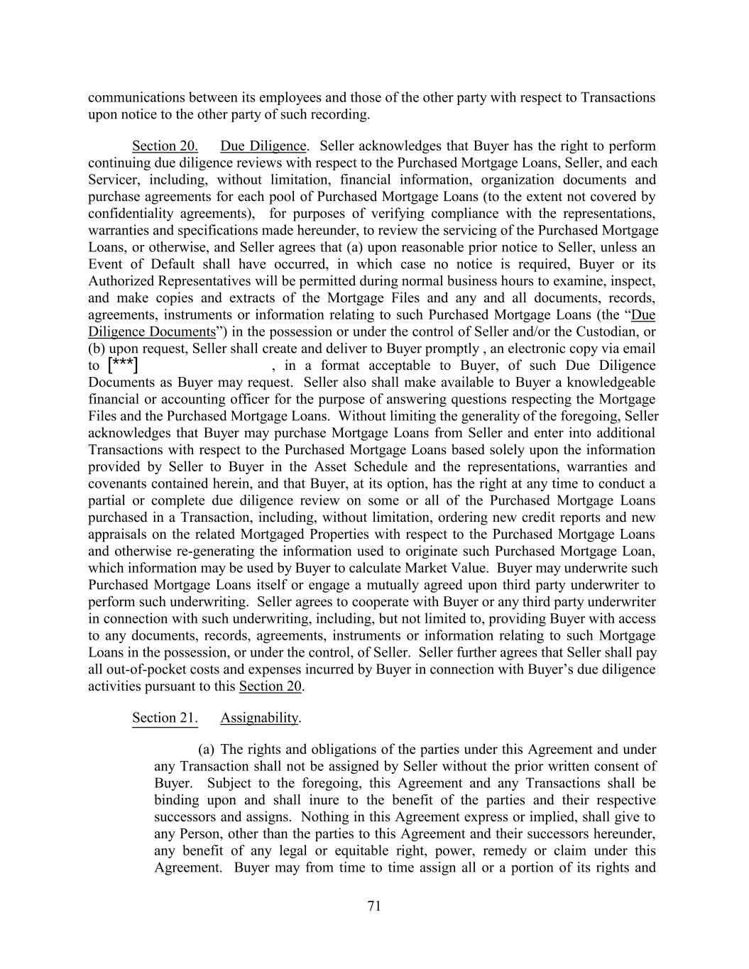 communications between its employees and those of the other party with respect to Transactions upon notice to the other party of such recording. Section 20. Due Diligence. Seller acknowledges that Buyer has the right to perform continuing due diligence reviews with respect to the Purchased Mortgage Loans, Seller, and each Servicer, including, without limitation, financial information, organization documents and purchase agreements for each pool of Purchased Mortgage Loans (to the extent not covered by confidentiality agreements), for purposes of verifying compliance with the representations, warranties and specifications made hereunder, to review the servicing of the Purchased Mortgage Loans, or otherwise, and Seller agrees that (a) upon reasonable prior notice to Seller, unless an Event of Default shall have occurred, in which case no notice is required, Buyer or its Authorized Representatives will be permitted during normal business hours to examine, inspect, and make copies and extracts of the Mortgage Files and any and all documents, records, agreements, instruments or information relating to such Purchased Mortgage Loans (the “Due Diligence Documents”) in the possession or under the control of Seller and/or the Custodian, or (b) upon request, Seller shall create and deliver to Buyer promptly , an electronic copy via email to , in a format acceptable to Buyer, of such Due Diligence Documents as Buyer may request. Seller also shall make available to Buyer a knowledgeable financial or accounting officer for the purpose of answering questions respecting the Mortgage Files and the Purchased Mortgage Loans. Without limiting the generality of the foregoing, Seller acknowledges that Buyer may purchase Mortgage Loans from Seller and enter into additional Transactions with respect to the Purchased Mortgage Loans based solely upon the information provided by Seller to Buyer in the Asset Schedule and the representations, warranties and covenants contained herein, and that Buyer, at its option, has the right at any time to conduct a partial or complete due diligence review on some or all of the Purchased Mortgage Loans purchased in a Transaction, including, without limitation, ordering new credit reports and new appraisals on the related Mortgaged Properties with respect to the Purchased Mortgage Loans and otherwise re-generating the information used to originate such Purchased Mortgage Loan, which information may be used by Buyer to calculate Market Value. Buyer may underwrite such Purchased Mortgage Loans itself or engage a mutually agreed upon third party underwriter to perform such underwriting. Seller agrees to cooperate with Buyer or any third party underwriter in connection with such underwriting, including, but not limited to, providing Buyer with access to any documents, records, agreements, instruments or information relating to such Mortgage Loans in the possession, or under the control, of Seller. Seller further agrees that Seller shall pay all out-of-pocket costs and expenses incurred by Buyer in connection with Buyer’s due diligence activities pursuant to this Section 20. Section 21. Assignability. (a) The rights and obligations of the parties under this Agreement and under any Transaction shall not be assigned by Seller without the prior written consent of Buyer. Subject to the foregoing, this Agreement and any Transactions shall be binding upon and shall inure to the benefit of the parties and their respective successors and assigns. Nothing in this Agreement express or implied, shall give to any Person, other than the parties to this Agreement and their successors hereunder, any benefit of any legal or equitable right, power, remedy or claim under this Agreement. Buyer may from time to time assign all or a portion of its rights and 71 [***]
