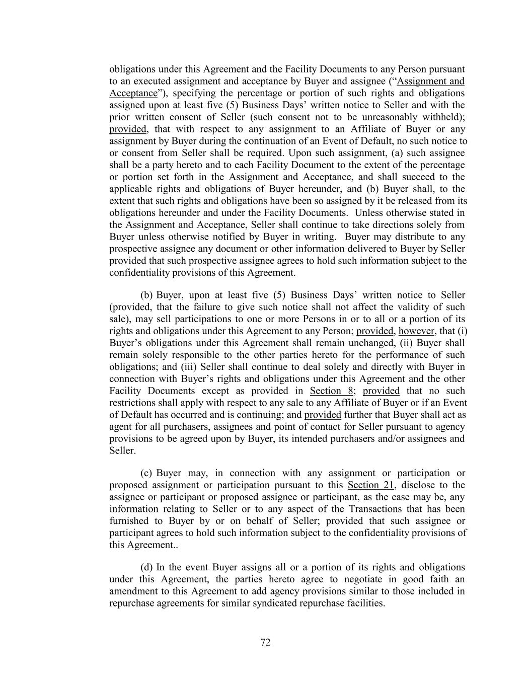 obligations under this Agreement and the Facility Documents to any Person pursuant to an executed assignment and acceptance by Buyer and assignee (“Assignment and Acceptance”), specifying the percentage or portion of such rights and obligations assigned upon at least five (5) Business Days’ written notice to Seller and with the prior written consent of Seller (such consent not to be unreasonably withheld); provided, that with respect to any assignment to an Affiliate of Buyer or any assignment by Buyer during the continuation of an Event of Default, no such notice to or consent from Seller shall be required. Upon such assignment, (a) such assignee shall be a party hereto and to each Facility Document to the extent of the percentage or portion set forth in the Assignment and Acceptance, and shall succeed to the applicable rights and obligations of Buyer hereunder, and (b) Buyer shall, to the extent that such rights and obligations have been so assigned by it be released from its obligations hereunder and under the Facility Documents. Unless otherwise stated in the Assignment and Acceptance, Seller shall continue to take directions solely from Buyer unless otherwise notified by Buyer in writing. Buyer may distribute to any prospective assignee any document or other information delivered to Buyer by Seller provided that such prospective assignee agrees to hold such information subject to the confidentiality provisions of this Agreement. (b) Buyer, upon at least five (5) Business Days’ written notice to Seller (provided, that the failure to give such notice shall not affect the validity of such sale), may sell participations to one or more Persons in or to all or a portion of its rights and obligations under this Agreement to any Person; provided, however, that (i) Buyer’s obligations under this Agreement shall remain unchanged, (ii) Buyer shall remain solely responsible to the other parties hereto for the performance of such obligations; and (iii) Seller shall continue to deal solely and directly with Buyer in connection with Buyer’s rights and obligations under this Agreement and the other Facility Documents except as provided in Section 8; provided that no such restrictions shall apply with respect to any sale to any Affiliate of Buyer or if an Event of Default has occurred and is continuing; and provided further that Buyer shall act as agent for all purchasers, assignees and point of contact for Seller pursuant to agency provisions to be agreed upon by Buyer, its intended purchasers and/or assignees and Seller. (c) Buyer may, in connection with any assignment or participation or proposed assignment or participation pursuant to this Section 21, disclose to the assignee or participant or proposed assignee or participant, as the case may be, any information relating to Seller or to any aspect of the Transactions that has been furnished to Buyer by or on behalf of Seller; provided that such assignee or participant agrees to hold such information subject to the confidentiality provisions of this Agreement.. (d) In the event Buyer assigns all or a portion of its rights and obligations under this Agreement, the parties hereto agree to negotiate in good faith an amendment to this Agreement to add agency provisions similar to those included in repurchase agreements for similar syndicated repurchase facilities. 72