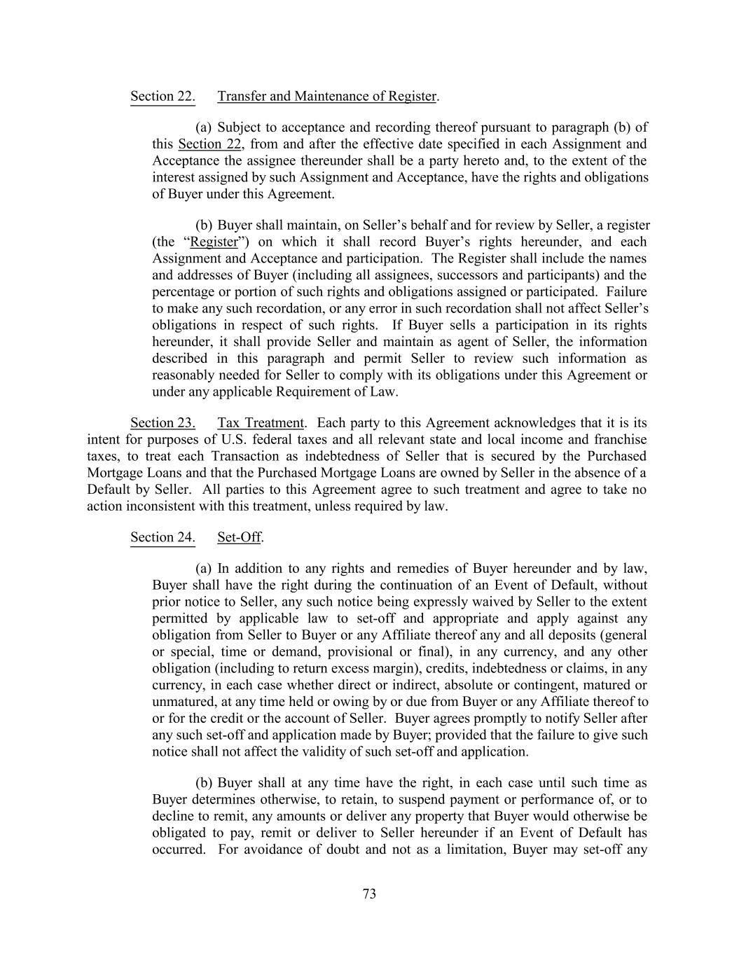 Section 22. Transfer and Maintenance of Register. (a) Subject to acceptance and recording thereof pursuant to paragraph (b) of this Section 22, from and after the effective date specified in each Assignment and Acceptance the assignee thereunder shall be a party hereto and, to the extent of the interest assigned by such Assignment and Acceptance, have the rights and obligations of Buyer under this Agreement. (b) Buyer shall maintain, on Seller’s behalf and for review by Seller, a register (the “Register”) on which it shall record Buyer’s rights hereunder, and each Assignment and Acceptance and participation. The Register shall include the names and addresses of Buyer (including all assignees, successors and participants) and the percentage or portion of such rights and obligations assigned or participated. Failure to make any such recordation, or any error in such recordation shall not affect Seller’s obligations in respect of such rights. If Buyer sells a participation in its rights hereunder, it shall provide Seller and maintain as agent of Seller, the information described in this paragraph and permit Seller to review such information as reasonably needed for Seller to comply with its obligations under this Agreement or under any applicable Requirement of Law. Section 23. Tax Treatment. Each party to this Agreement acknowledges that it is its intent for purposes of U.S. federal taxes and all relevant state and local income and franchise taxes, to treat each Transaction as indebtedness of Seller that is secured by the Purchased Mortgage Loans and that the Purchased Mortgage Loans are owned by Seller in the absence of a Default by Seller. All parties to this Agreement agree to such treatment and agree to take no action inconsistent with this treatment, unless required by law. Section 24. Set-Off. (a) In addition to any rights and remedies of Buyer hereunder and by law, Buyer shall have the right during the continuation of an Event of Default, without prior notice to Seller, any such notice being expressly waived by Seller to the extent permitted by applicable law to set-off and appropriate and apply against any obligation from Seller to Buyer or any Affiliate thereof any and all deposits (general or special, time or demand, provisional or final), in any currency, and any other obligation (including to return excess margin), credits, indebtedness or claims, in any currency, in each case whether direct or indirect, absolute or contingent, matured or unmatured, at any time held or owing by or due from Buyer or any Affiliate thereof to or for the credit or the account of Seller. Buyer agrees promptly to notify Seller after any such set-off and application made by Buyer; provided that the failure to give such notice shall not affect the validity of such set-off and application. (b) Buyer shall at any time have the right, in each case until such time as Buyer determines otherwise, to retain, to suspend payment or performance of, or to decline to remit, any amounts or deliver any property that Buyer would otherwise be obligated to pay, remit or deliver to Seller hereunder if an Event of Default has occurred. For avoidance of doubt and not as a limitation, Buyer may set-off any 73