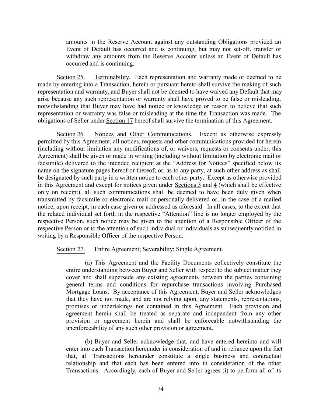 amounts in the Reserve Account against any outstanding Obligations provided an Event of Default has occurred and is continuing, but may not set-off, transfer or withdraw any amounts from the Reserve Account unless an Event of Default has occurred and is continuing. Section 25. Terminability. Each representation and warranty made or deemed to be made by entering into a Transaction, herein or pursuant hereto shall survive the making of such representation and warranty, and Buyer shall not be deemed to have waived any Default that may arise because any such representation or warranty shall have proved to be false or misleading, notwithstanding that Buyer may have had notice or knowledge or reason to believe that such representation or warranty was false or misleading at the time the Transaction was made. The obligations of Seller under Section 17 hereof shall survive the termination of this Agreement. Section 26. Notices and Other Communications. Except as otherwise expressly permitted by this Agreement, all notices, requests and other communications provided for herein (including without limitation any modifications of, or waivers, requests or consents under, this Agreement) shall be given or made in writing (including without limitation by electronic mail or facsimile) delivered to the intended recipient at the “Address for Notices” specified below its name on the signature pages hereof or thereof; or, as to any party, at such other address as shall be designated by such party in a written notice to each other party. Except as otherwise provided in this Agreement and except for notices given under Sections 3 and 4 (which shall be effective only on receipt), all such communications shall be deemed to have been duly given when transmitted by facsimile or electronic mail or personally delivered or, in the case of a mailed notice, upon receipt, in each case given or addressed as aforesaid. In all cases, to the extent that the related individual set forth in the respective “Attention” line is no longer employed by the respective Person, such notice may be given to the attention of a Responsible Officer of the respective Person or to the attention of such individual or individuals as subsequently notified in writing by a Responsible Officer of the respective Person. Section 27. Entire Agreement; Severability; Single Agreement. (a) This Agreement and the Facility Documents collectively constitute the entire understanding between Buyer and Seller with respect to the subject matter they cover and shall supersede any existing agreements between the parties containing general terms and conditions for repurchase transactions involving Purchased Mortgage Loans. By acceptance of this Agreement, Buyer and Seller acknowledges that they have not made, and are not relying upon, any statements, representations, promises or undertakings not contained in this Agreement. Each provision and agreement herein shall be treated as separate and independent from any other provision or agreement herein and shall be enforceable notwithstanding the unenforceability of any such other provision or agreement. (b) Buyer and Seller acknowledge that, and have entered hereinto and will enter into each Transaction hereunder in consideration of and in reliance upon the fact that, all Transactions hereunder constitute a single business and contractual relationship and that each has been entered into in consideration of the other Transactions. Accordingly, each of Buyer and Seller agrees (i) to perform all of its 74