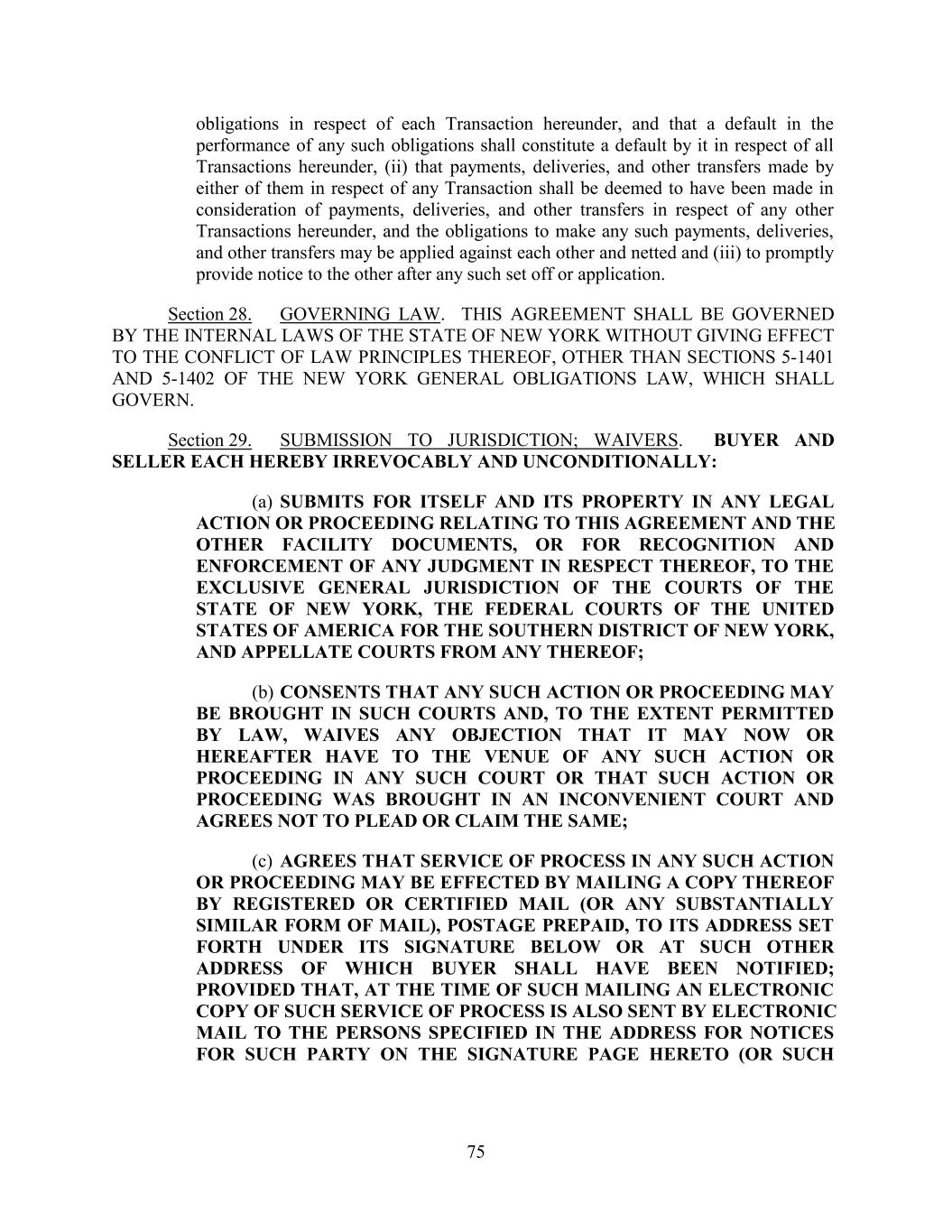 obligations in respect of each Transaction hereunder, and that a default in the performance of any such obligations shall constitute a default by it in respect of all Transactions hereunder, (ii) that payments, deliveries, and other transfers made by either of them in respect of any Transaction shall be deemed to have been made in consideration of payments, deliveries, and other transfers in respect of any other Transactions hereunder, and the obligations to make any such payments, deliveries, and other transfers may be applied against each other and netted and (iii) to promptly provide notice to the other after any such set off or application. Section 28. GOVERNING LAW. THIS AGREEMENT SHALL BE GOVERNED BY THE INTERNAL LAWS OF THE STATE OF NEW YORK WITHOUT GIVING EFFECT TO THE CONFLICT OF LAW PRINCIPLES THEREOF, OTHER THAN SECTIONS 5-1401 AND 5-1402 OF THE NEW YORK GENERAL OBLIGATIONS LAW, WHICH SHALL GOVERN. Section 29. SUBMISSION TO JURISDICTION; WAIVERS. BUYER AND SELLER EACH HEREBY IRREVOCABLY AND UNCONDITIONALLY: (a) SUBMITS FOR ITSELF AND ITS PROPERTY IN ANY LEGAL ACTION OR PROCEEDING RELATING TO THIS AGREEMENT AND THE OTHER FACILITY DOCUMENTS, OR FOR RECOGNITION AND ENFORCEMENT OF ANY JUDGMENT IN RESPECT THEREOF, TO THE EXCLUSIVE GENERAL JURISDICTION OF THE COURTS OF THE STATE OF NEW YORK, THE FEDERAL COURTS OF THE UNITED STATES OF AMERICA FOR THE SOUTHERN DISTRICT OF NEW YORK, AND APPELLATE COURTS FROM ANY THEREOF; (b) CONSENTS THAT ANY SUCH ACTION OR PROCEEDING MAY BE BROUGHT IN SUCH COURTS AND, TO THE EXTENT PERMITTED BY LAW, WAIVES ANY OBJECTION THAT IT MAY NOW OR HEREAFTER HAVE TO THE VENUE OF ANY SUCH ACTION OR PROCEEDING IN ANY SUCH COURT OR THAT SUCH ACTION OR PROCEEDING WAS BROUGHT IN AN INCONVENIENT COURT AND AGREES NOT TO PLEAD OR CLAIM THE SAME; (c) AGREES THAT SERVICE OF PROCESS IN ANY SUCH ACTION OR PROCEEDING MAY BE EFFECTED BY MAILING A COPY THEREOF BY REGISTERED OR CERTIFIED MAIL (OR ANY SUBSTANTIALLY SIMILAR FORM OF MAIL), POSTAGE PREPAID, TO ITS ADDRESS SET FORTH UNDER ITS SIGNATURE BELOW OR AT SUCH OTHER ADDRESS OF WHICH BUYER SHALL HAVE BEEN NOTIFIED; PROVIDED THAT, AT THE TIME OF SUCH MAILING AN ELECTRONIC COPY OF SUCH SERVICE OF PROCESS IS ALSO SENT BY ELECTRONIC MAIL TO THE PERSONS SPECIFIED IN THE ADDRESS FOR NOTICES FOR SUCH PARTY ON THE SIGNATURE PAGE HERETO (OR SUCH 75