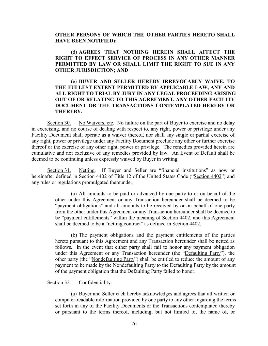OTHER PERSONS OF WHICH THE OTHER PARTIES HERETO SHALL HAVE BEEN NOTIFIED); (d) AGREES THAT NOTHING HEREIN SHALL AFFECT THE RIGHT TO EFFECT SERVICE OF PROCESS IN ANY OTHER MANNER PERMITTED BY LAW OR SHALL LIMIT THE RIGHT TO SUE IN ANY OTHER JURISDICTION; AND (e) BUYER AND SELLER HEREBY IRREVOCABLY WAIVE, TO THE FULLEST EXTENT PERMITTED BY APPLICABLE LAW, ANY AND ALL RIGHT TO TRIAL BY JURY IN ANY LEGAL PROCEEDING ARISING OUT OF OR RELATING TO THIS AGREEMENT, ANY OTHER FACILITY DOCUMENT OR THE TRANSACTIONS CONTEMPLATED HEREBY OR THEREBY. Section 30. No Waivers, etc. No failure on the part of Buyer to exercise and no delay in exercising, and no course of dealing with respect to, any right, power or privilege under any Facility Document shall operate as a waiver thereof, nor shall any single or partial exercise of any right, power or privilege under any Facility Document preclude any other or further exercise thereof or the exercise of any other right, power or privilege. The remedies provided herein are cumulative and not exclusive of any remedies provided by law. An Event of Default shall be deemed to be continuing unless expressly waived by Buyer in writing. Section 31. Netting. If Buyer and Seller are “financial institutions” as now or hereinafter defined in Section 4402 of Title 12 of the United States Code (“Section 4402”) and any rules or regulations promulgated thereunder, (a) All amounts to be paid or advanced by one party to or on behalf of the other under this Agreement or any Transaction hereunder shall be deemed to be “payment obligations” and all amounts to be received by or on behalf of one party from the other under this Agreement or any Transaction hereunder shall be deemed to be “payment entitlements” within the meaning of Section 4402, and this Agreement shall be deemed to be a “netting contract” as defined in Section 4402. (b) The payment obligations and the payment entitlements of the parties hereto pursuant to this Agreement and any Transaction hereunder shall be netted as follows. In the event that either party shall fail to honor any payment obligation under this Agreement or any Transaction hereunder (the “Defaulting Party”), the other party (the “Nondefaulting Party”) shall be entitled to reduce the amount of any payment to be made by the Nondefaulting Party to the Defaulting Party by the amount of the payment obligation that the Defaulting Party failed to honor. Section 32. Confidentiality. (a) Buyer and Seller each hereby acknowledges and agrees that all written or computer-readable information provided by one party to any other regarding the terms set forth in any of the Facility Documents or the Transactions contemplated thereby or pursuant to the terms thereof, including, but not limited to, the name of, or 76