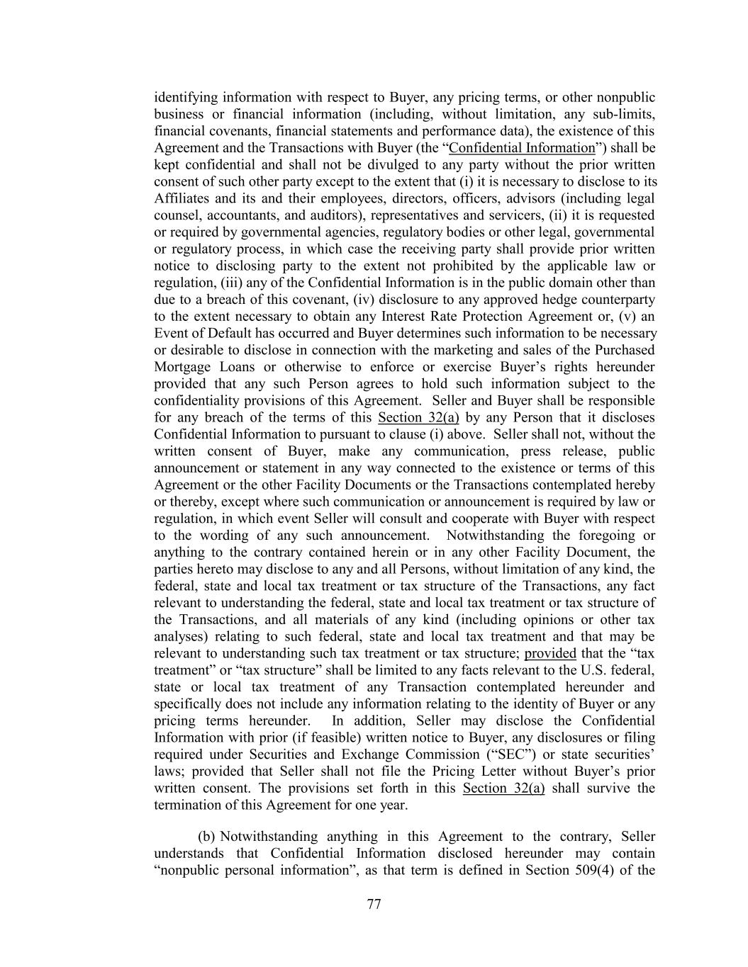 identifying information with respect to Buyer, any pricing terms, or other nonpublic business or financial information (including, without limitation, any sub-limits, financial covenants, financial statements and performance data), the existence of this Agreement and the Transactions with Buyer (the “Confidential Information”) shall be kept confidential and shall not be divulged to any party without the prior written consent of such other party except to the extent that (i) it is necessary to disclose to its Affiliates and its and their employees, directors, officers, advisors (including legal counsel, accountants, and auditors), representatives and servicers, (ii) it is requested or required by governmental agencies, regulatory bodies or other legal, governmental or regulatory process, in which case the receiving party shall provide prior written notice to disclosing party to the extent not prohibited by the applicable law or regulation, (iii) any of the Confidential Information is in the public domain other than due to a breach of this covenant, (iv) disclosure to any approved hedge counterparty to the extent necessary to obtain any Interest Rate Protection Agreement or, (v) an Event of Default has occurred and Buyer determines such information to be necessary or desirable to disclose in connection with the marketing and sales of the Purchased Mortgage Loans or otherwise to enforce or exercise Buyer’s rights hereunder provided that any such Person agrees to hold such information subject to the confidentiality provisions of this Agreement. Seller and Buyer shall be responsible for any breach of the terms of this Section 32(a) by any Person that it discloses Confidential Information to pursuant to clause (i) above. Seller shall not, without the written consent of Buyer, make any communication, press release, public announcement or statement in any way connected to the existence or terms of this Agreement or the other Facility Documents or the Transactions contemplated hereby or thereby, except where such communication or announcement is required by law or regulation, in which event Seller will consult and cooperate with Buyer with respect to the wording of any such announcement. Notwithstanding the foregoing or anything to the contrary contained herein or in any other Facility Document, the parties hereto may disclose to any and all Persons, without limitation of any kind, the federal, state and local tax treatment or tax structure of the Transactions, any fact relevant to understanding the federal, state and local tax treatment or tax structure of the Transactions, and all materials of any kind (including opinions or other tax analyses) relating to such federal, state and local tax treatment and that may be relevant to understanding such tax treatment or tax structure; provided that the “tax treatment” or “tax structure” shall be limited to any facts relevant to the U.S. federal, state or local tax treatment of any Transaction contemplated hereunder and specifically does not include any information relating to the identity of Buyer or any pricing terms hereunder. In addition, Seller may disclose the Confidential Information with prior (if feasible) written notice to Buyer, any disclosures or filing required under Securities and Exchange Commission (“SEC”) or state securities’ laws; provided that Seller shall not file the Pricing Letter without Buyer’s prior written consent. The provisions set forth in this Section 32(a) shall survive the termination of this Agreement for one year. (b) Notwithstanding anything in this Agreement to the contrary, Seller understands that Confidential Information disclosed hereunder may contain “nonpublic personal information”, as that term is defined in Section 509(4) of the 77