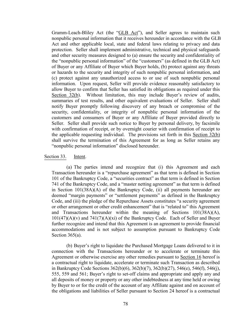 Gramm-Leach-Bliley Act (the “GLB Act”), and Seller agrees to maintain such nonpublic personal information that it receives hereunder in accordance with the GLB Act and other applicable local, state and federal laws relating to privacy and data protection. Seller shall implement administrative, technical and physical safeguards and other security measures designed to (a) ensure the security and confidentiality of the “nonpublic personal information” of the “customers” (as defined in the GLB Act) of Buyer or any Affiliate of Buyer which Buyer holds, (b) protect against any threats or hazards to the security and integrity of such nonpublic personal information, and (c) protect against any unauthorized access to or use of such nonpublic personal information. Upon request, Seller will provide evidence reasonably satisfactory to allow Buyer to confirm that Seller has satisfied its obligations as required under this Section 32(b). Without limitation, this may include Buyer’s review of audits, summaries of test results, and other equivalent evaluations of Seller. Seller shall notify Buyer promptly following discovery of any breach or compromise of the security, confidentiality, or integrity of nonpublic personal information of the customers and consumers of Buyer or any Affiliate of Buyer provided directly to Seller. Seller shall provide such notice to Buyer by personal delivery, by facsimile with confirmation of receipt, or by overnight courier with confirmation of receipt to the applicable requesting individual. The provisions set forth in this Section 32(b) shall survive the termination of this Agreement for as long as Seller retains any “nonpublic personal information” disclosed hereunder. Section 33. Intent. (a) The parties intend and recognize that (i) this Agreement and each Transaction hereunder is a “repurchase agreement” as that term is defined in Section 101 of the Bankruptcy Code, a “securities contract” as that term is defined in Section 741 of the Bankruptcy Code, and a “master netting agreement” as that term is defined in Section 101(38A)(A) of the Bankruptcy Code, (ii) all payments hereunder are deemed “margin payments” or “settlement payments” as defined in the Bankruptcy Code, and (iii) the pledge of the Repurchase Assets constitutes “a security agreement or other arrangement or other credit enhancement” that is “related to” this Agreement and Transactions hereunder within the meaning of Sections 101(38A)(A), 101(47)(A)(v) and 741(7)(A)(xi) of the Bankruptcy Code. Each of Seller and Buyer further recognize and intend that this Agreement is an agreement to provide financial accommodations and is not subject to assumption pursuant to Bankruptcy Code Section 365(a). (b) Buyer’s right to liquidate the Purchased Mortgage Loans delivered to it in connection with the Transactions hereunder or to accelerate or terminate this Agreement or otherwise exercise any other remedies pursuant to Section 16 hereof is a contractual right to liquidate, accelerate or terminate such Transaction as described in Bankruptcy Code Sections 362(b)(6), 362(b)(7), 362(b)(27), 546(e), 546(f), 546(j), 555, 559 and 561; Buyer’s right to set-off claims and appropriate and apply any and all deposits of money or property or any other indebtedness at any time held or owing by Buyer to or for the credit of the account of any Affiliate against and on account of the obligations and liabilities of Seller pursuant to Section 24 hereof is a contractual 78