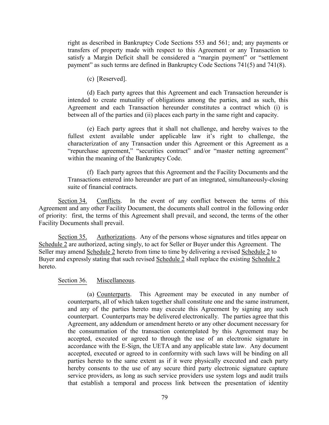 right as described in Bankruptcy Code Sections 553 and 561; and; any payments or transfers of property made with respect to this Agreement or any Transaction to satisfy a Margin Deficit shall be considered a “margin payment” or “settlement payment” as such terms are defined in Bankruptcy Code Sections 741(5) and 741(8). (c) [Reserved]. (d) Each party agrees that this Agreement and each Transaction hereunder is intended to create mutuality of obligations among the parties, and as such, this Agreement and each Transaction hereunder constitutes a contract which (i) is between all of the parties and (ii) places each party in the same right and capacity. (e) Each party agrees that it shall not challenge, and hereby waives to the fullest extent available under applicable law it’s right to challenge, the characterization of any Transaction under this Agreement or this Agreement as a “repurchase agreement,” “securities contract” and/or “master netting agreement” within the meaning of the Bankruptcy Code. (f) Each party agrees that this Agreement and the Facility Documents and the Transactions entered into hereunder are part of an integrated, simultaneously-closing suite of financial contracts. Section 34. Conflicts. In the event of any conflict between the terms of this Agreement and any other Facility Document, the documents shall control in the following order of priority: first, the terms of this Agreement shall prevail, and second, the terms of the other Facility Documents shall prevail. Section 35. Authorizations. Any of the persons whose signatures and titles appear on Schedule 2 are authorized, acting singly, to act for Seller or Buyer under this Agreement. The Seller may amend Schedule 2 hereto from time to time by delivering a revised Schedule 2 to Buyer and expressly stating that such revised Schedule 2 shall replace the existing Schedule 2 hereto. Section 36. Miscellaneous. (a) Counterparts. This Agreement may be executed in any number of counterparts, all of which taken together shall constitute one and the same instrument, and any of the parties hereto may execute this Agreement by signing any such counterpart. Counterparts may be delivered electronically. The parties agree that this Agreement, any addendum or amendment hereto or any other document necessary for the consummation of the transaction contemplated by this Agreement may be accepted, executed or agreed to through the use of an electronic signature in accordance with the E-Sign, the UETA and any applicable state law. Any document accepted, executed or agreed to in conformity with such laws will be binding on all parties hereto to the same extent as if it were physically executed and each party hereby consents to the use of any secure third party electronic signature capture service providers, as long as such service providers use system logs and audit trails that establish a temporal and process link between the presentation of identity 79