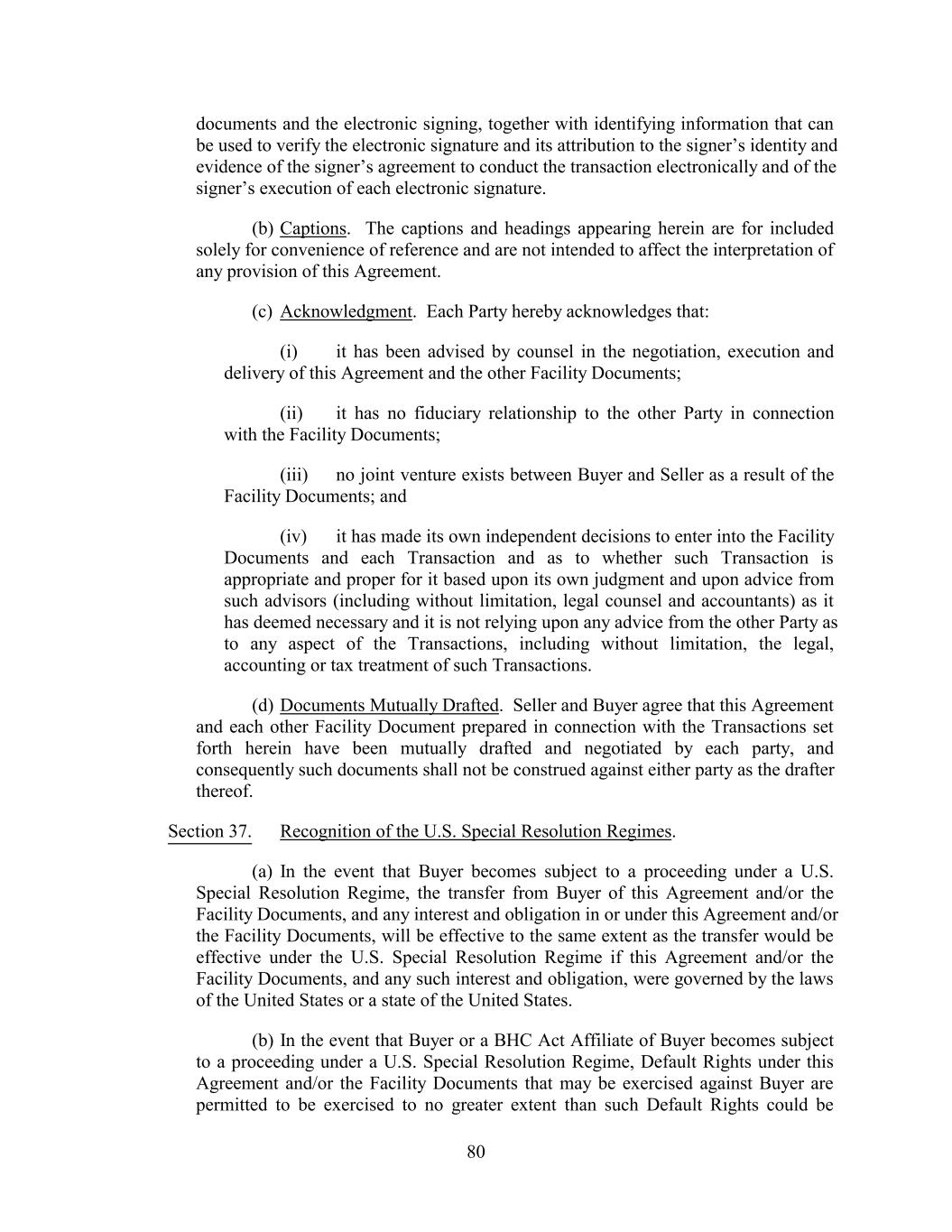 documents and the electronic signing, together with identifying information that can be used to verify the electronic signature and its attribution to the signer’s identity and evidence of the signer’s agreement to conduct the transaction electronically and of the signer’s execution of each electronic signature. (b) Captions. The captions and headings appearing herein are for included solely for convenience of reference and are not intended to affect the interpretation of any provision of this Agreement. (c) Acknowledgment. Each Party hereby acknowledges that: (i) it has been advised by counsel in the negotiation, execution and delivery of this Agreement and the other Facility Documents; (ii) it has no fiduciary relationship to the other Party in connection with the Facility Documents; (iii) no joint venture exists between Buyer and Seller as a result of the Facility Documents; and (iv) it has made its own independent decisions to enter into the Facility Documents and each Transaction and as to whether such Transaction is appropriate and proper for it based upon its own judgment and upon advice from such advisors (including without limitation, legal counsel and accountants) as it has deemed necessary and it is not relying upon any advice from the other Party as to any aspect of the Transactions, including without limitation, the legal, accounting or tax treatment of such Transactions. (d) Documents Mutually Drafted. Seller and Buyer agree that this Agreement and each other Facility Document prepared in connection with the Transactions set forth herein have been mutually drafted and negotiated by each party, and consequently such documents shall not be construed against either party as the drafter thereof. Section 37. Recognition of the U.S. Special Resolution Regimes. (a) In the event that Buyer becomes subject to a proceeding under a U.S. Special Resolution Regime, the transfer from Buyer of this Agreement and/or the Facility Documents, and any interest and obligation in or under this Agreement and/or the Facility Documents, will be effective to the same extent as the transfer would be effective under the U.S. Special Resolution Regime if this Agreement and/or the Facility Documents, and any such interest and obligation, were governed by the laws of the United States or a state of the United States. (b) In the event that Buyer or a BHC Act Affiliate of Buyer becomes subject to a proceeding under a U.S. Special Resolution Regime, Default Rights under this Agreement and/or the Facility Documents that may be exercised against Buyer are permitted to be exercised to no greater extent than such Default Rights could be 80