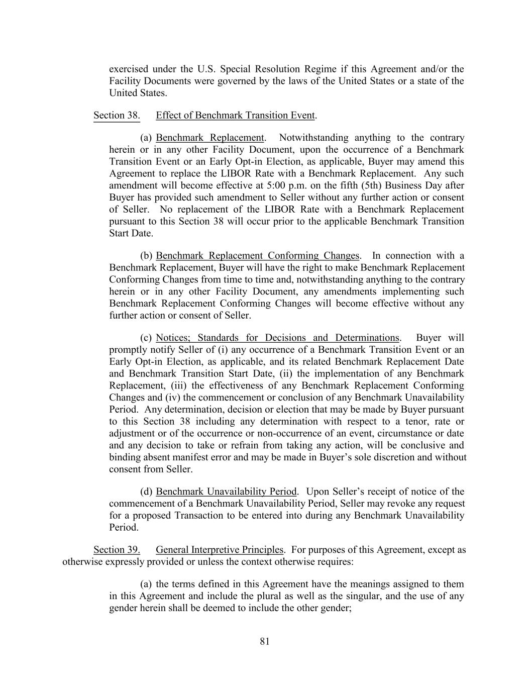 exercised under the U.S. Special Resolution Regime if this Agreement and/or the Facility Documents were governed by the laws of the United States or a state of the United States. Section 38. Effect of Benchmark Transition Event. (a) Benchmark Replacement. Notwithstanding anything to the contrary herein or in any other Facility Document, upon the occurrence of a Benchmark Transition Event or an Early Opt-in Election, as applicable, Buyer may amend this Agreement to replace the LIBOR Rate with a Benchmark Replacement. Any such amendment will become effective at 5:00 p.m. on the fifth (5th) Business Day after Buyer has provided such amendment to Seller without any further action or consent of Seller. No replacement of the LIBOR Rate with a Benchmark Replacement pursuant to this Section 38 will occur prior to the applicable Benchmark Transition Start Date. (b) Benchmark Replacement Conforming Changes. In connection with a Benchmark Replacement, Buyer will have the right to make Benchmark Replacement Conforming Changes from time to time and, notwithstanding anything to the contrary herein or in any other Facility Document, any amendments implementing such Benchmark Replacement Conforming Changes will become effective without any further action or consent of Seller. (c) Notices; Standards for Decisions and Determinations. Buyer will promptly notify Seller of (i) any occurrence of a Benchmark Transition Event or an Early Opt-in Election, as applicable, and its related Benchmark Replacement Date and Benchmark Transition Start Date, (ii) the implementation of any Benchmark Replacement, (iii) the effectiveness of any Benchmark Replacement Conforming Changes and (iv) the commencement or conclusion of any Benchmark Unavailability Period. Any determination, decision or election that may be made by Buyer pursuant to this Section 38 including any determination with respect to a tenor, rate or adjustment or of the occurrence or non-occurrence of an event, circumstance or date and any decision to take or refrain from taking any action, will be conclusive and binding absent manifest error and may be made in Buyer’s sole discretion and without consent from Seller. (d) Benchmark Unavailability Period. Upon Seller’s receipt of notice of the commencement of a Benchmark Unavailability Period, Seller may revoke any request for a proposed Transaction to be entered into during any Benchmark Unavailability Period. Section 39. General Interpretive Principles. For purposes of this Agreement, except as otherwise expressly provided or unless the context otherwise requires: (a) the terms defined in this Agreement have the meanings assigned to them in this Agreement and include the plural as well as the singular, and the use of any gender herein shall be deemed to include the other gender; 81