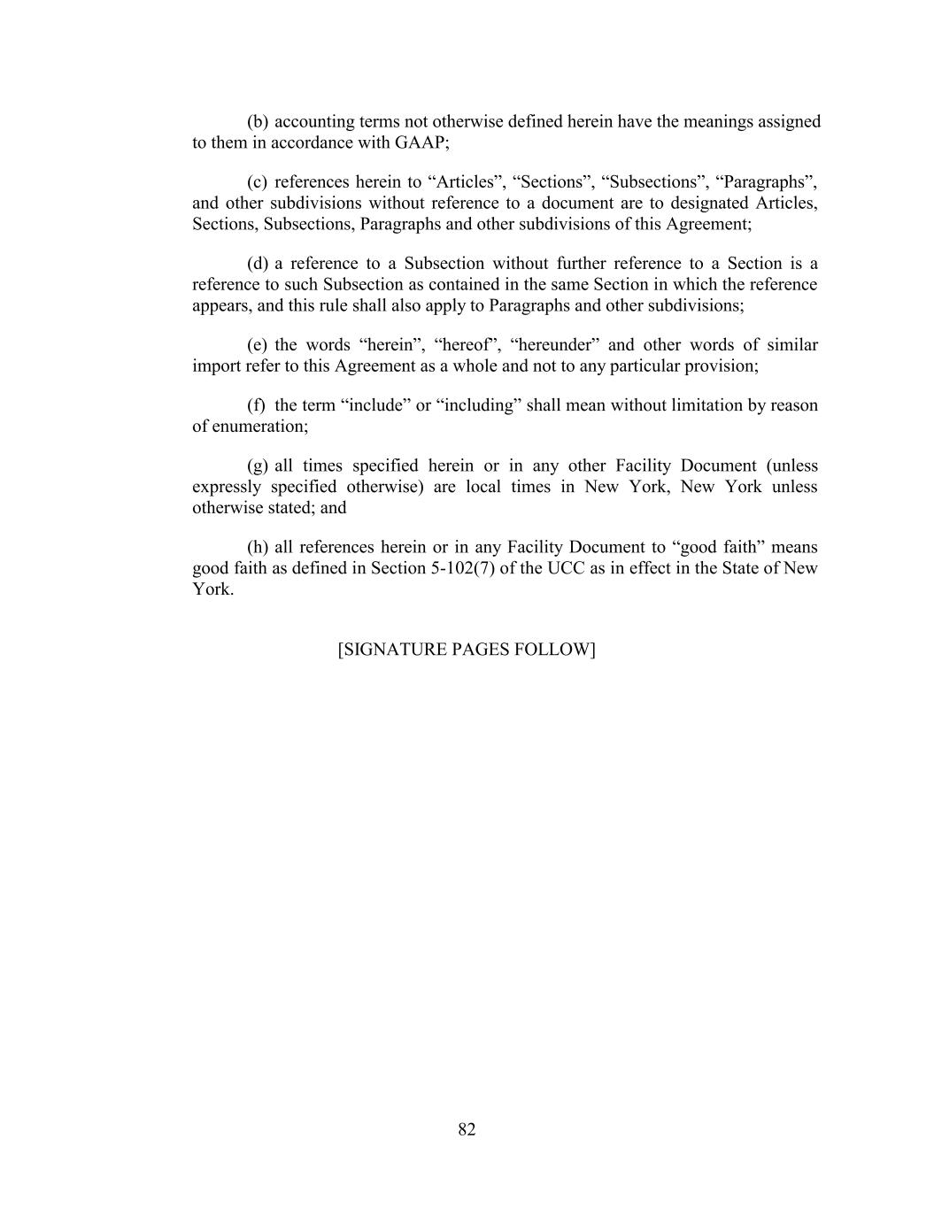 (b) accounting terms not otherwise defined herein have the meanings assigned to them in accordance with GAAP; (c) references herein to “Articles”, “Sections”, “Subsections”, “Paragraphs”, and other subdivisions without reference to a document are to designated Articles, Sections, Subsections, Paragraphs and other subdivisions of this Agreement; (d) a reference to a Subsection without further reference to a Section is a reference to such Subsection as contained in the same Section in which the reference appears, and this rule shall also apply to Paragraphs and other subdivisions; (e) the words “herein”, “hereof”, “hereunder” and other words of similar import refer to this Agreement as a whole and not to any particular provision; (f) the term “include” or “including” shall mean without limitation by reason of enumeration; (g) all times specified herein or in any other Facility Document (unless expressly specified otherwise) are local times in New York, New York unless otherwise stated; and (h) all references herein or in any Facility Document to “good faith” means good faith as defined in Section 5-102(7) of the UCC as in effect in the State of New York. [SIGNATURE PAGES FOLLOW] 82