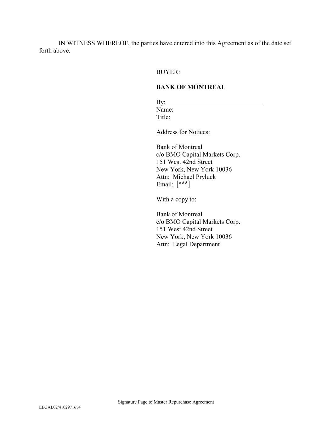 IN WITNESS WHEREOF, the parties have entered into this Agreement as of the date set forth above. BUYER: BANK OF MONTREAL By: Name: Title: Address for Notices: Bank of Montreal c/o BMO Capital Markets Corp. 151 West 42nd Street New York, New York 10036 Attn: Michael Pryluck Email: With a copy to: Bank of Montreal c/o BMO Capital Markets Corp. 151 West 42nd Street New York, New York 10036 Attn: Legal Department Signature Page to Master Repurchase Agreement LEGAL02/41029716v4 [***]