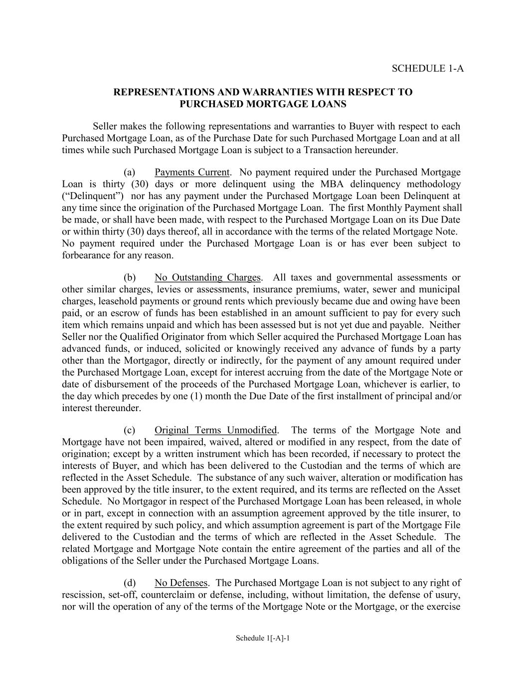 SCHEDULE 1-A REPRESENTATIONS AND WARRANTIES WITH RESPECT TO PURCHASED MORTGAGE LOANS Seller makes the following representations and warranties to Buyer with respect to each Purchased Mortgage Loan, as of the Purchase Date for such Purchased Mortgage Loan and at all times while such Purchased Mortgage Loan is subject to a Transaction hereunder. (a) Payments Current. No payment required under the Purchased Mortgage Loan is thirty (30) days or more delinquent using the MBA delinquency methodology (“Delinquent”) nor has any payment under the Purchased Mortgage Loan been Delinquent at any time since the origination of the Purchased Mortgage Loan. The first Monthly Payment shall be made, or shall have been made, with respect to the Purchased Mortgage Loan on its Due Date or within thirty (30) days thereof, all in accordance with the terms of the related Mortgage Note. No payment required under the Purchased Mortgage Loan is or has ever been subject to forbearance for any reason. (b) No Outstanding Charges. All taxes and governmental assessments or other similar charges, levies or assessments, insurance premiums, water, sewer and municipal charges, leasehold payments or ground rents which previously became due and owing have been paid, or an escrow of funds has been established in an amount sufficient to pay for every such item which remains unpaid and which has been assessed but is not yet due and payable. Neither Seller nor the Qualified Originator from which Seller acquired the Purchased Mortgage Loan has advanced funds, or induced, solicited or knowingly received any advance of funds by a party other than the Mortgagor, directly or indirectly, for the payment of any amount required under the Purchased Mortgage Loan, except for interest accruing from the date of the Mortgage Note or date of disbursement of the proceeds of the Purchased Mortgage Loan, whichever is earlier, to the day which precedes by one (1) month the Due Date of the first installment of principal and/or interest thereunder. (c) Original Terms Unmodified. The terms of the Mortgage Note and Mortgage have not been impaired, waived, altered or modified in any respect, from the date of origination; except by a written instrument which has been recorded, if necessary to protect the interests of Buyer, and which has been delivered to the Custodian and the terms of which are reflected in the Asset Schedule. The substance of any such waiver, alteration or modification has been approved by the title insurer, to the extent required, and its terms are reflected on the Asset Schedule. No Mortgagor in respect of the Purchased Mortgage Loan has been released, in whole or in part, except in connection with an assumption agreement approved by the title insurer, to the extent required by such policy, and which assumption agreement is part of the Mortgage File delivered to the Custodian and the terms of which are reflected in the Asset Schedule. The related Mortgage and Mortgage Note contain the entire agreement of the parties and all of the obligations of the Seller under the Purchased Mortgage Loans. (d) No Defenses. The Purchased Mortgage Loan is not subject to any right of rescission, set-off, counterclaim or defense, including, without limitation, the defense of usury, nor will the operation of any of the terms of the Mortgage Note or the Mortgage, or the exercise Schedule 1[-A]-1
