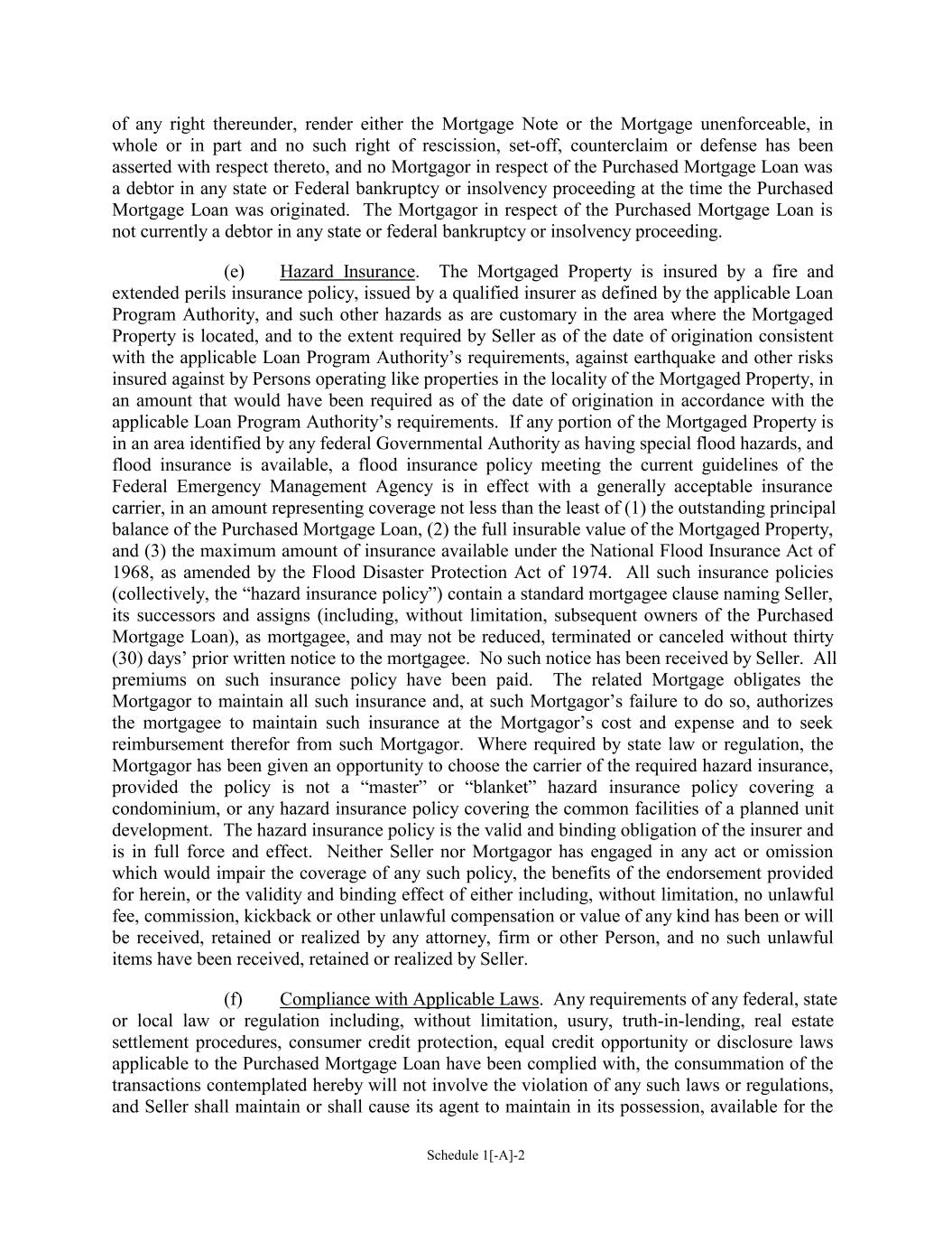 of any right thereunder, render either the Mortgage Note or the Mortgage unenforceable, in whole or in part and no such right of rescission, set-off, counterclaim or defense has been asserted with respect thereto, and no Mortgagor in respect of the Purchased Mortgage Loan was a debtor in any state or Federal bankruptcy or insolvency proceeding at the time the Purchased Mortgage Loan was originated. The Mortgagor in respect of the Purchased Mortgage Loan is not currently a debtor in any state or federal bankruptcy or insolvency proceeding. (e) Hazard Insurance. The Mortgaged Property is insured by a fire and extended perils insurance policy, issued by a qualified insurer as defined by the applicable Loan Program Authority, and such other hazards as are customary in the area where the Mortgaged Property is located, and to the extent required by Seller as of the date of origination consistent with the applicable Loan Program Authority’s requirements, against earthquake and other risks insured against by Persons operating like properties in the locality of the Mortgaged Property, in an amount that would have been required as of the date of origination in accordance with the applicable Loan Program Authority’s requirements. If any portion of the Mortgaged Property is in an area identified by any federal Governmental Authority as having special flood hazards, and flood insurance is available, a flood insurance policy meeting the current guidelines of the Federal Emergency Management Agency is in effect with a generally acceptable insurance carrier, in an amount representing coverage not less than the least of (1) the outstanding principal balance of the Purchased Mortgage Loan, (2) the full insurable value of the Mortgaged Property, and (3) the maximum amount of insurance available under the National Flood Insurance Act of 1968, as amended by the Flood Disaster Protection Act of 1974. All such insurance policies (collectively, the “hazard insurance policy”) contain a standard mortgagee clause naming Seller, its successors and assigns (including, without limitation, subsequent owners of the Purchased Mortgage Loan), as mortgagee, and may not be reduced, terminated or canceled without thirty (30) days’ prior written notice to the mortgagee. No such notice has been received by Seller. All premiums on such insurance policy have been paid. The related Mortgage obligates the Mortgagor to maintain all such insurance and, at such Mortgagor’s failure to do so, authorizes the mortgagee to maintain such insurance at the Mortgagor’s cost and expense and to seek reimbursement therefor from such Mortgagor. Where required by state law or regulation, the Mortgagor has been given an opportunity to choose the carrier of the required hazard insurance, provided the policy is not a “master” or “blanket” hazard insurance policy covering a condominium, or any hazard insurance policy covering the common facilities of a planned unit development. The hazard insurance policy is the valid and binding obligation of the insurer and is in full force and effect. Neither Seller nor Mortgagor has engaged in any act or omission which would impair the coverage of any such policy, the benefits of the endorsement provided for herein, or the validity and binding effect of either including, without limitation, no unlawful fee, commission, kickback or other unlawful compensation or value of any kind has been or will be received, retained or realized by any attorney, firm or other Person, and no such unlawful items have been received, retained or realized by Seller. (f) Compliance with Applicable Laws. Any requirements of any federal, state or local law or regulation including, without limitation, usury, truth-in-lending, real estate settlement procedures, consumer credit protection, equal credit opportunity or disclosure laws applicable to the Purchased Mortgage Loan have been complied with, the consummation of the transactions contemplated hereby will not involve the violation of any such laws or regulations, and Seller shall maintain or shall cause its agent to maintain in its possession, available for the Schedule 1[-A]-2