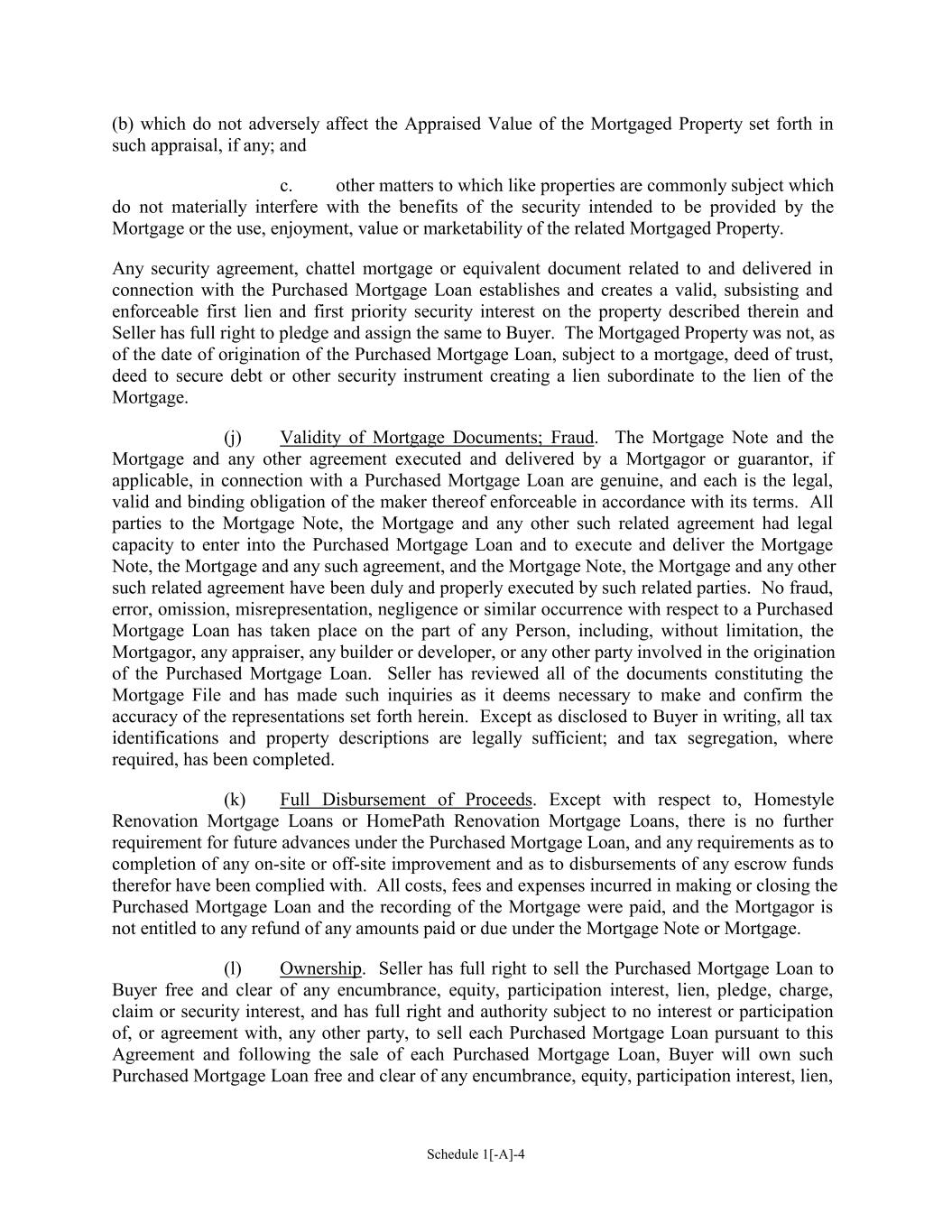 (b) which do not adversely affect the Appraised Value of the Mortgaged Property set forth in such appraisal, if any; and c. other matters to which like properties are commonly subject which do not materially interfere with the benefits of the security intended to be provided by the Mortgage or the use, enjoyment, value or marketability of the related Mortgaged Property. Any security agreement, chattel mortgage or equivalent document related to and delivered in connection with the Purchased Mortgage Loan establishes and creates a valid, subsisting and enforceable first lien and first priority security interest on the property described therein and Seller has full right to pledge and assign the same to Buyer. The Mortgaged Property was not, as of the date of origination of the Purchased Mortgage Loan, subject to a mortgage, deed of trust, deed to secure debt or other security instrument creating a lien subordinate to the lien of the Mortgage. (j) Validity of Mortgage Documents; Fraud. The Mortgage Note and the Mortgage and any other agreement executed and delivered by a Mortgagor or guarantor, if applicable, in connection with a Purchased Mortgage Loan are genuine, and each is the legal, valid and binding obligation of the maker thereof enforceable in accordance with its terms. All parties to the Mortgage Note, the Mortgage and any other such related agreement had legal capacity to enter into the Purchased Mortgage Loan and to execute and deliver the Mortgage Note, the Mortgage and any such agreement, and the Mortgage Note, the Mortgage and any other such related agreement have been duly and properly executed by such related parties. No fraud, error, omission, misrepresentation, negligence or similar occurrence with respect to a Purchased Mortgage Loan has taken place on the part of any Person, including, without limitation, the Mortgagor, any appraiser, any builder or developer, or any other party involved in the origination of the Purchased Mortgage Loan. Seller has reviewed all of the documents constituting the Mortgage File and has made such inquiries as it deems necessary to make and confirm the accuracy of the representations set forth herein. Except as disclosed to Buyer in writing, all tax identifications and property descriptions are legally sufficient; and tax segregation, where required, has been completed. (k) Full Disbursement of Proceeds. Except with respect to, Homestyle Renovation Mortgage Loans or HomePath Renovation Mortgage Loans, there is no further requirement for future advances under the Purchased Mortgage Loan, and any requirements as to completion of any on-site or off-site improvement and as to disbursements of any escrow funds therefor have been complied with. All costs, fees and expenses incurred in making or closing the Purchased Mortgage Loan and the recording of the Mortgage were paid, and the Mortgagor is not entitled to any refund of any amounts paid or due under the Mortgage Note or Mortgage. (l) Ownership. Seller has full right to sell the Purchased Mortgage Loan to Buyer free and clear of any encumbrance, equity, participation interest, lien, pledge, charge, claim or security interest, and has full right and authority subject to no interest or participation of, or agreement with, any other party, to sell each Purchased Mortgage Loan pursuant to this Agreement and following the sale of each Purchased Mortgage Loan, Buyer will own such Purchased Mortgage Loan free and clear of any encumbrance, equity, participation interest, lien, Schedule 1[-A]-4